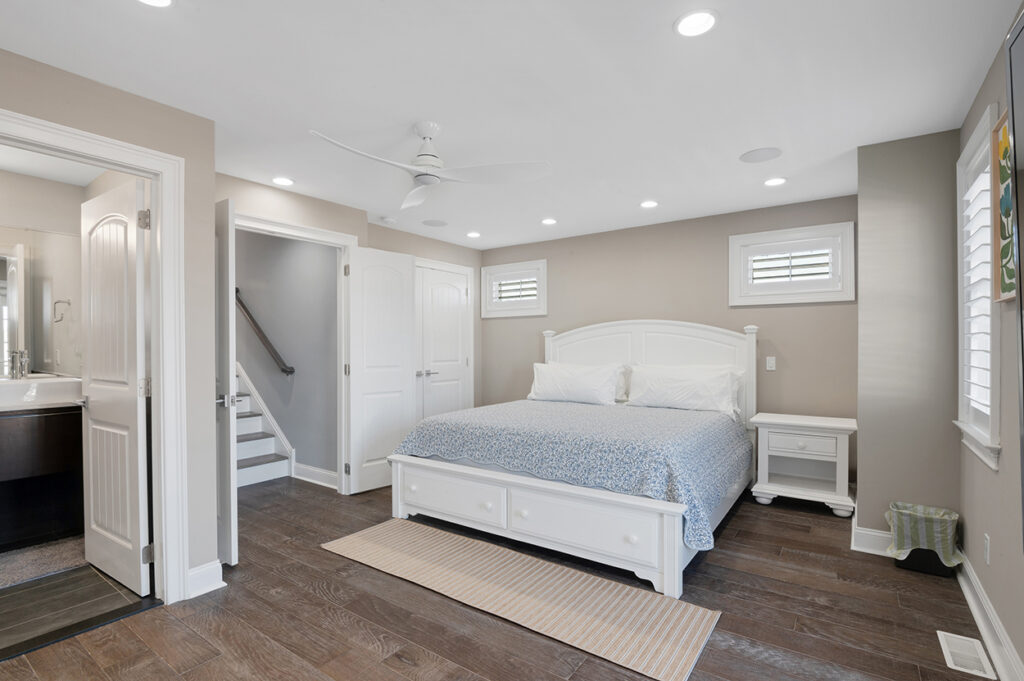 A short flight of stairs leads down to the primary suite, which is entered through French doors. The space includes two closets with double swinging doors, a king-size bed, door to a private west-facing porch and a full bathroom with a dual-sink vanity and tiled shower.
