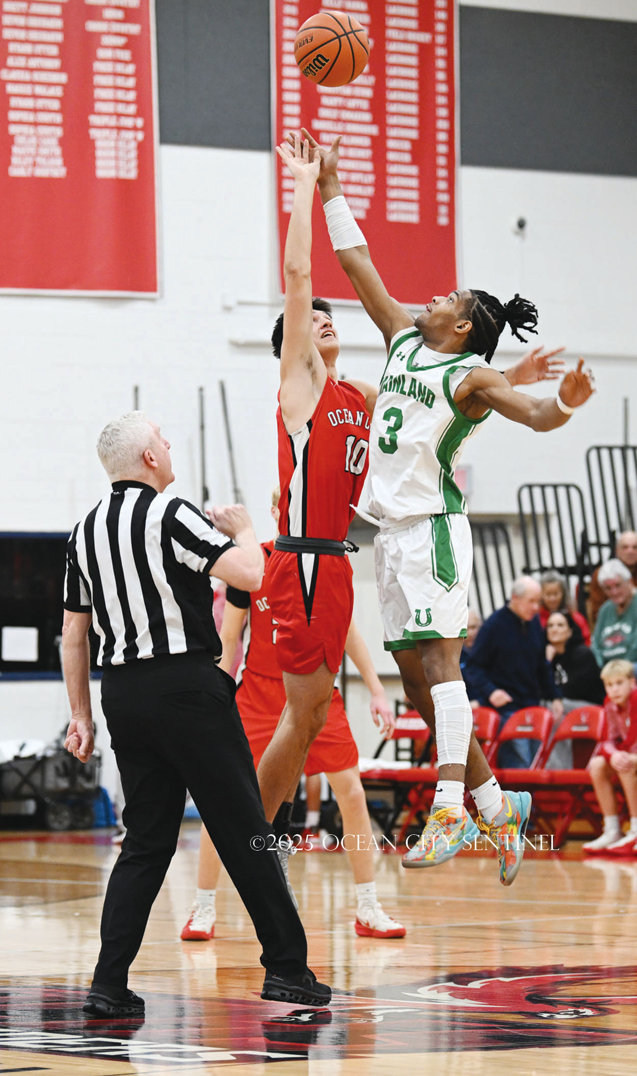 Senior Luke Tjoumakaris scored 23 points, including 17 in the first half, that helped Ocean City keep pace with an energized Mustang squad led by Cole Stefano. Stefano finished with 16 points and a trio of three-pointers. The junior gave Mainland the lead after he hit a buzzer-beating half-court shot to end the first quarter.