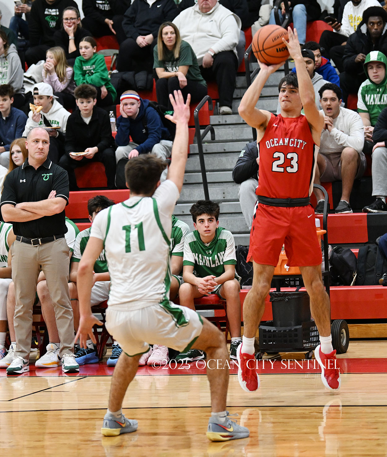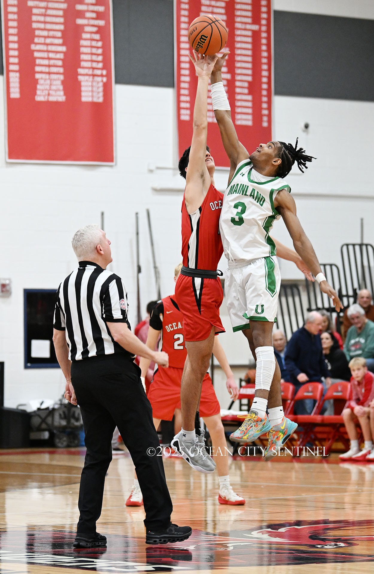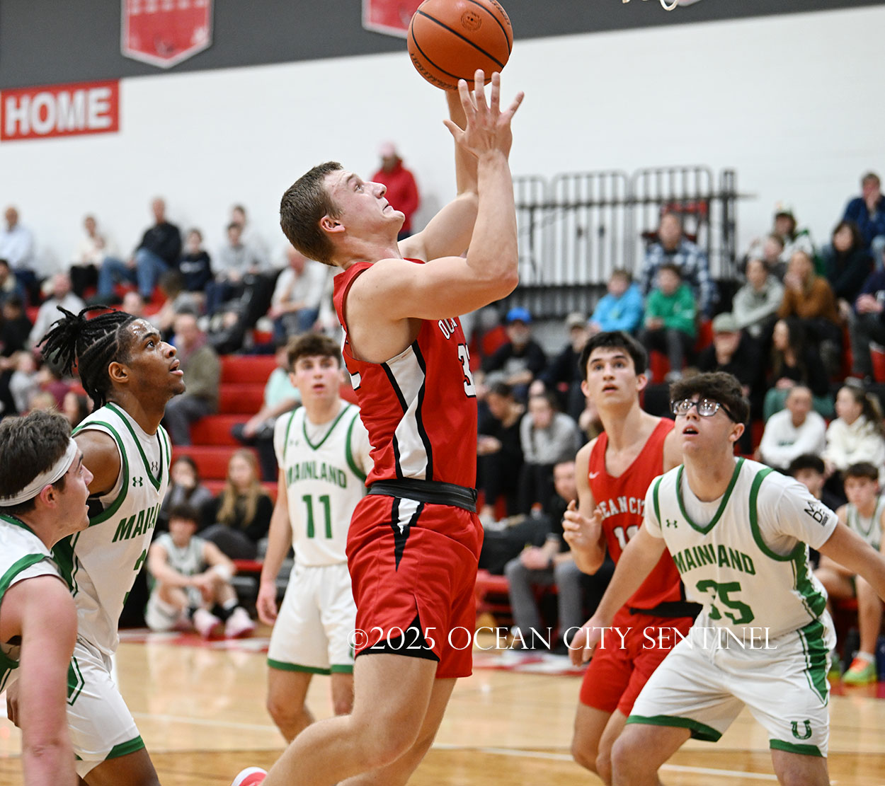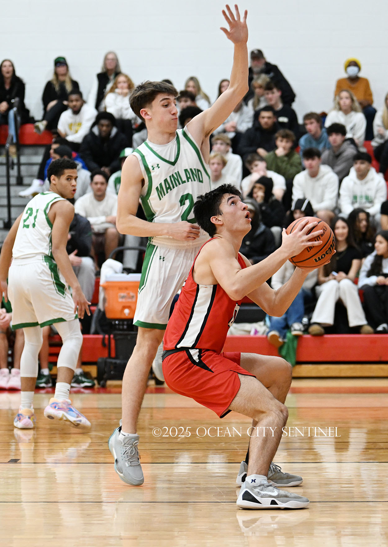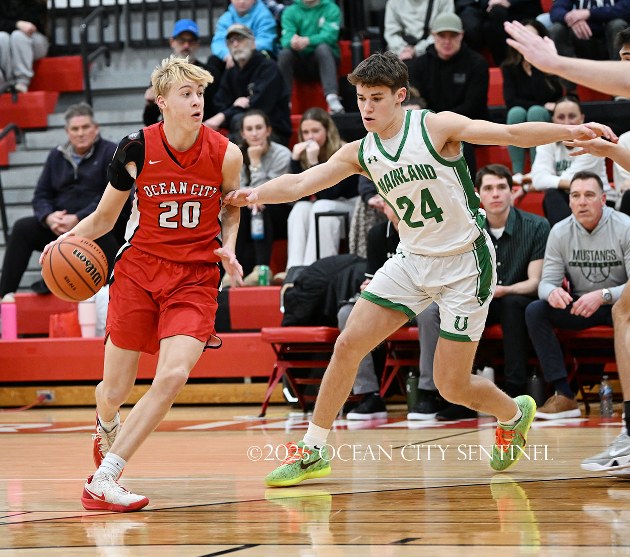 Senior Luke Tjoumakaris scored 23 points, including 17 in the first half, that helped Ocean City keep pace with an energized Mustang squad led by Cole Stefano. Stefano finished with 16 points and a trio of three-pointers. The junior gave Mainland the lead after he hit a buzzer-beating half-court shot to end the first quarter.