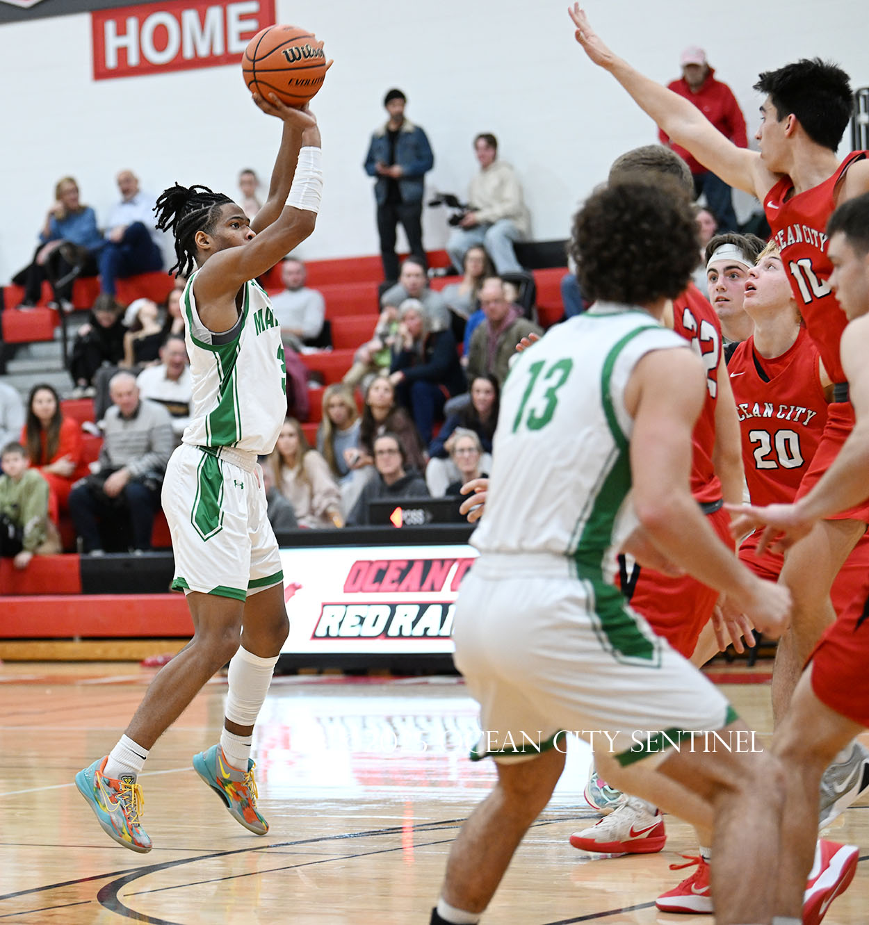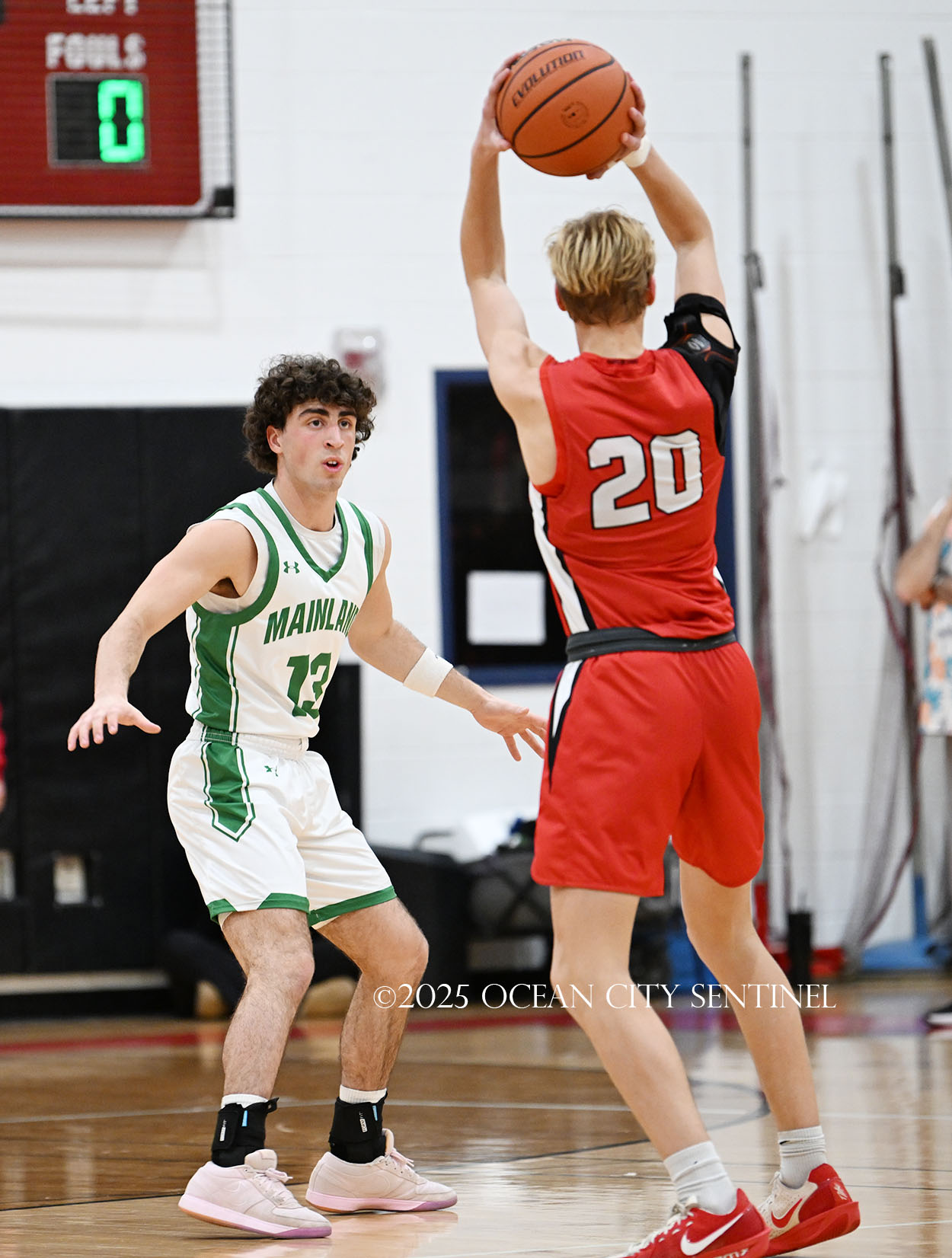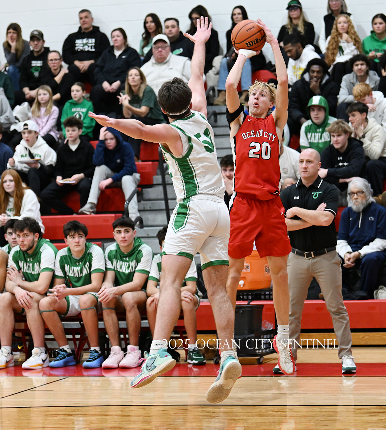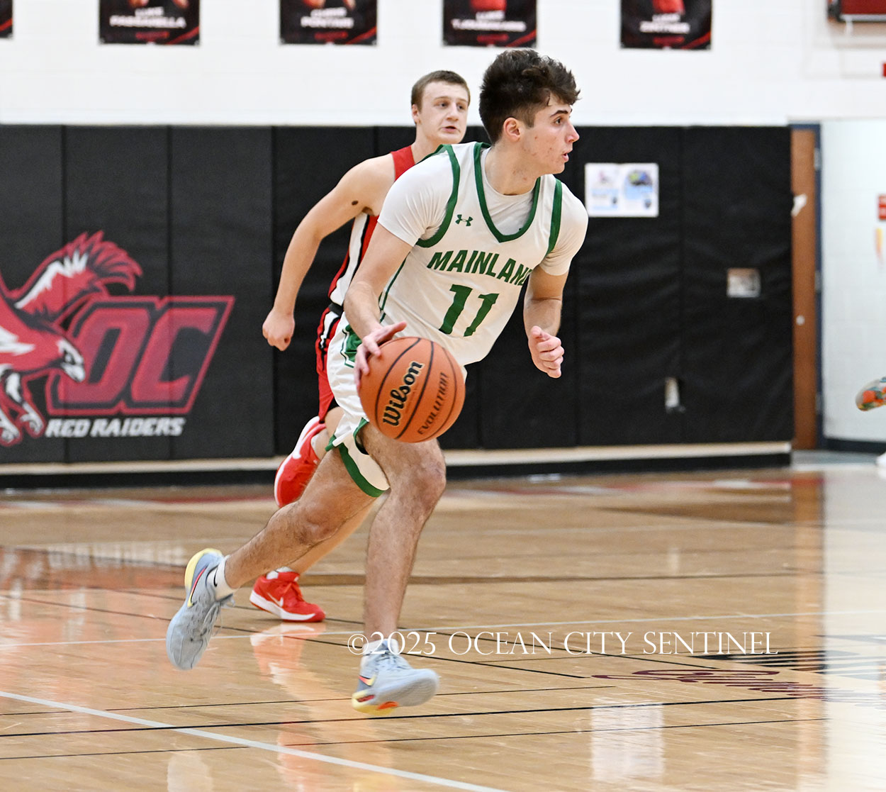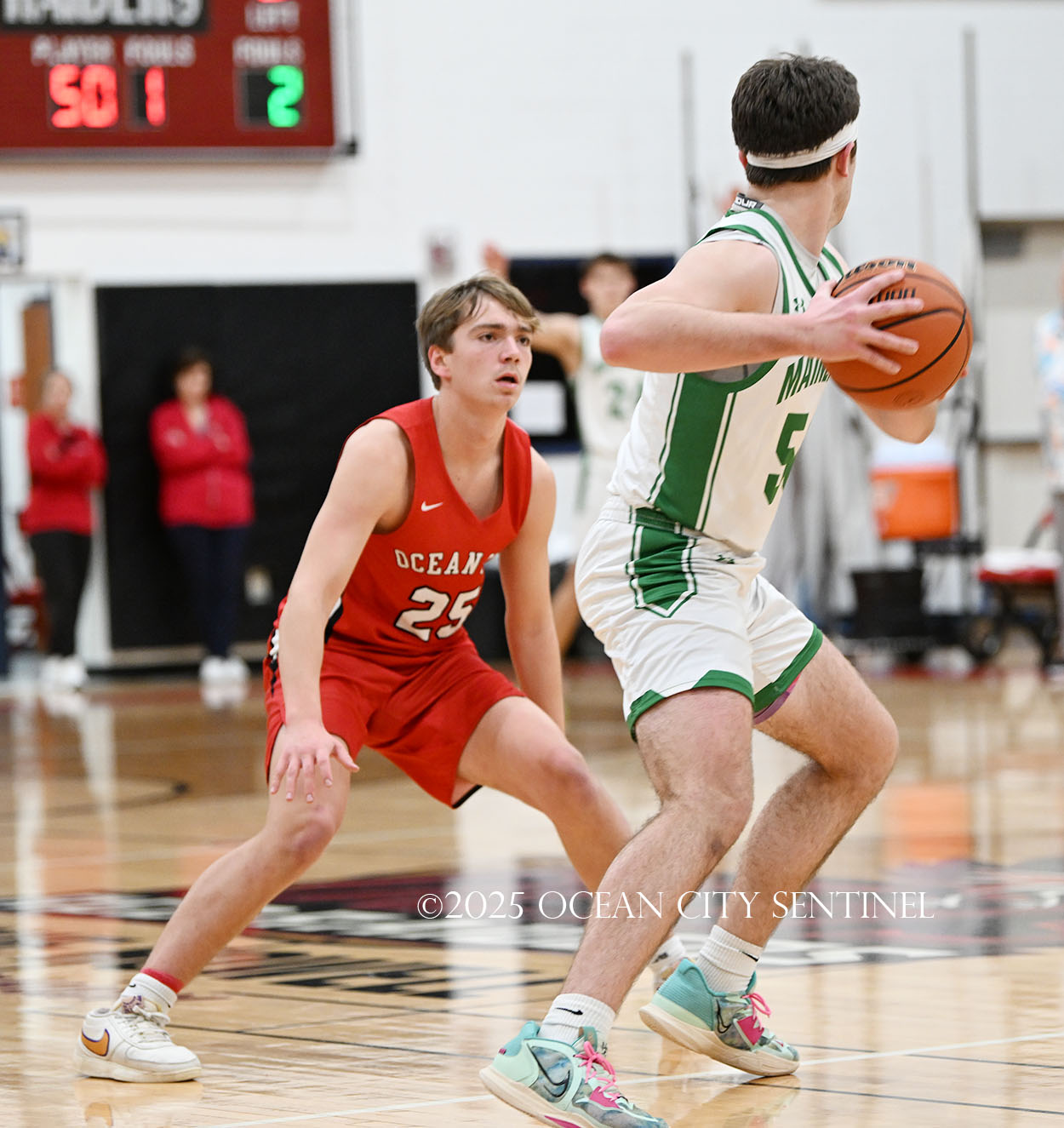 Senior Luke Tjoumakaris scored 23 points, including 17 in the first half, that helped Ocean City keep pace with an energized Mustang squad led by Cole Stefano. Stefano finished with 16 points and a trio of three-pointers. The junior gave Mainland the lead after he hit a buzzer-beating half-court shot to end the first quarter.