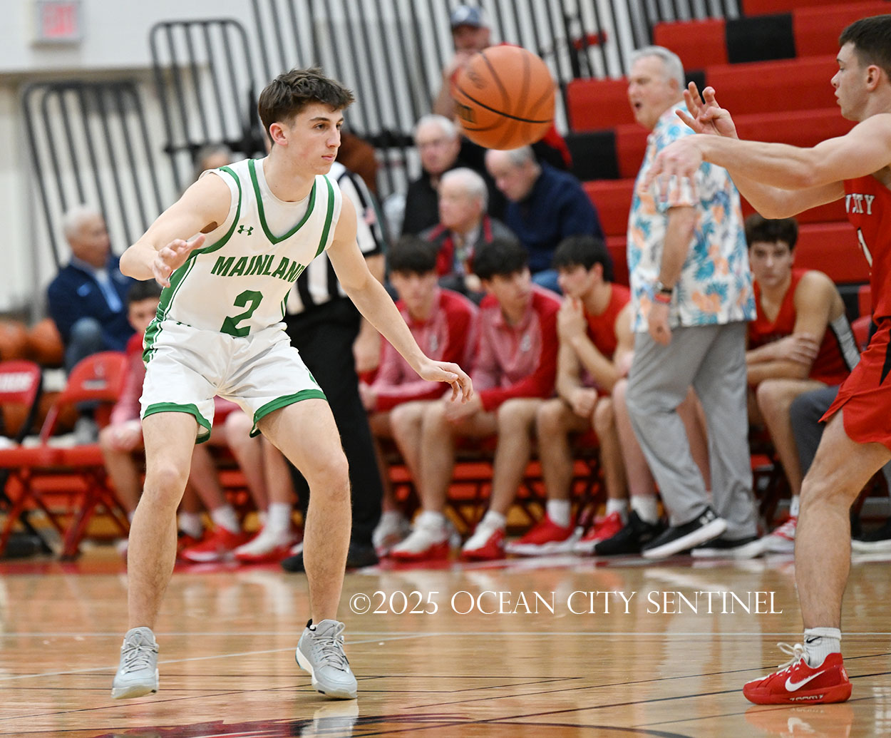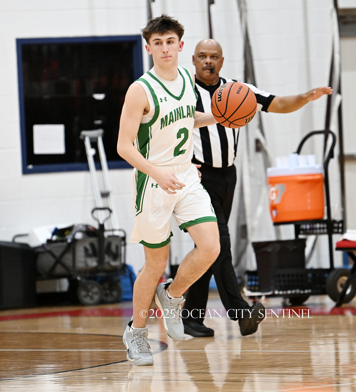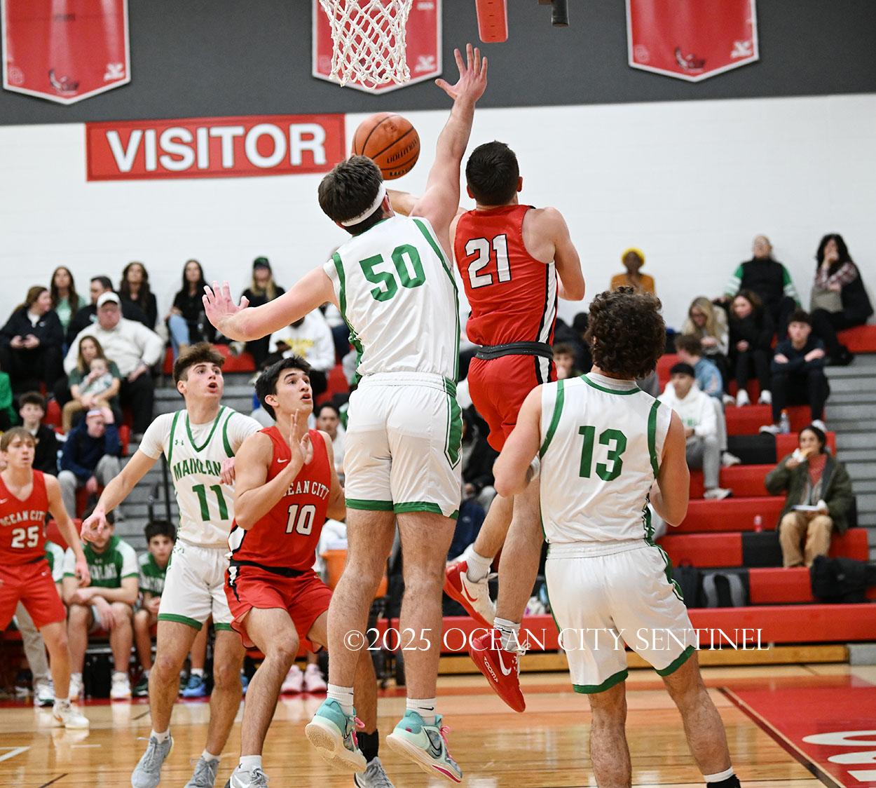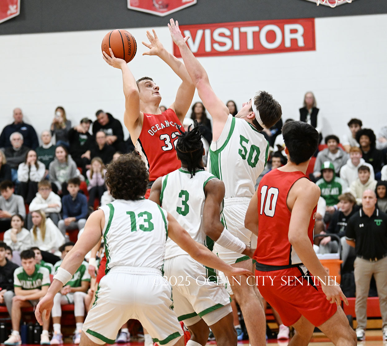 Senior Luke Tjoumakaris scored 23 points, including 17 in the first half, that helped Ocean City keep pace with an energized Mustang squad led by Cole Stefano. Stefano finished with 16 points and a trio of three-pointers. The junior gave Mainland the lead after he hit a buzzer-beating half-court shot to end the first quarter.