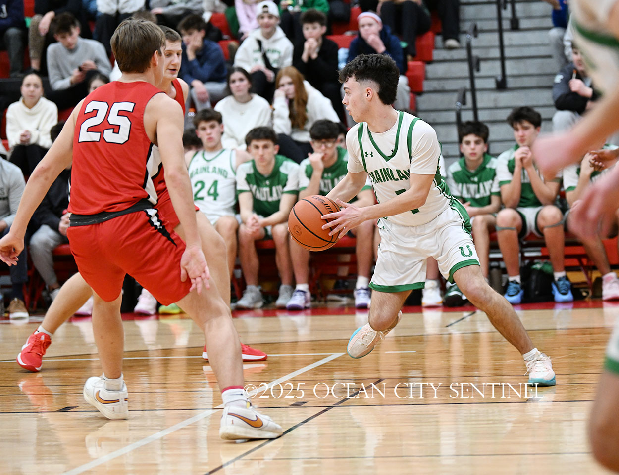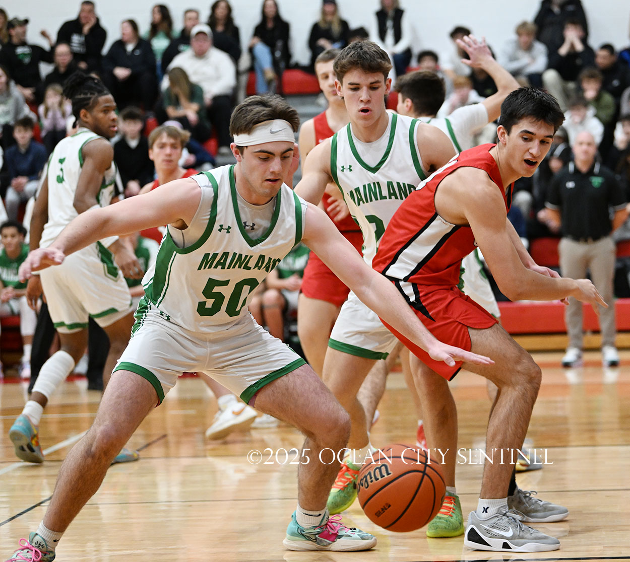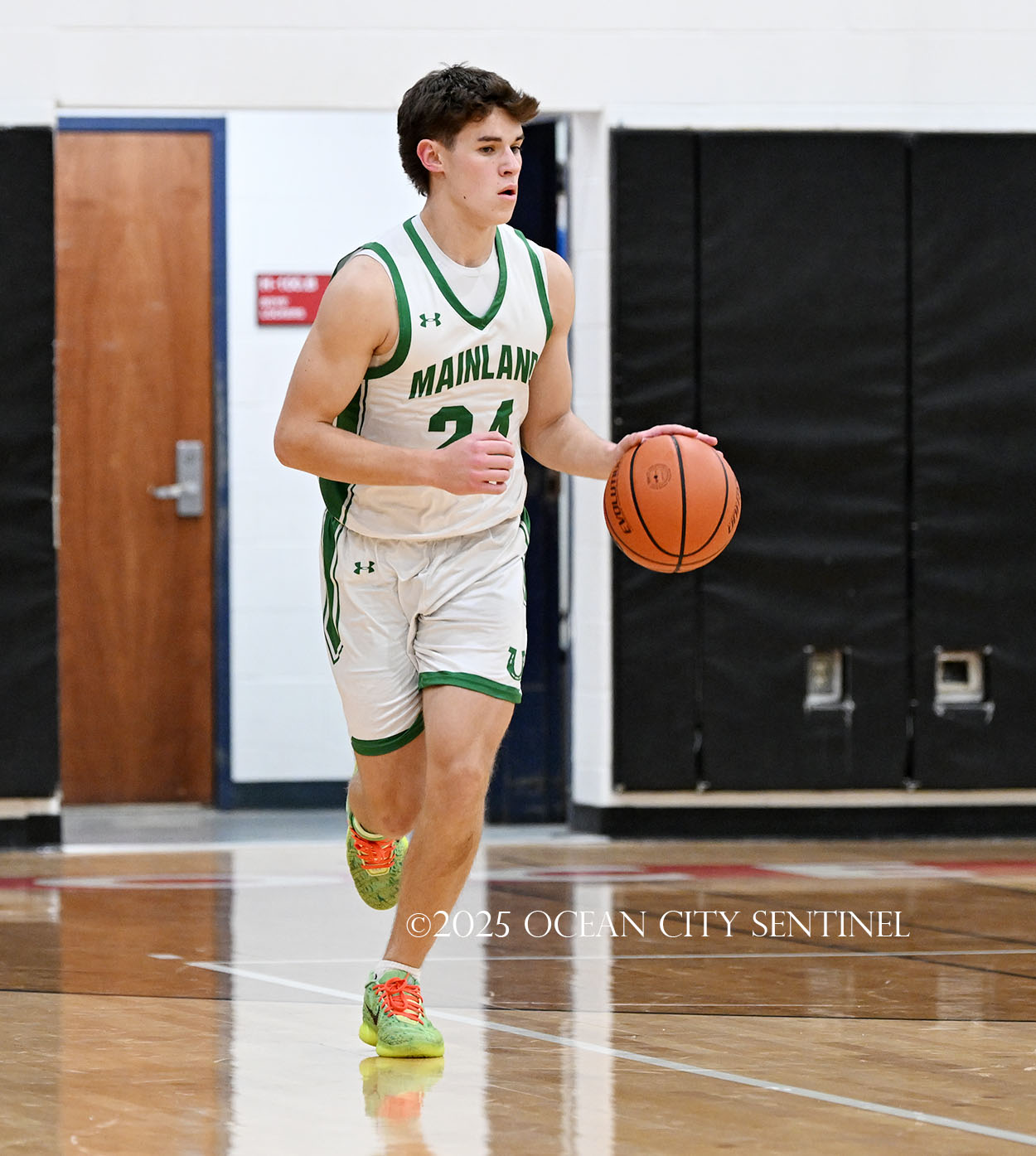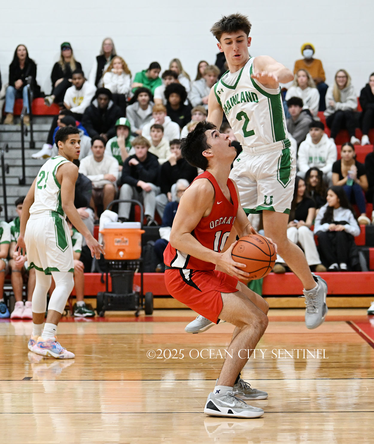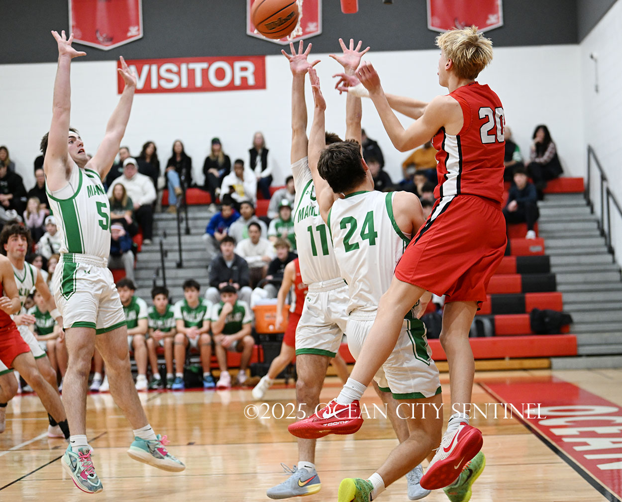 Senior Luke Tjoumakaris scored 23 points, including 17 in the first half, that helped Ocean City keep pace with an energized Mustang squad led by Cole Stefano. Stefano finished with 16 points and a trio of three-pointers. The junior gave Mainland the lead after he hit a buzzer-beating half-court shot to end the first quarter.