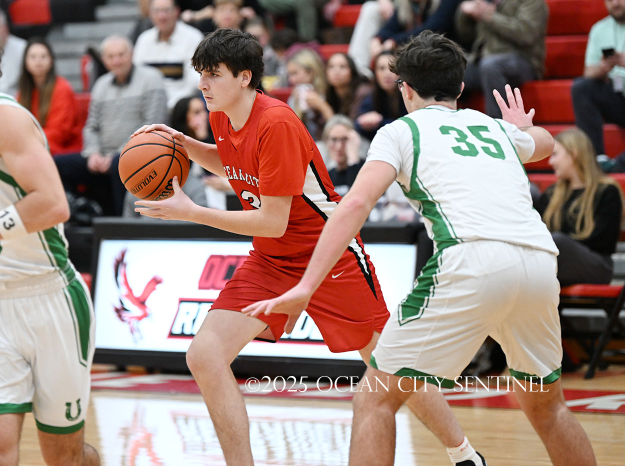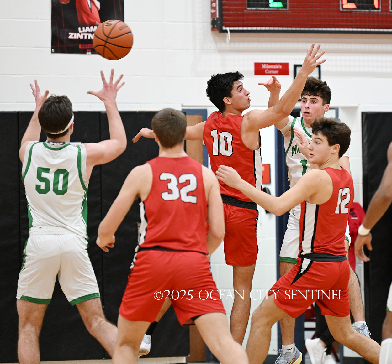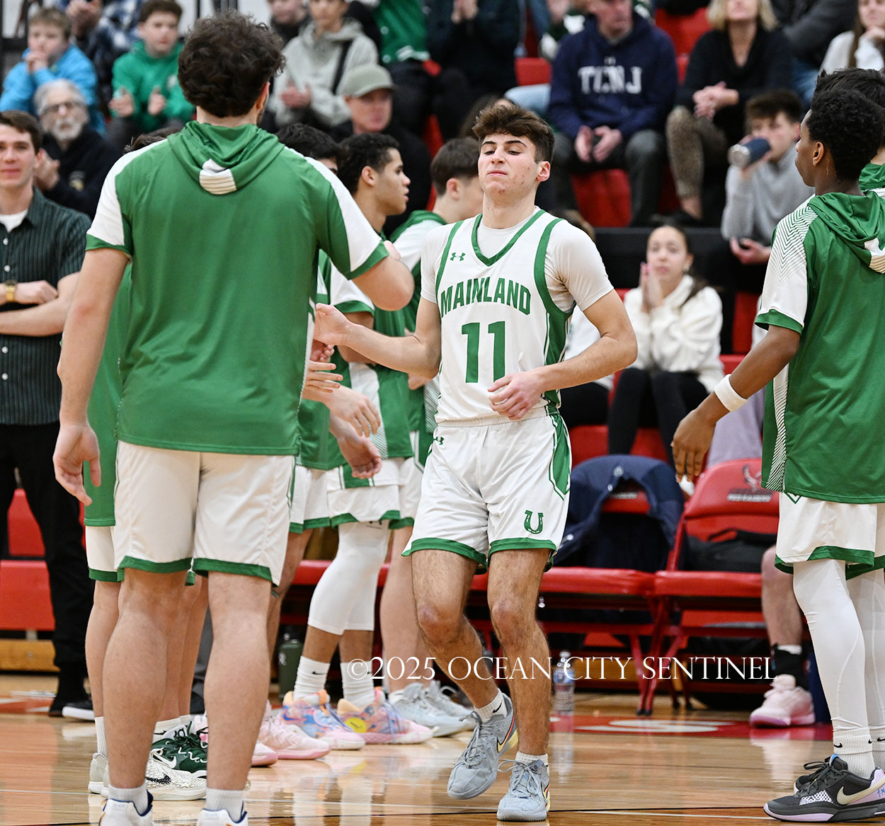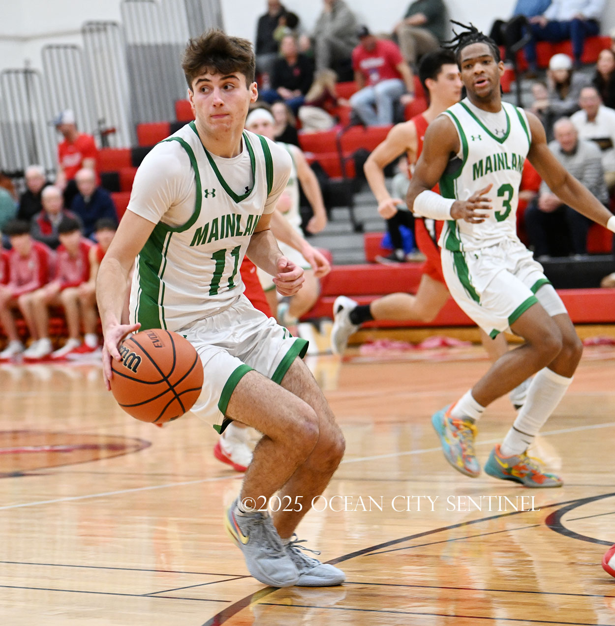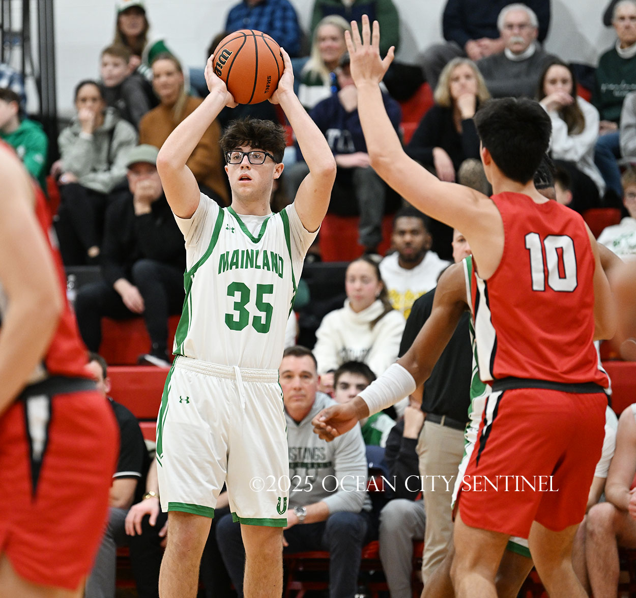 Senior Luke Tjoumakaris scored 23 points, including 17 in the first half, that helped Ocean City keep pace with an energized Mustang squad led by Cole Stefano. Stefano finished with 16 points and a trio of three-pointers. The junior gave Mainland the lead after he hit a buzzer-beating half-court shot to end the first quarter.