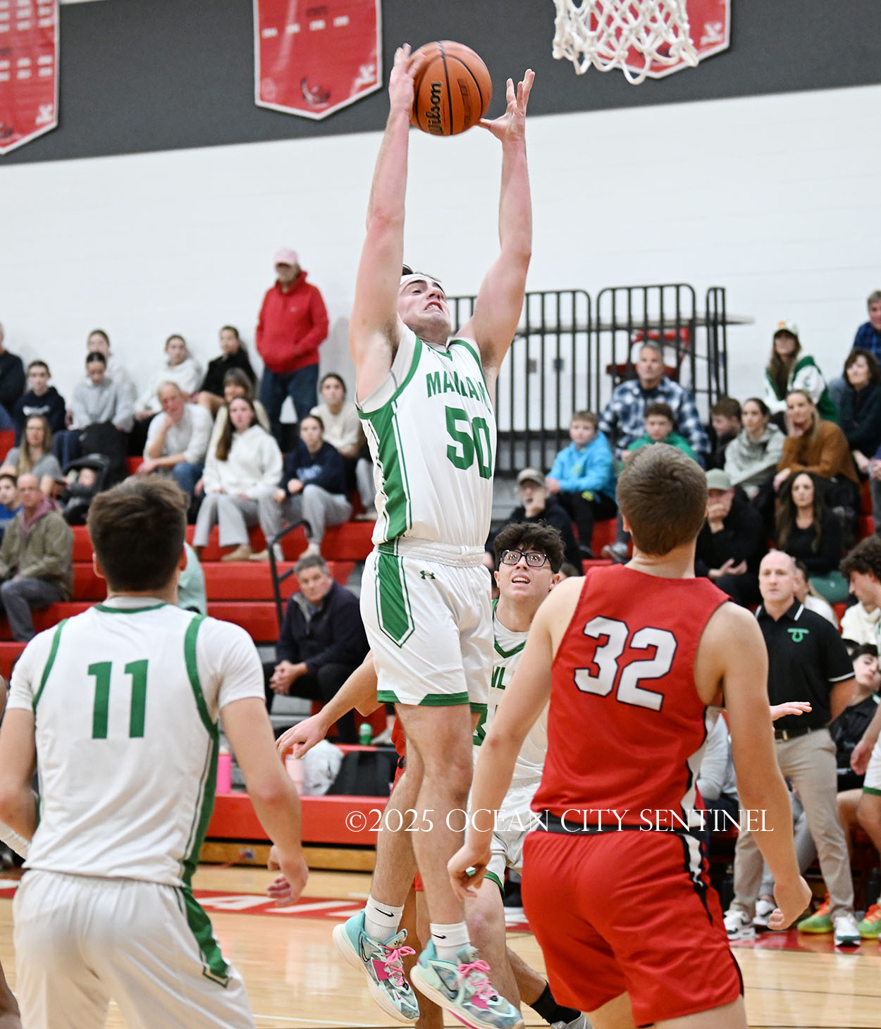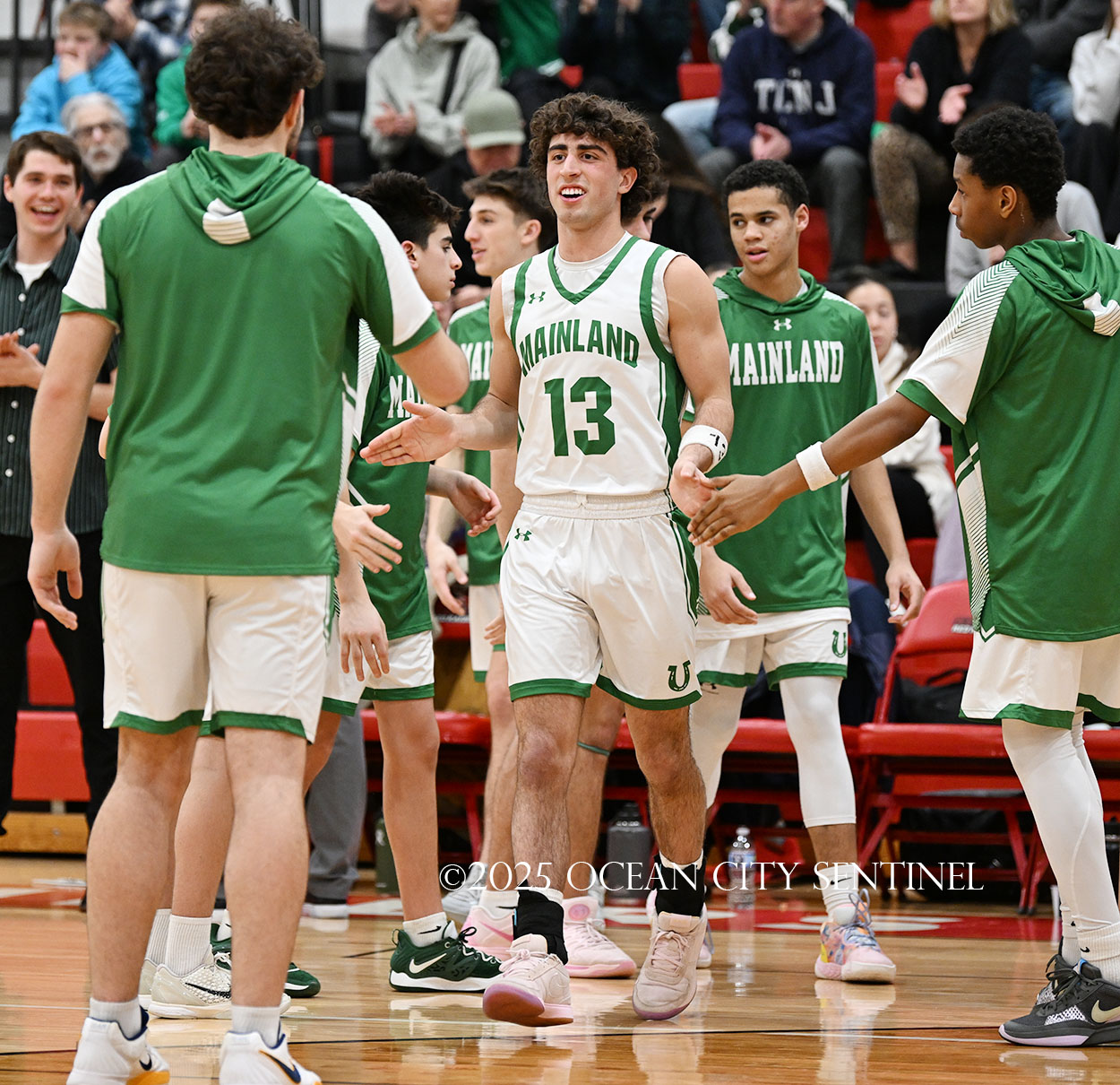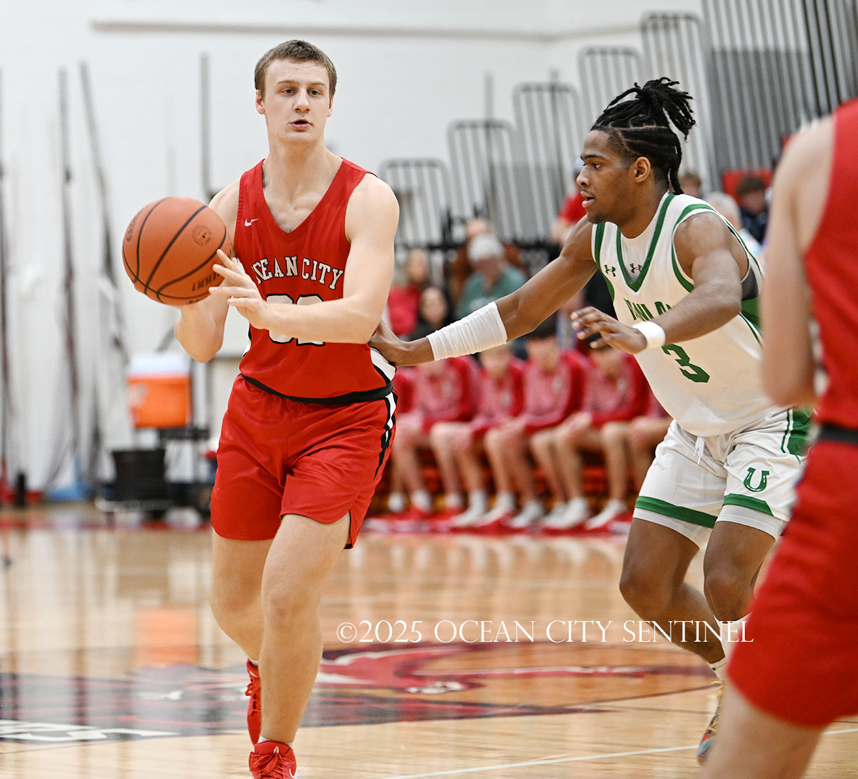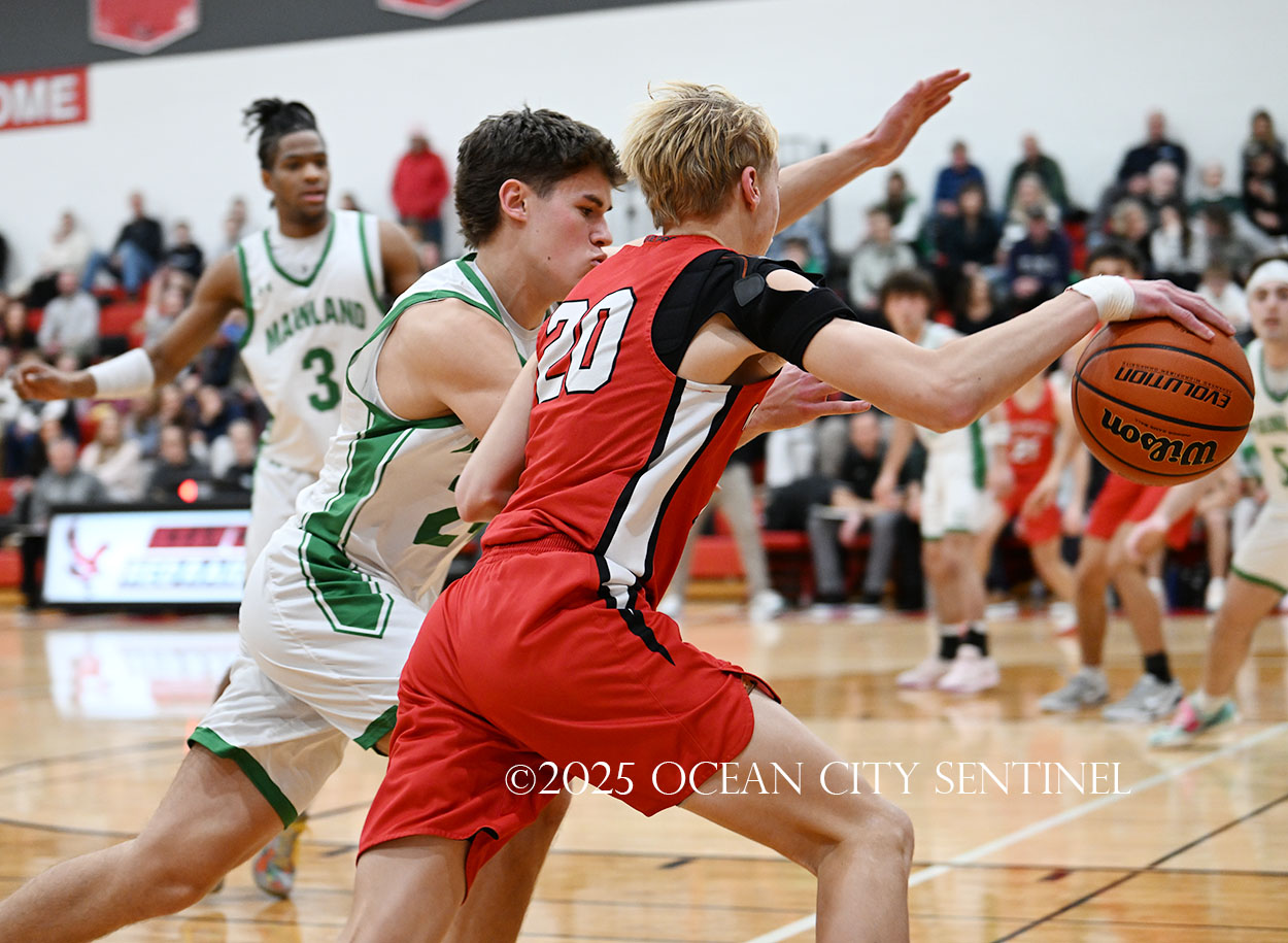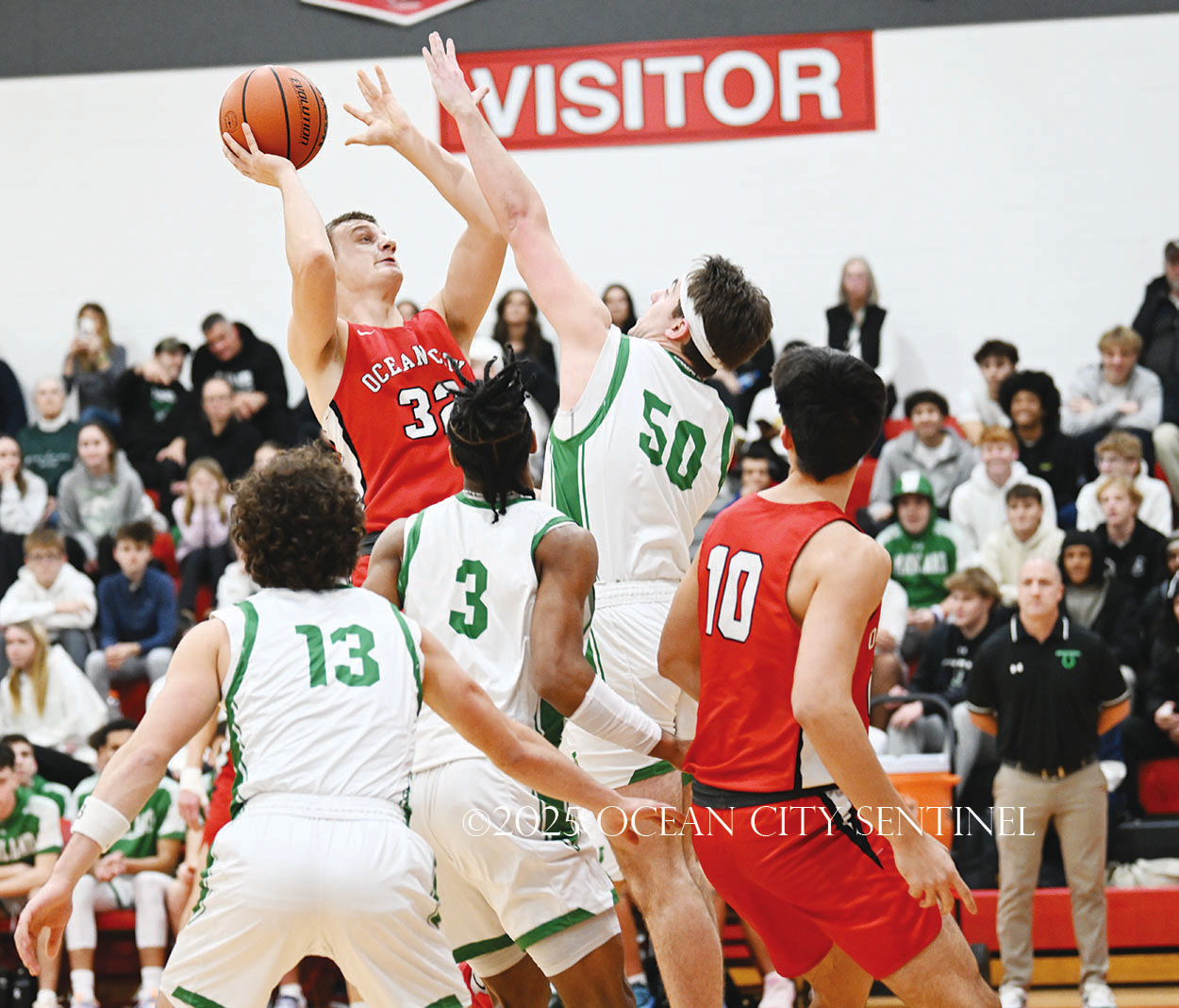 Senior Luke Tjoumakaris scored 23 points, including 17 in the first half, that helped Ocean City keep pace with an energized Mustang squad led by Cole Stefano. Stefano finished with 16 points and a trio of three-pointers. The junior gave Mainland the lead after he hit a buzzer-beating half-court shot to end the first quarter.