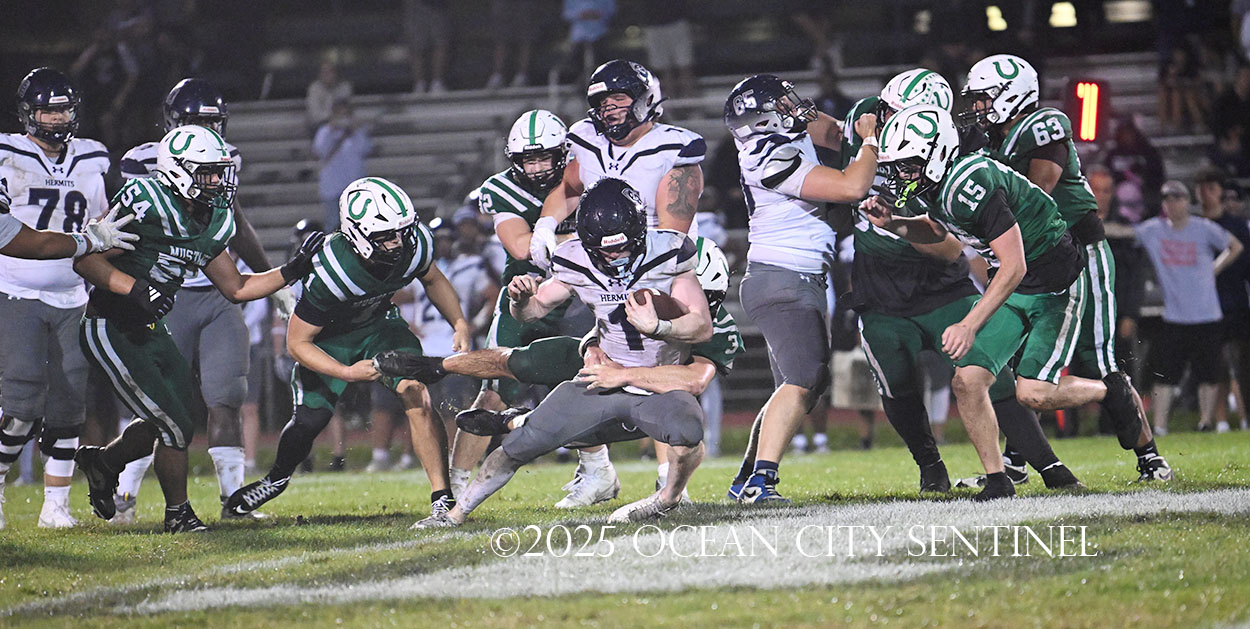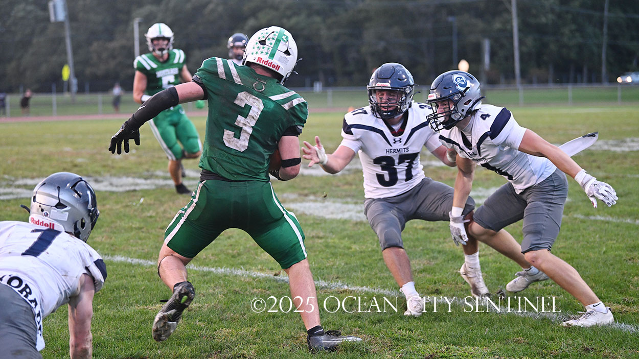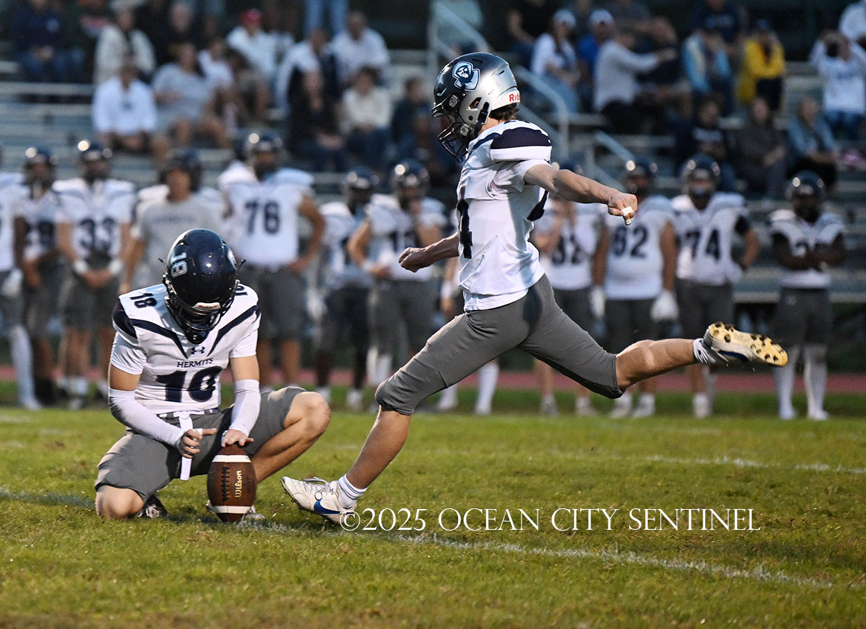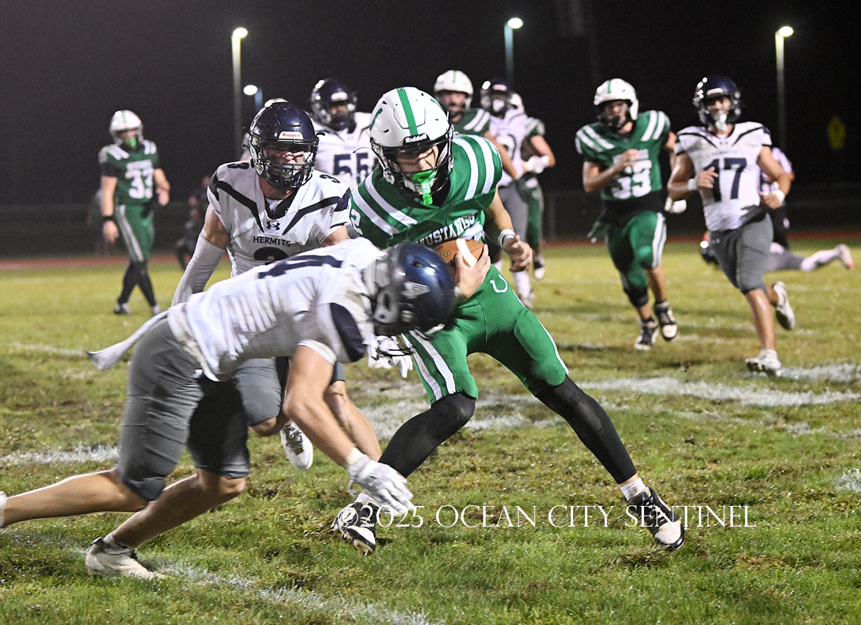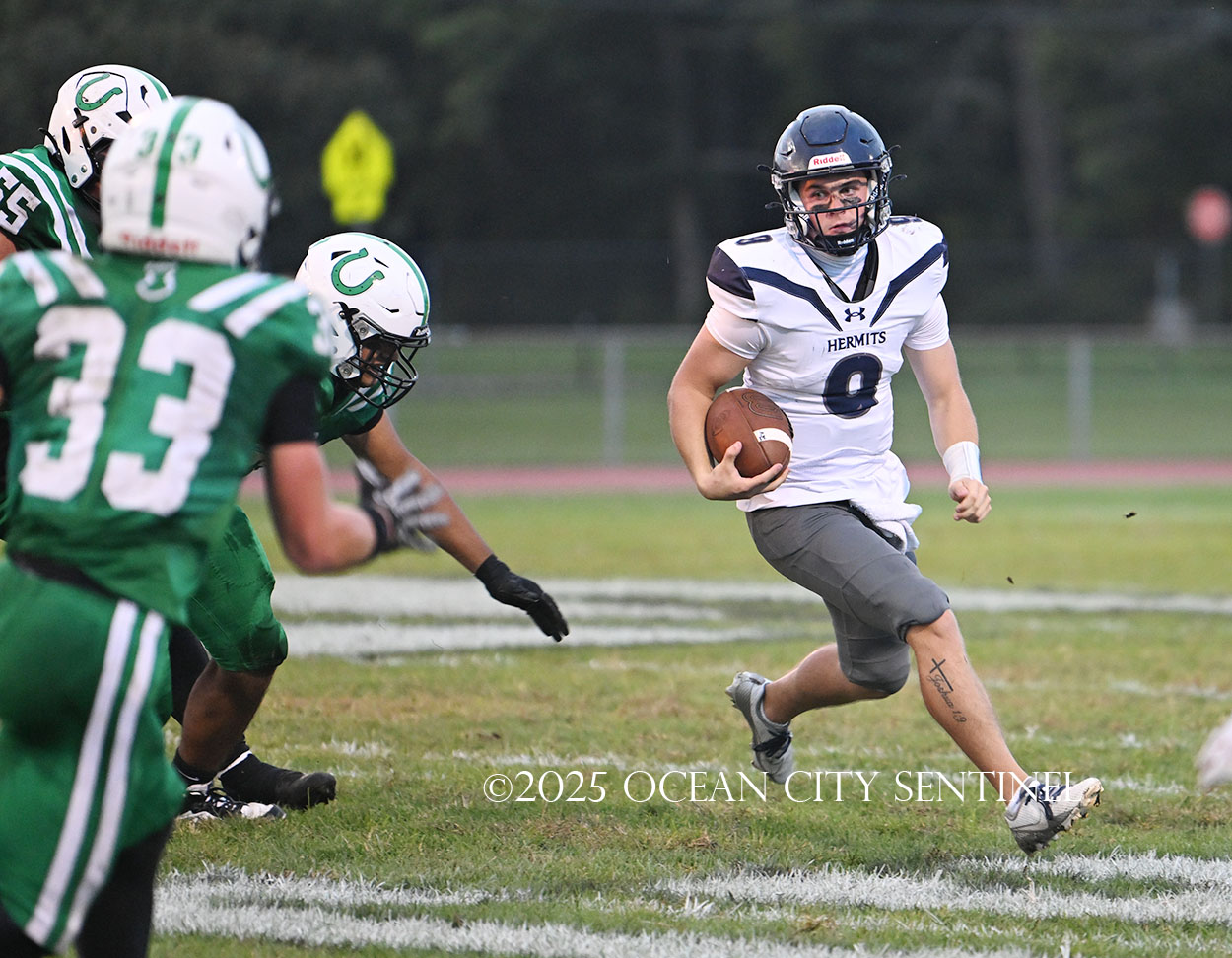 But the drive stalled due to a dropped ball and an incomplete pass, forcing a punt. The snap flew over the head of punter Nate Kashey and the Hermits recovered at Mainland’s 35-yard line.