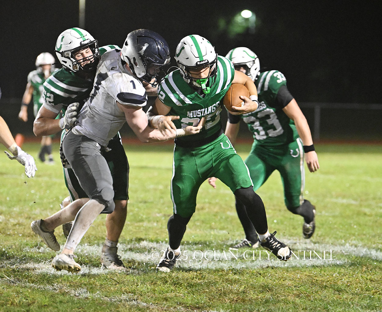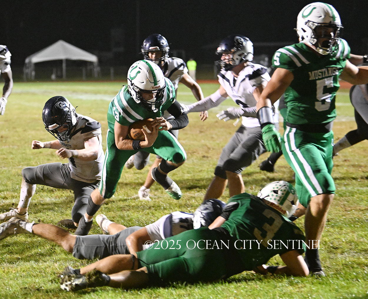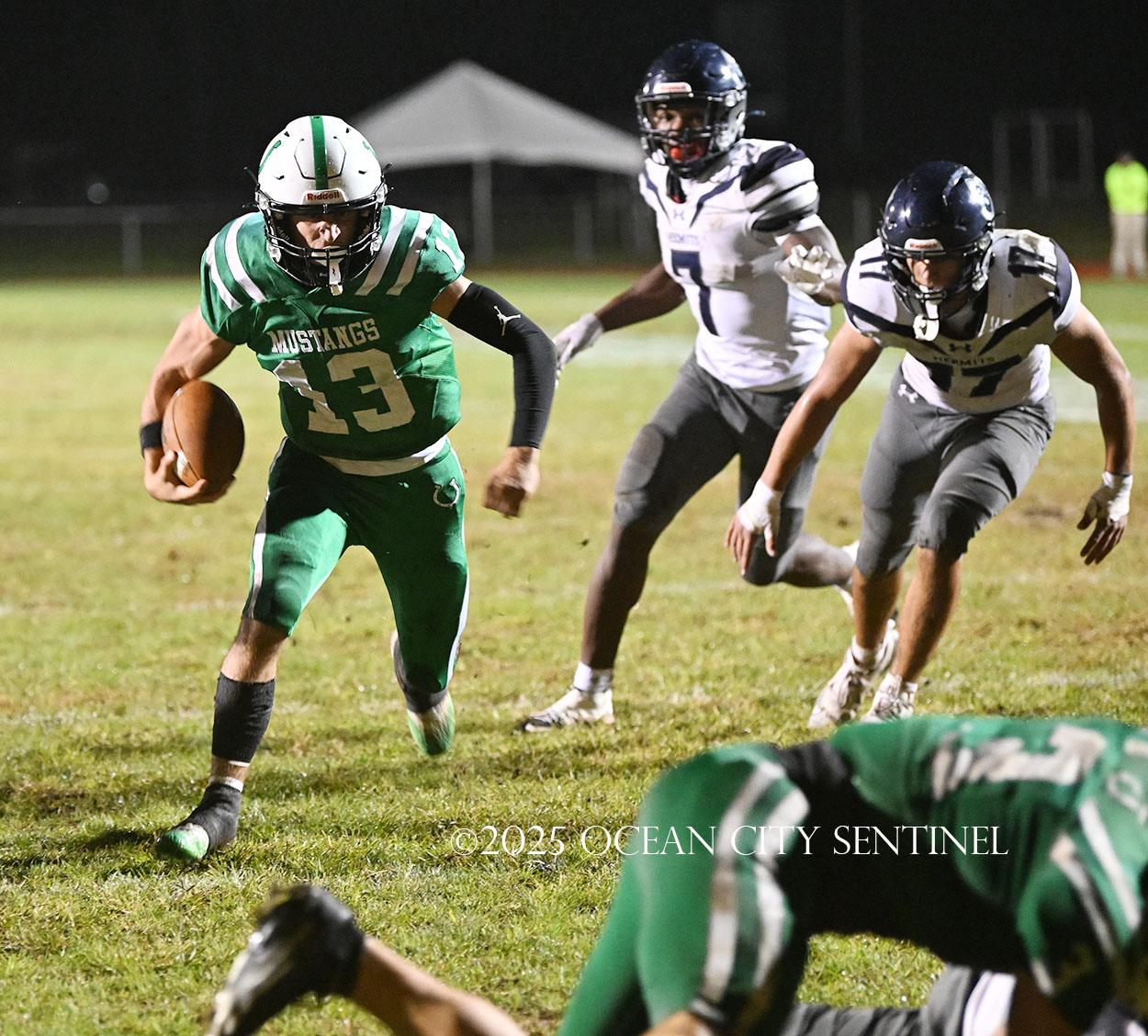 Starting from their 20, the Hermits moved forward 27 yards on a McLeer run. On 3rd and 9 from Mainland’s 44, the defense was called for holding, moving St. Augustine to the 34. Chirico picked up a couple of first downs running to move the ball to the 10-yard line and an encroachment call moved it to the 5, but that’s where the Mustang defense dodged another bullet.