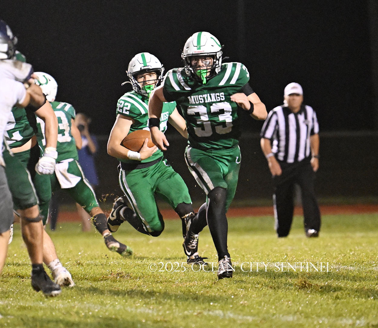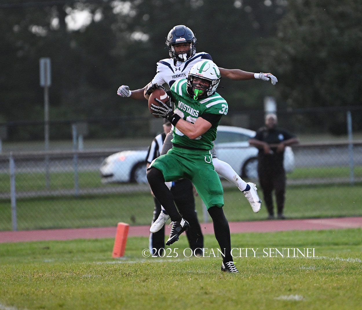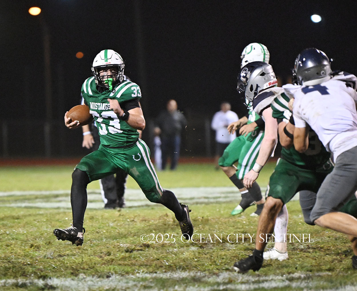 Starting from their 20, the Hermits moved forward 27 yards on a McLeer run. On 3rd and 9 from Mainland’s 44, the defense was called for holding, moving St. Augustine to the 34. Chirico picked up a couple of first downs running to move the ball to the 10-yard line and an encroachment call moved it to the 5, but that’s where the Mustang defense dodged another bullet.