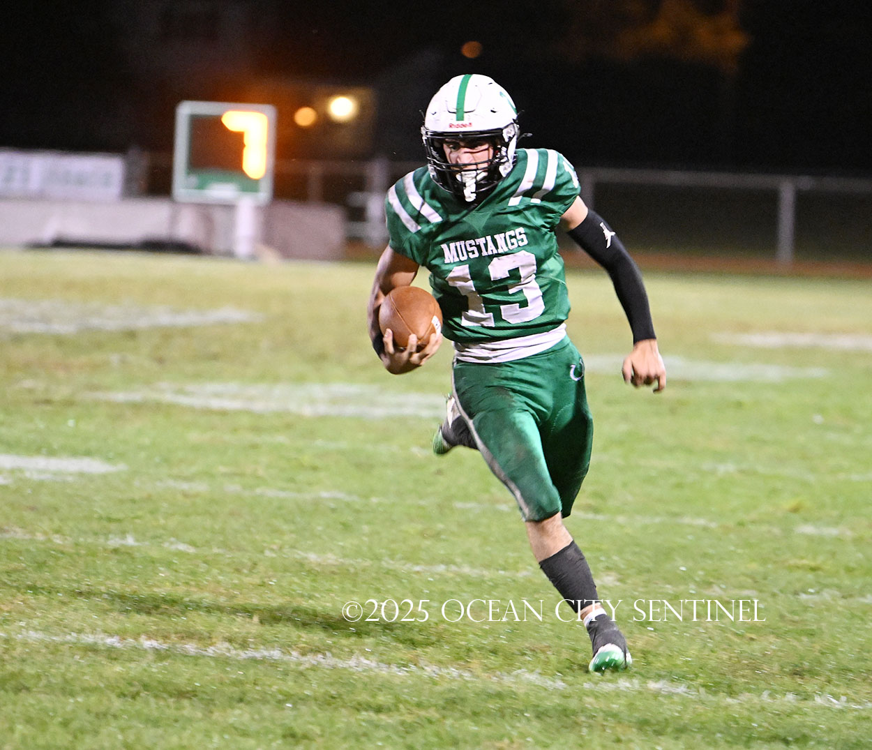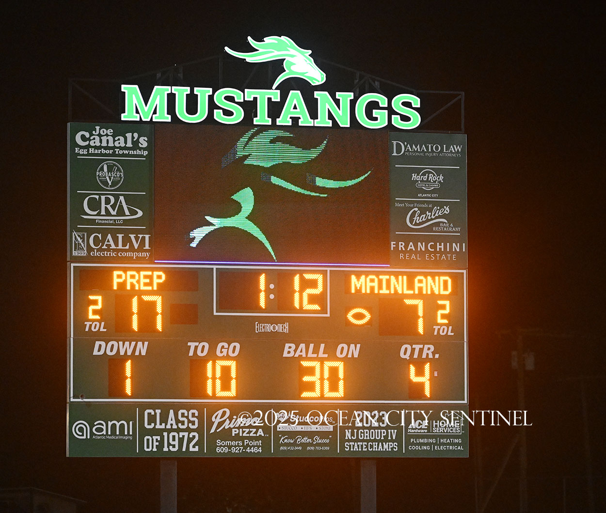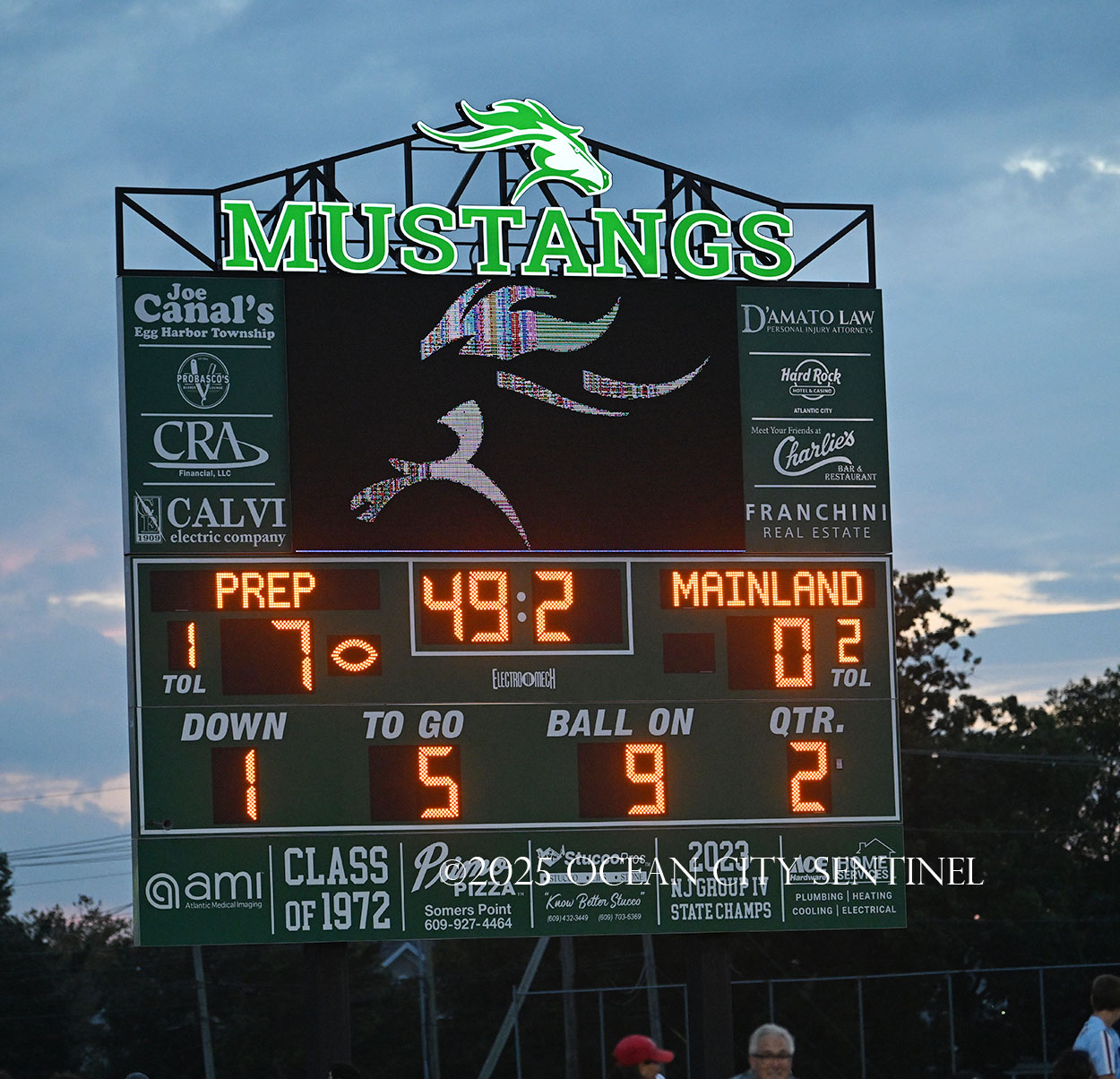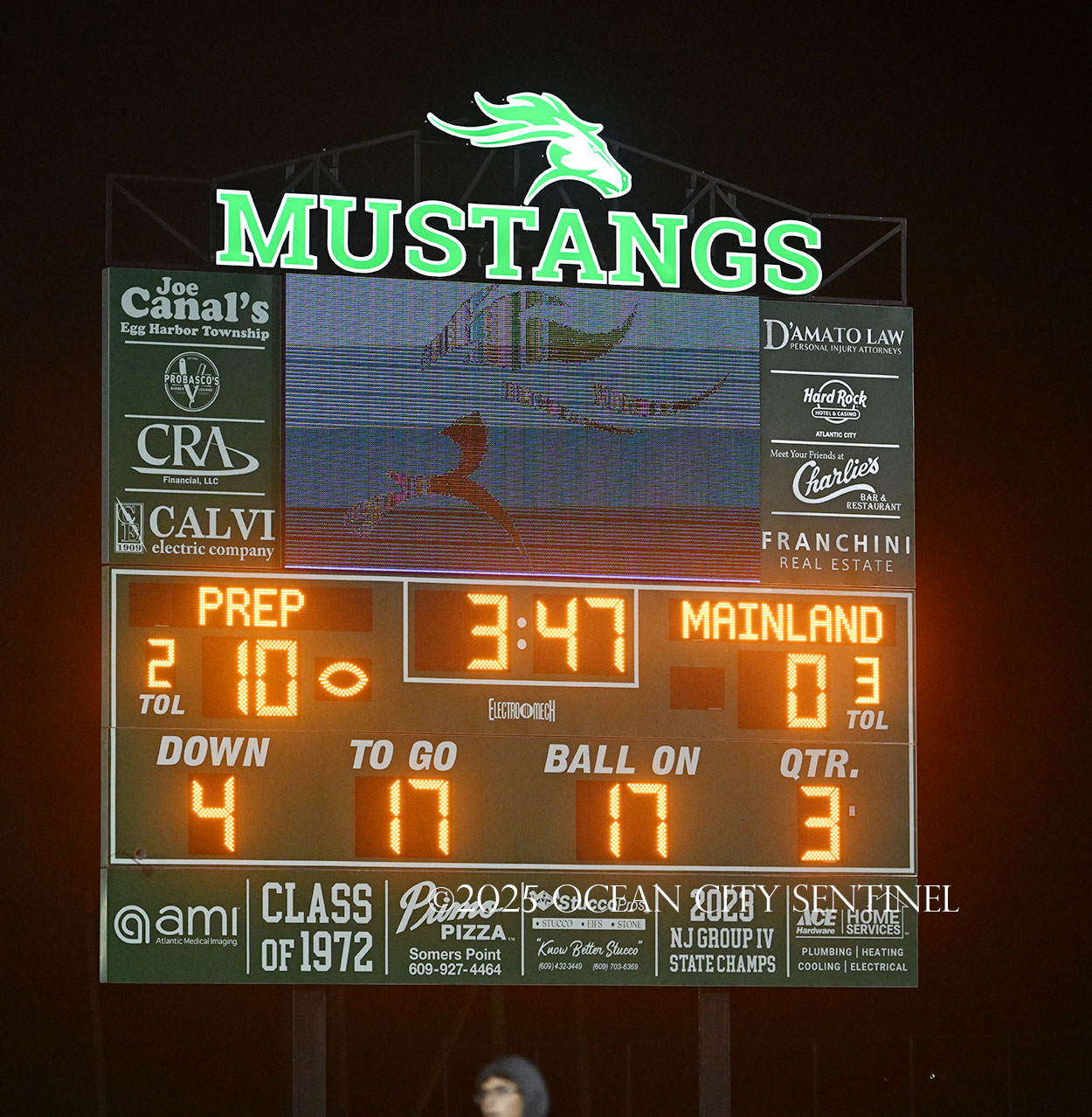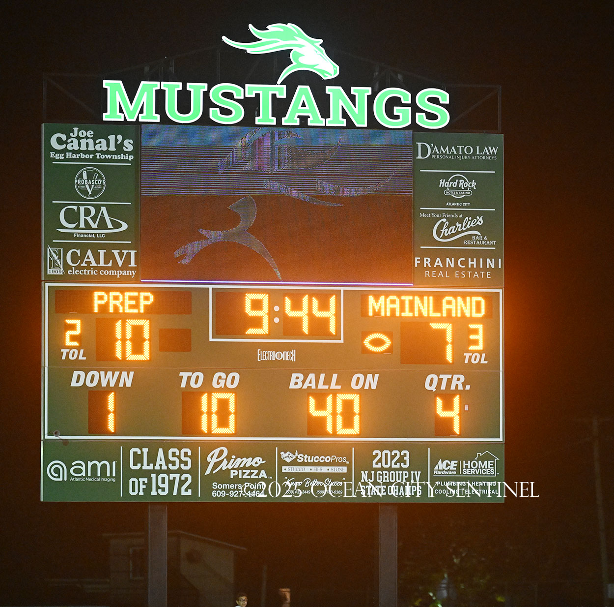 Mainland battled back after Hoag fielded the short kickoff out to the 43. Franchini picked up 14 on the ground and DiBiaso another 5. Hoag gained 3 on the ground and 4 through the air to give the Mustangs 1st and 10 from St. Augustine’s 32.