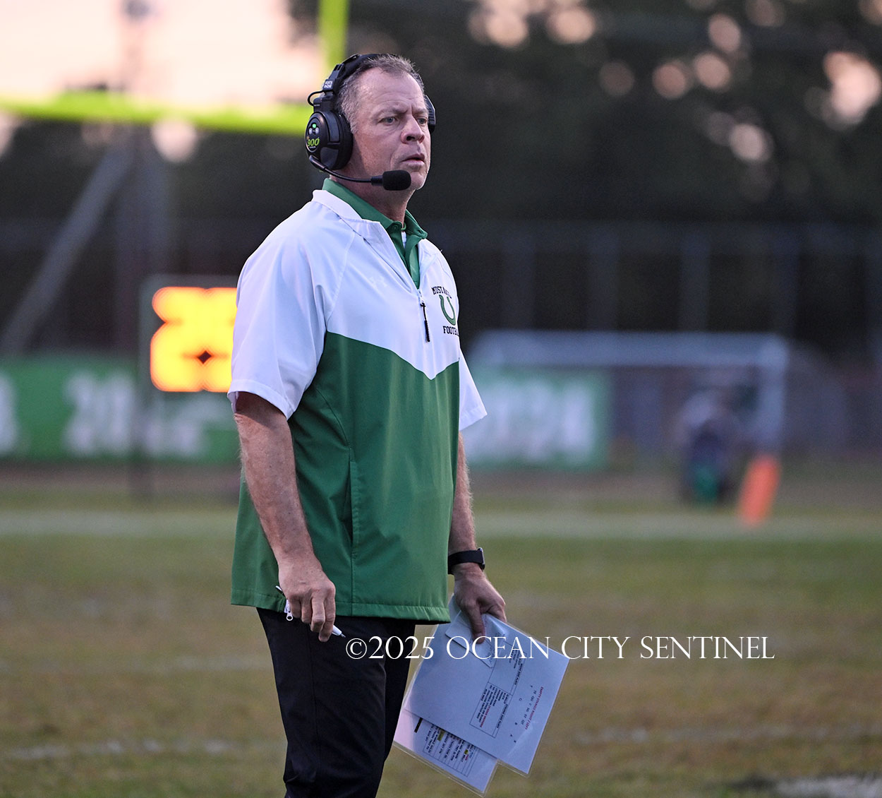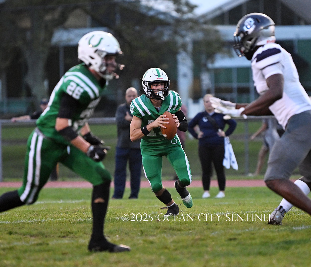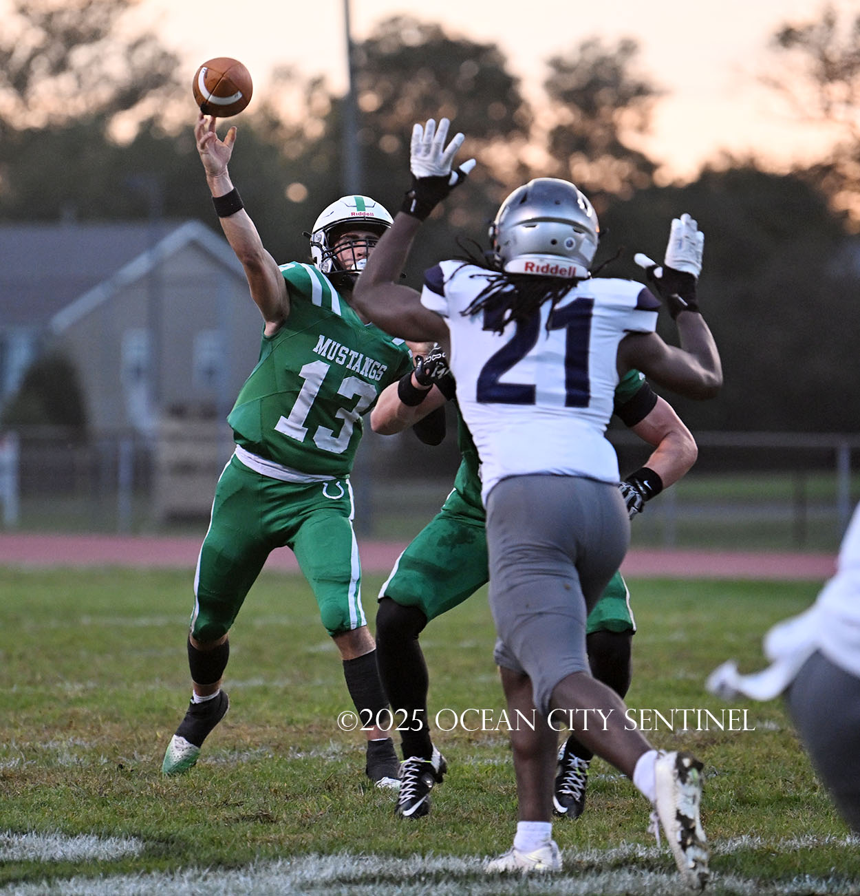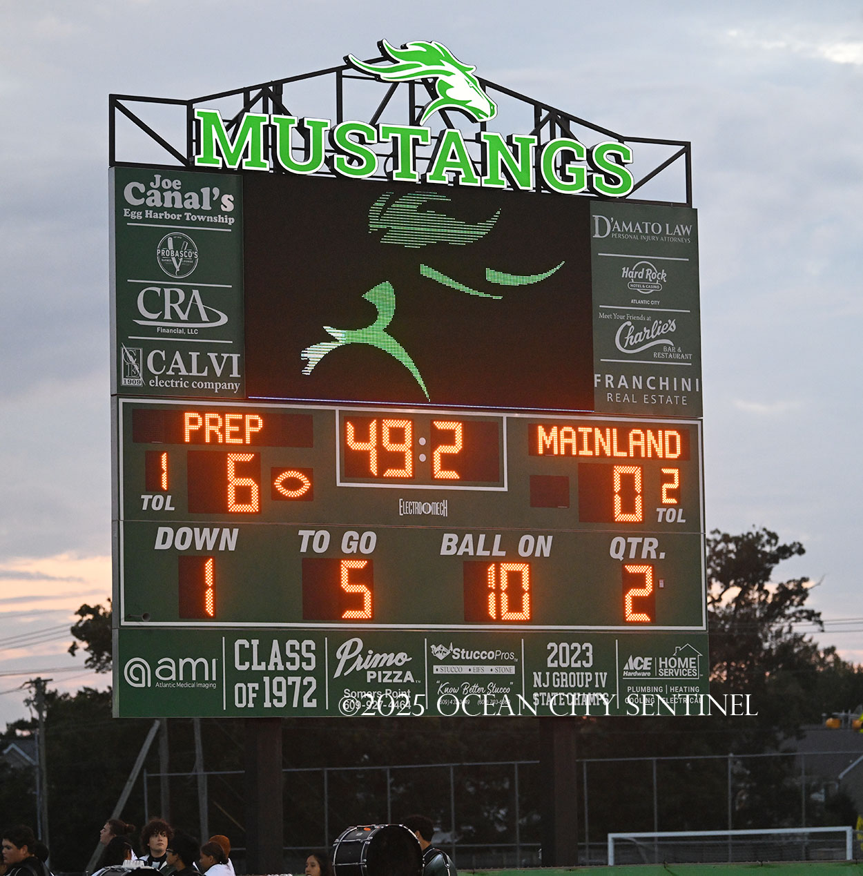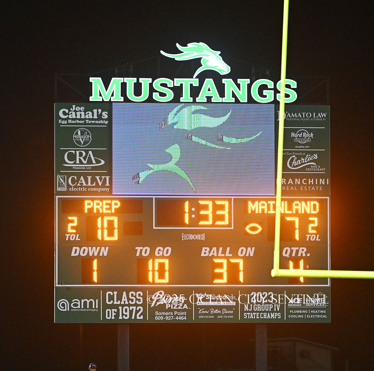 Mainland battled back after Hoag fielded the short kickoff out to the 43. Franchini picked up 14 on the ground and DiBiaso another 5. Hoag gained 3 on the ground and 4 through the air to give the Mustangs 1st and 10 from St. Augustine’s 32.