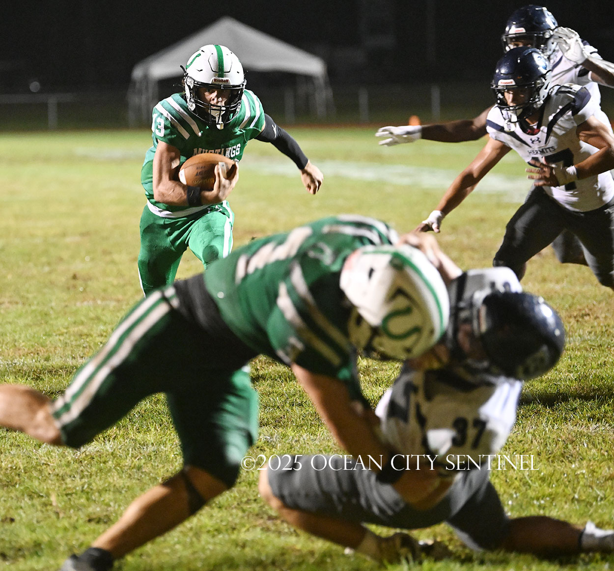 Starting from the 34, Franchini passed to Hoag for a short gain, then picked up 27 yards himself to move the ball to St. Augustine’s 34. A 14-yard pass to Hoag set Mainland up with a 1st and 10 at the 20 with 44 seconds remaining.