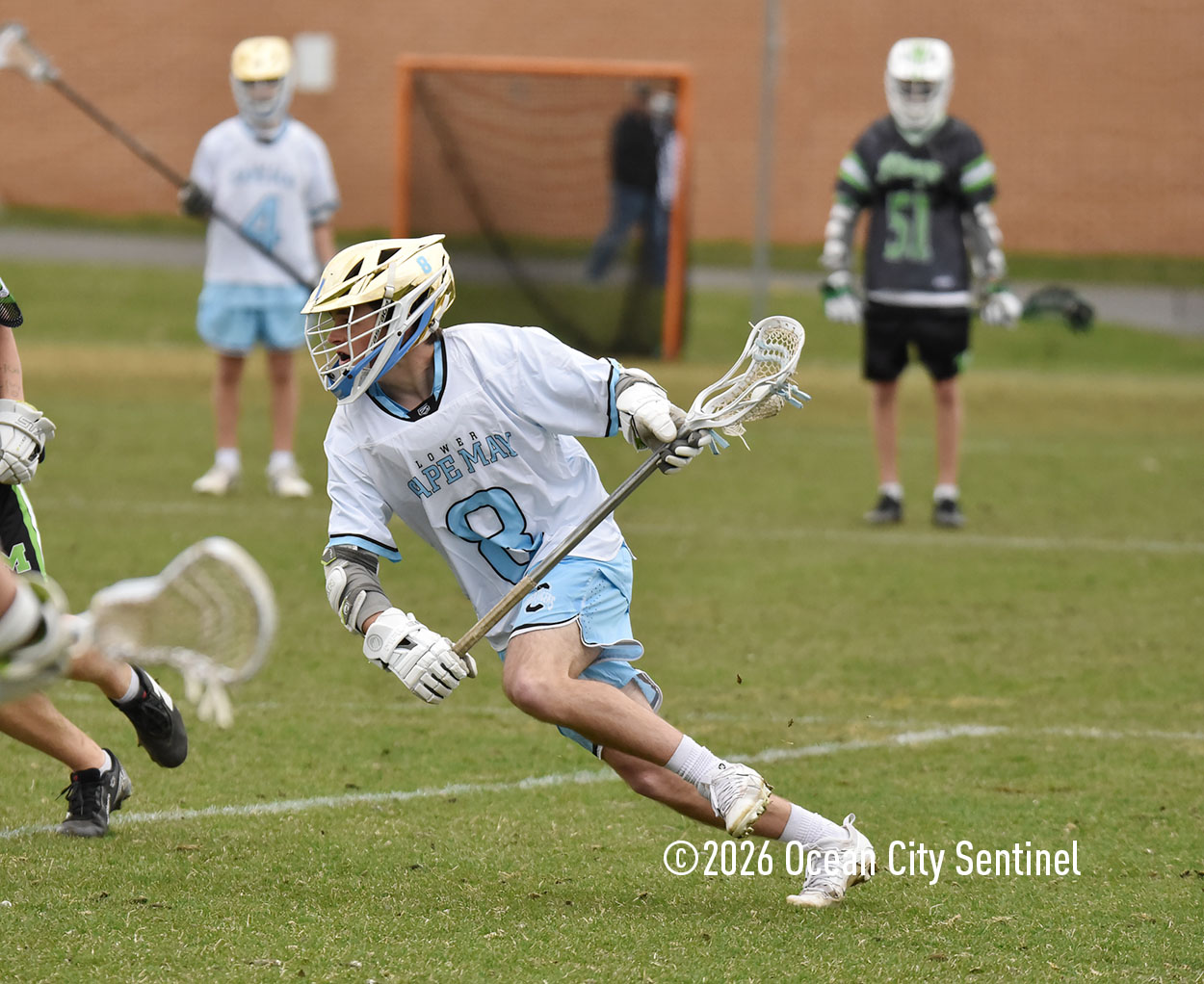Lower was stuck in their defensive end for most of the game but got its first goal of the season from an unlikely defensive player. One of only a few seniors on the team, Ty Bonner put the Caper Tigers on the board to start the second quarter. In his third season as Lower Cape May Regional High School’s full-time goalie, Bonner only had scored once before but against Mainland he managed to get on offense and safely get a shot off.