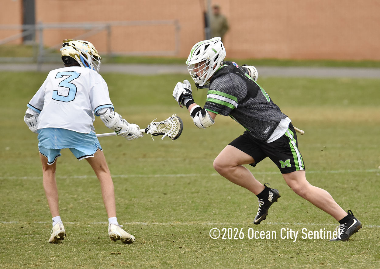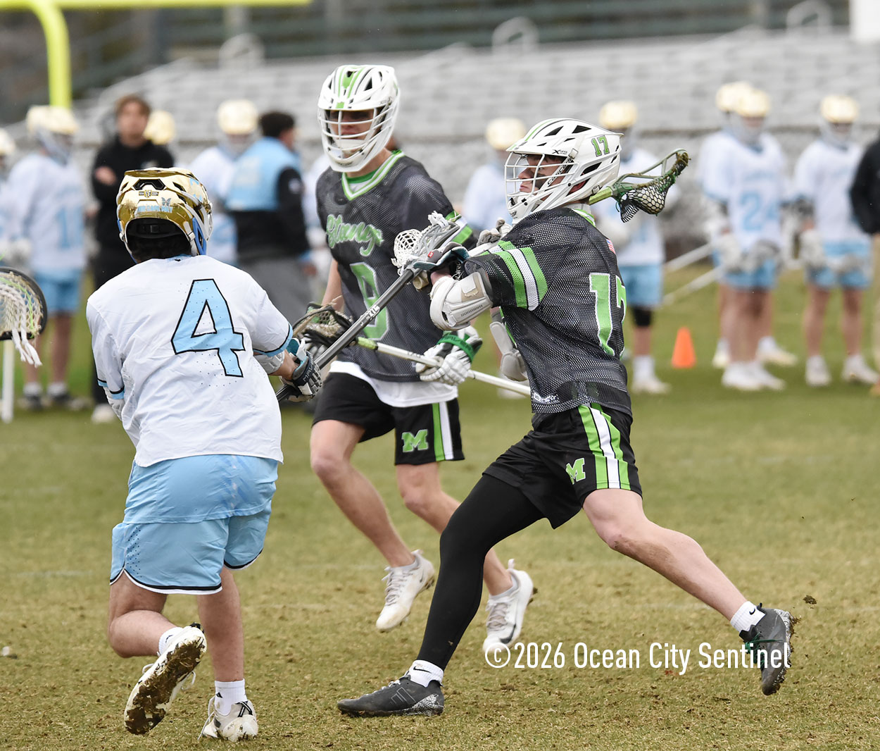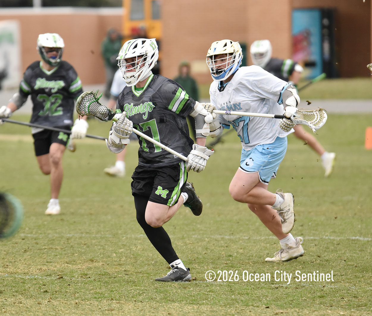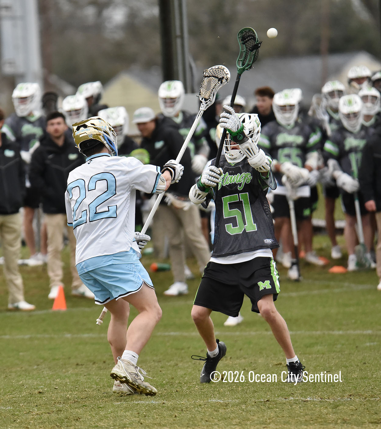 Mustang Harrison Gurwicz has handled Mainland’s face-offs for the last two seasons and picked up where he left off last season against Lower. The senior took one of the first face-offs of the game all the way to the net and scored a solo goal. He then later passed off his duties to sophomore Conlan Fitzpatrick, who went 12 for 15 in his first game.