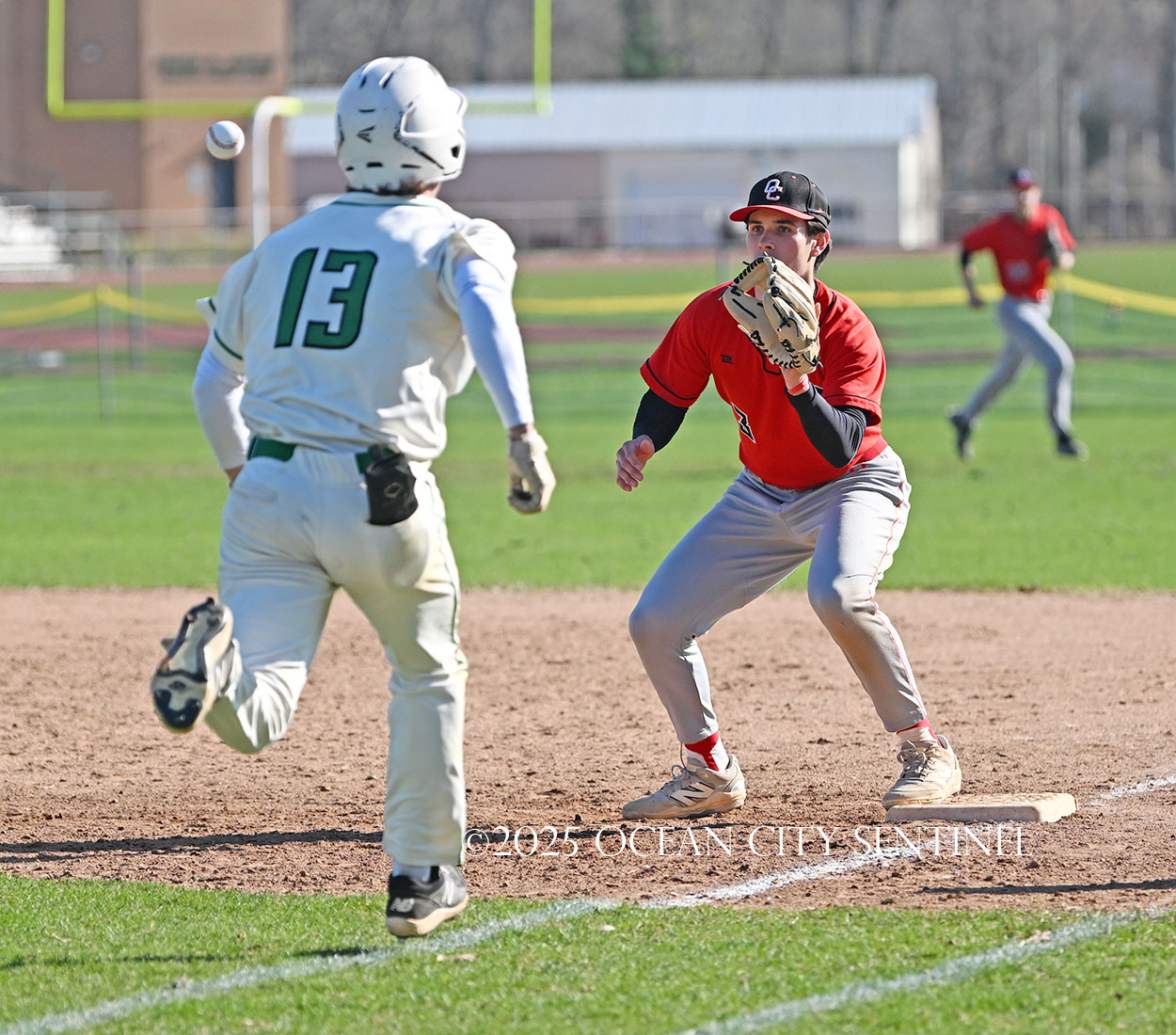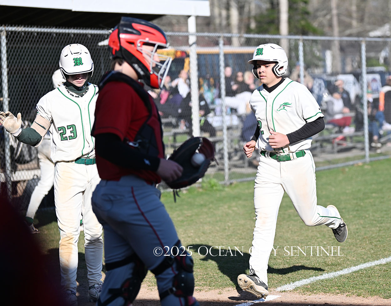 Game one of the two-game series took place April 9 at Mainland Regional High School. The home team Mustangs rallied from a 2-0 deficit to win 3-2. Raiders Ryan Baldwin and Evan Taylor each got on base in all four of their at-bats to help build the early lead.