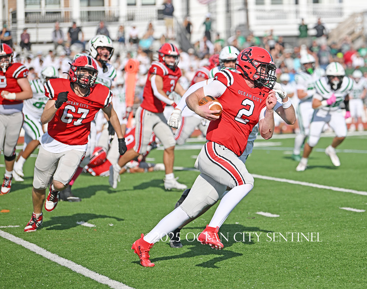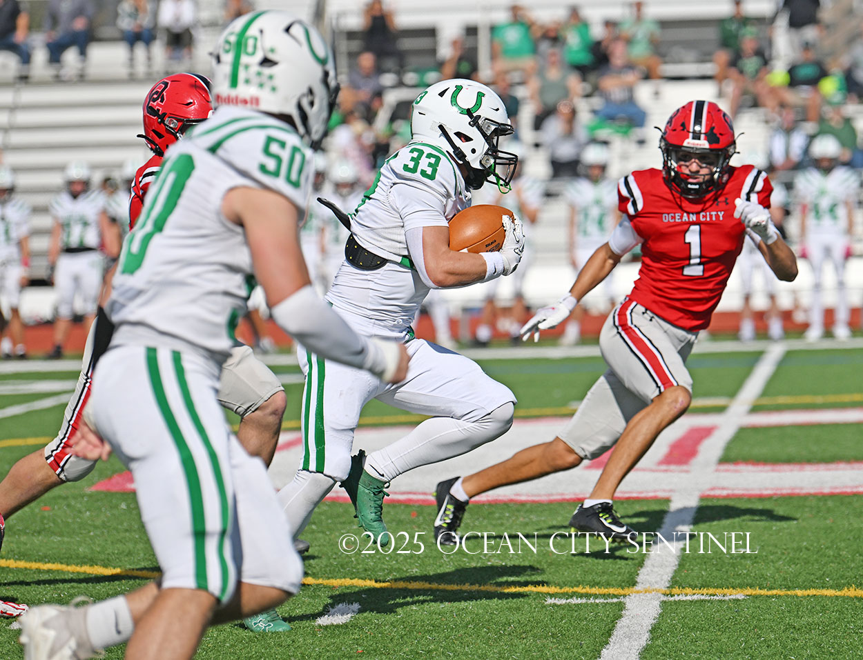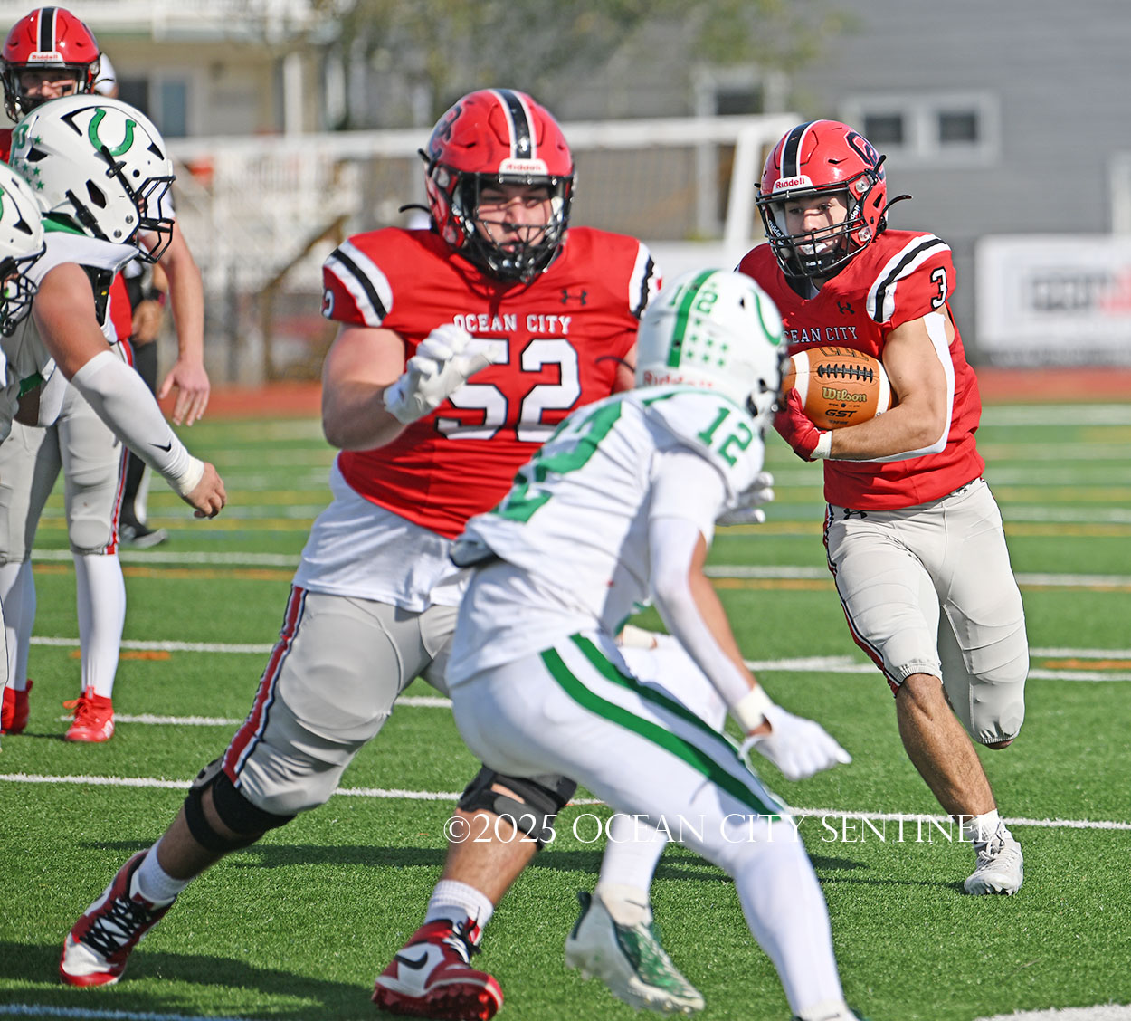 DeBiaso took over the rushing duties after another turnover by Ocean City. He ran for three first downs on the drive and topped it off with a 28-yard touchdown run. The junior averaged a first down a carry with his 129 yards on 12 attempts and hauled in an interception on defense late in the game.