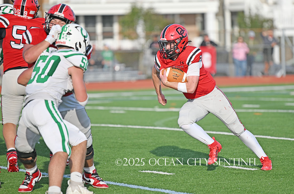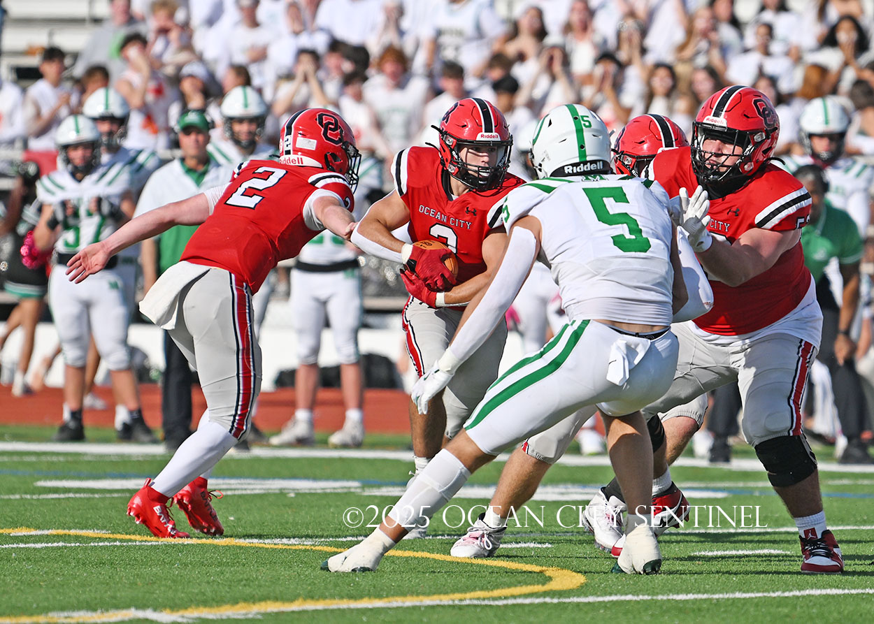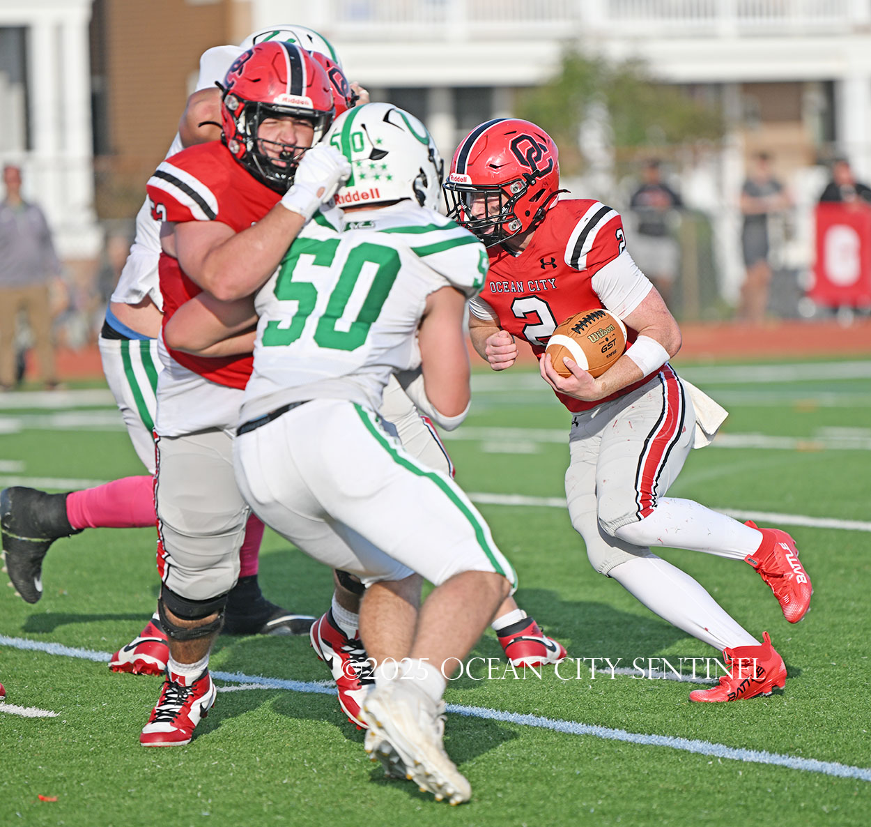 DeBiaso took over the rushing duties after another turnover by Ocean City. He ran for three first downs on the drive and topped it off with a 28-yard touchdown run. The junior averaged a first down a carry with his 129 yards on 12 attempts and hauled in an interception on defense late in the game.