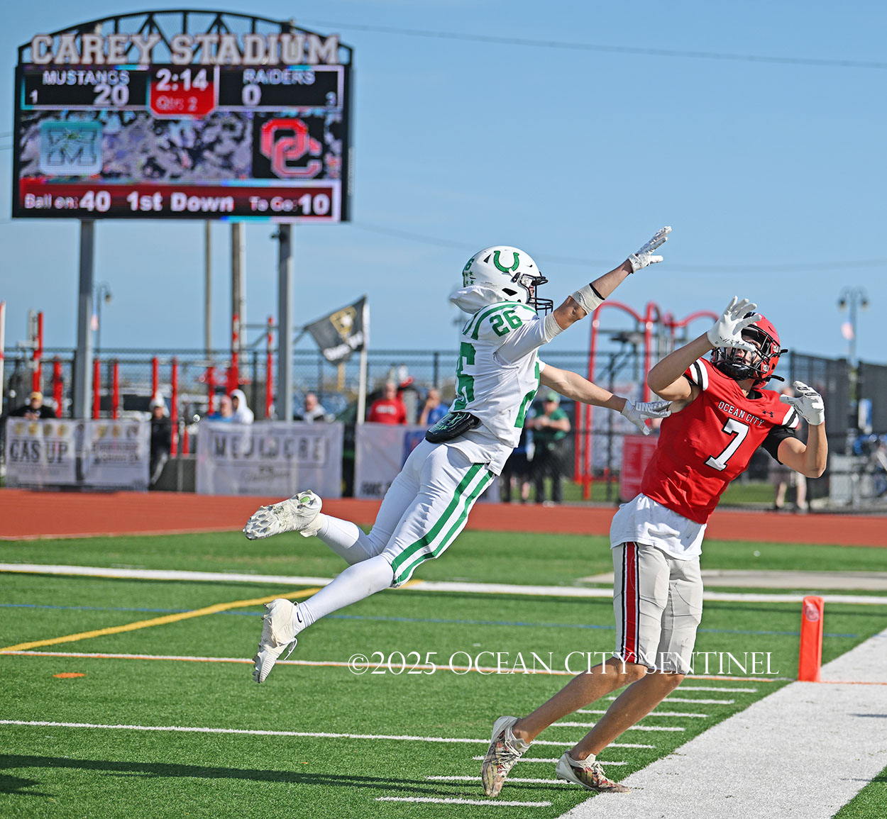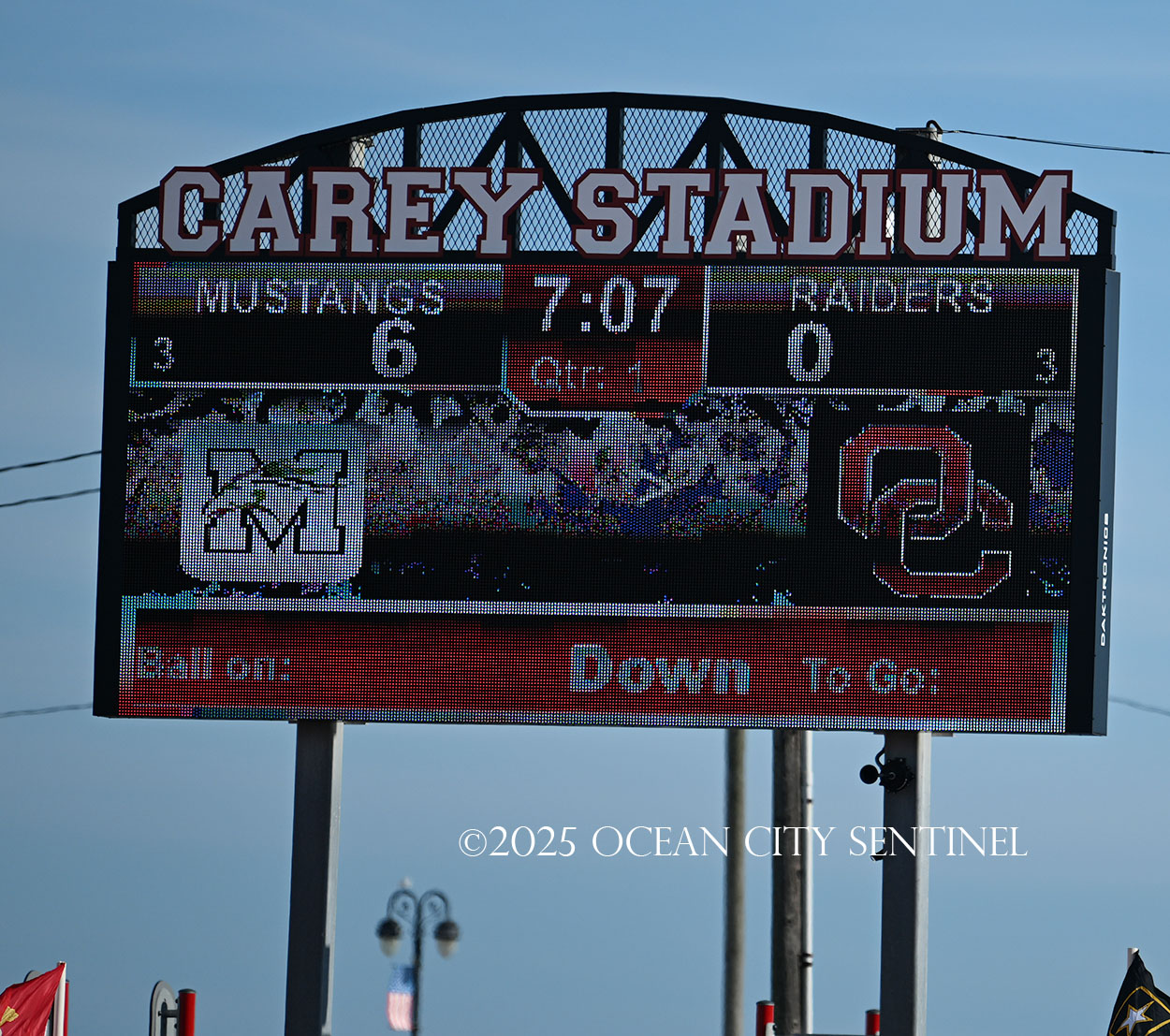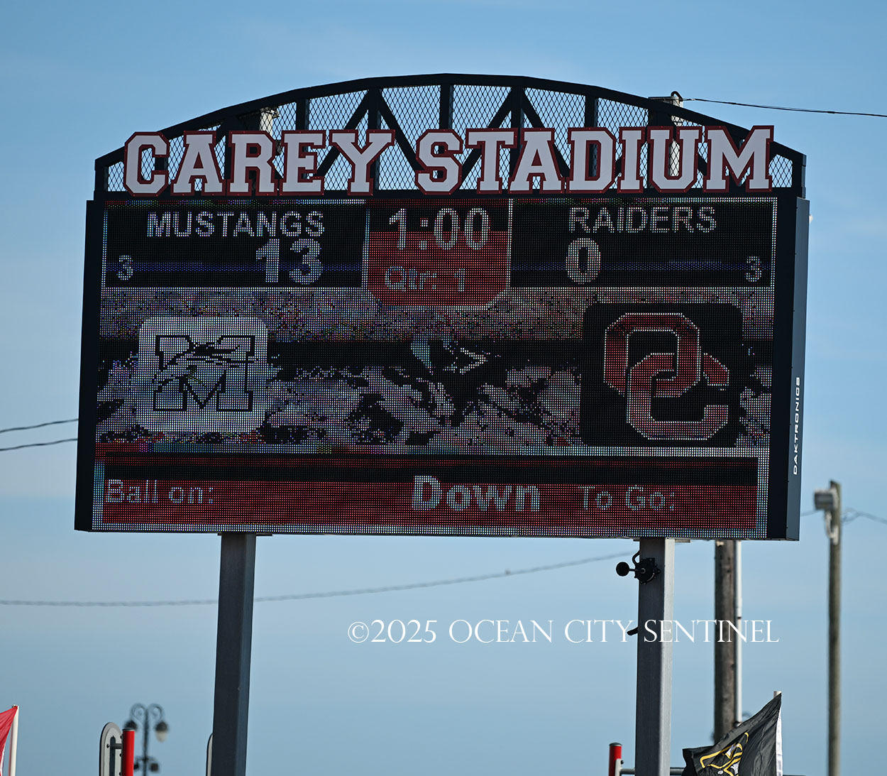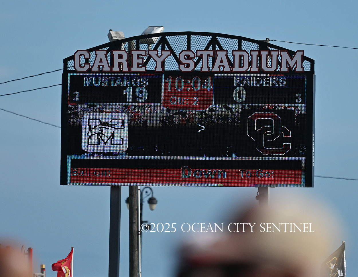 Later in the quarter, the Raiders forced a punt and looked to get good field position before a disastrous mistake put them further behind. The Raider offense did not come back onto the field after the punt was mishandled and recovered by the Mustangs at the Ocean City 30-yard line.