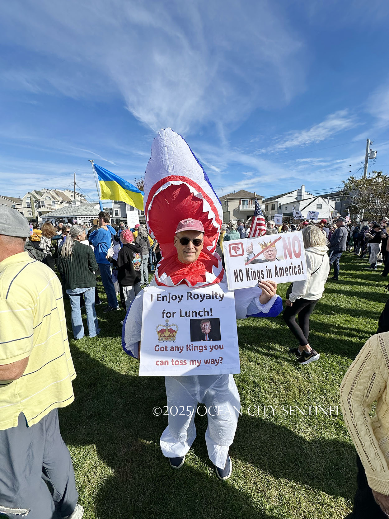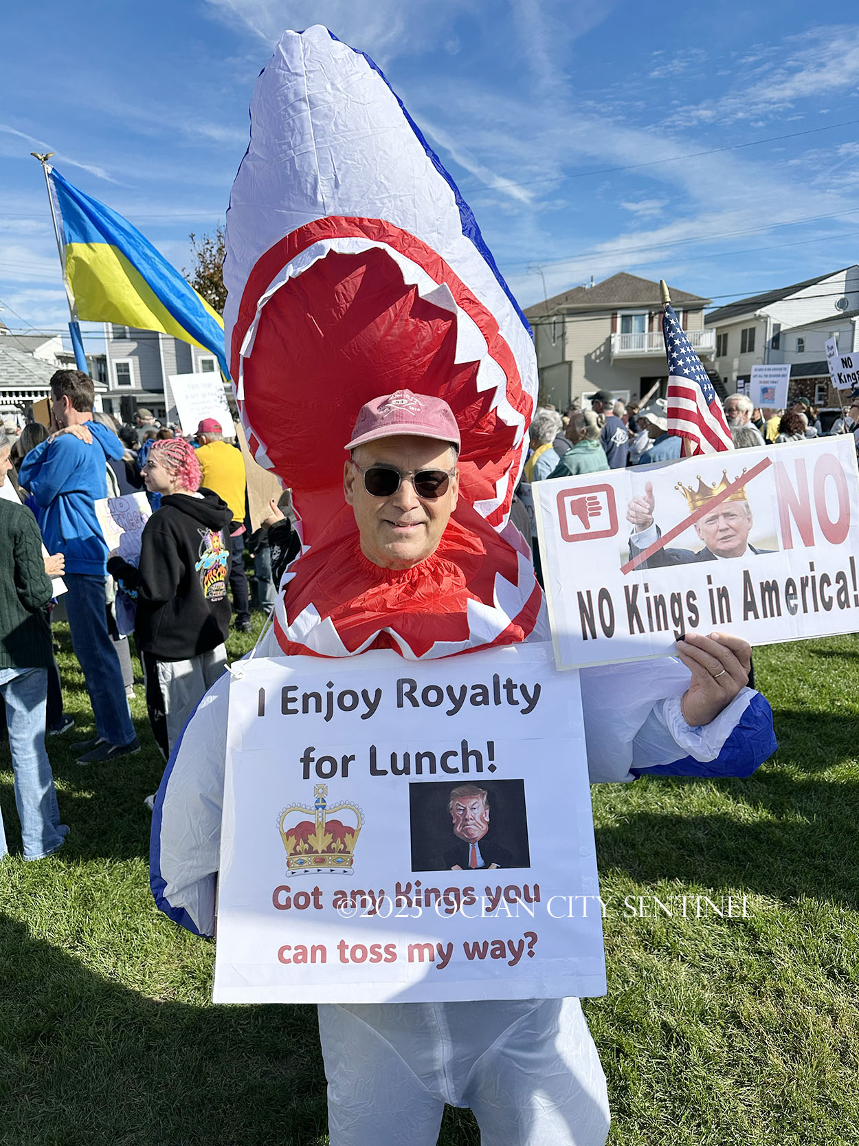 Jim Todd, a Colorado resident who has a second home in Ocean City, was dressed up in a red, white and blue inflatable shark outfit with a placard reading, “I enjoy royalty for lunch. Got any kings you can toss my way?”
