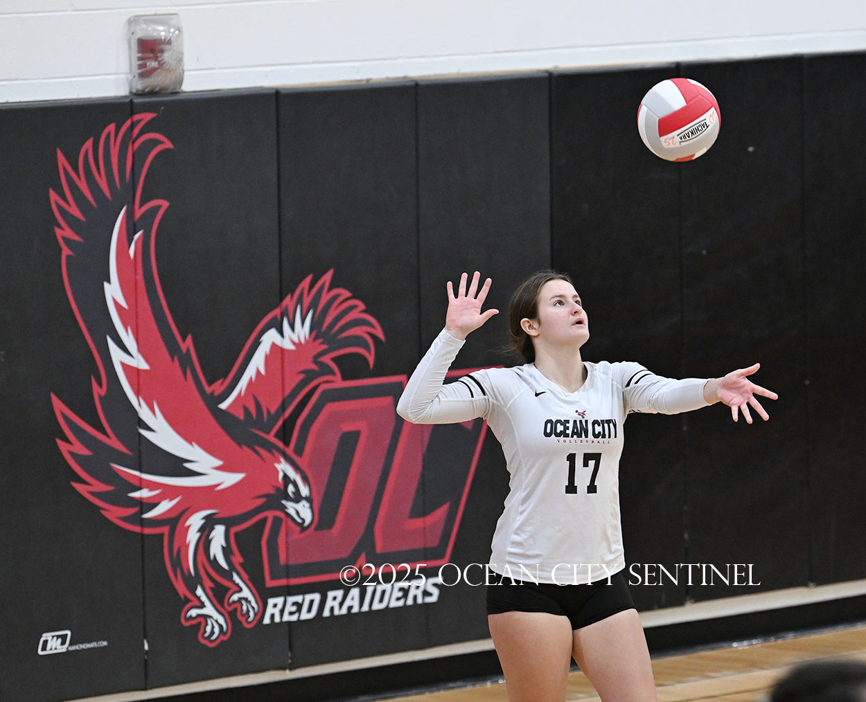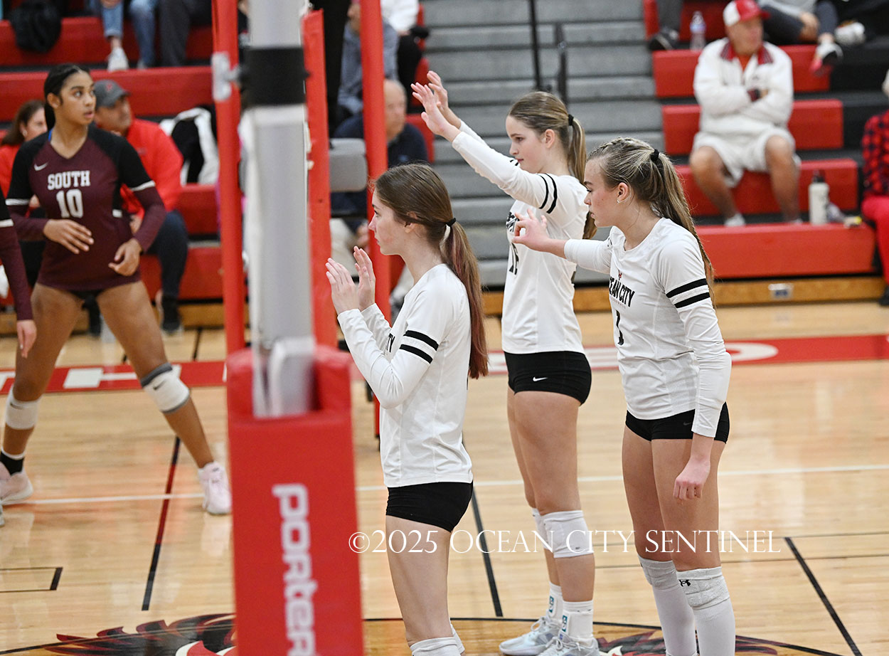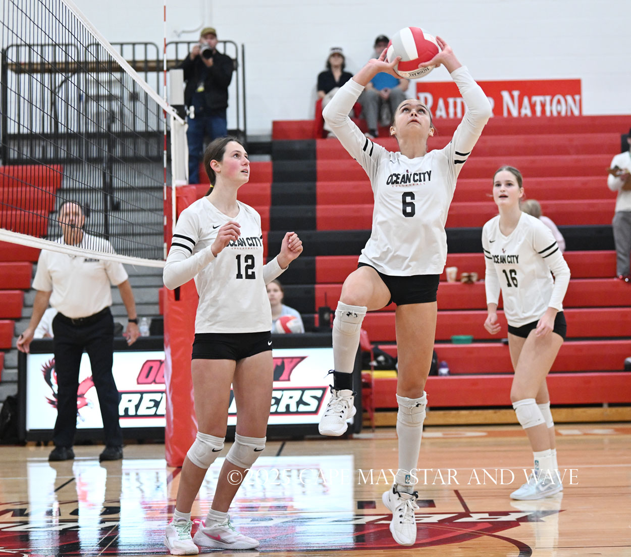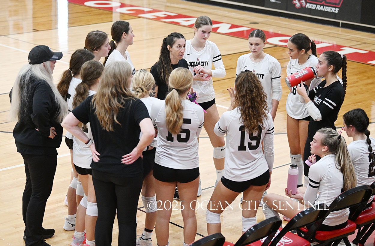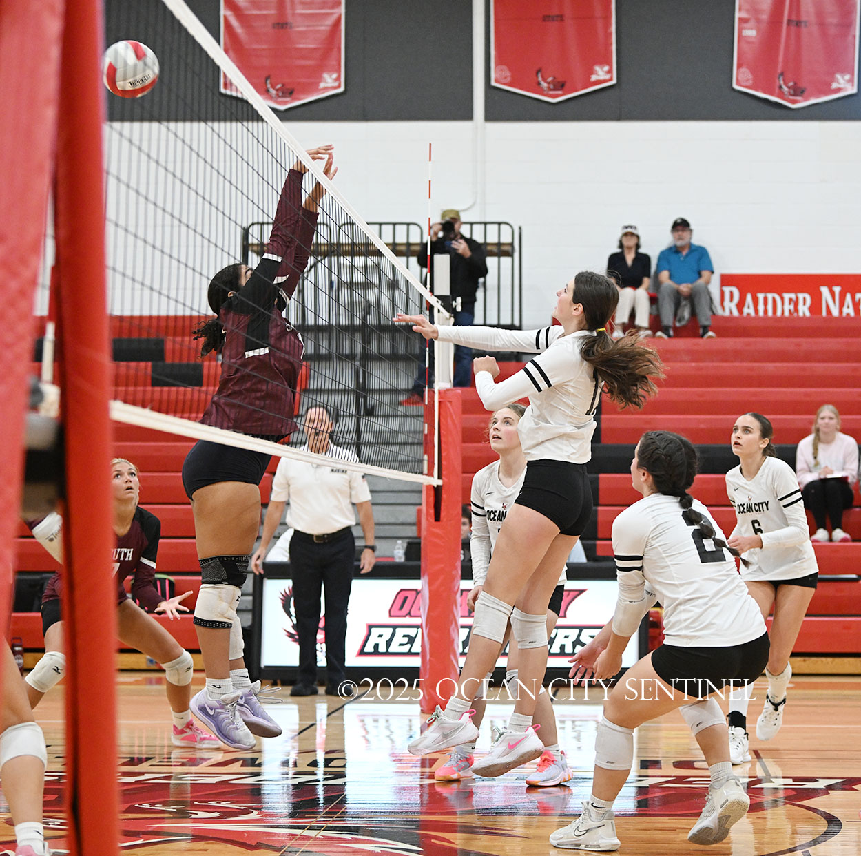 Toms River South started strong in the third set, leading early 6-2 before the Red Raiders tied at 6-6. Ocean City took the lead for good at 12-11. TRS got within a point later, 14-13, but Ocean City held at 22-18 and then got five set points at 24-19 before winning 25-19.