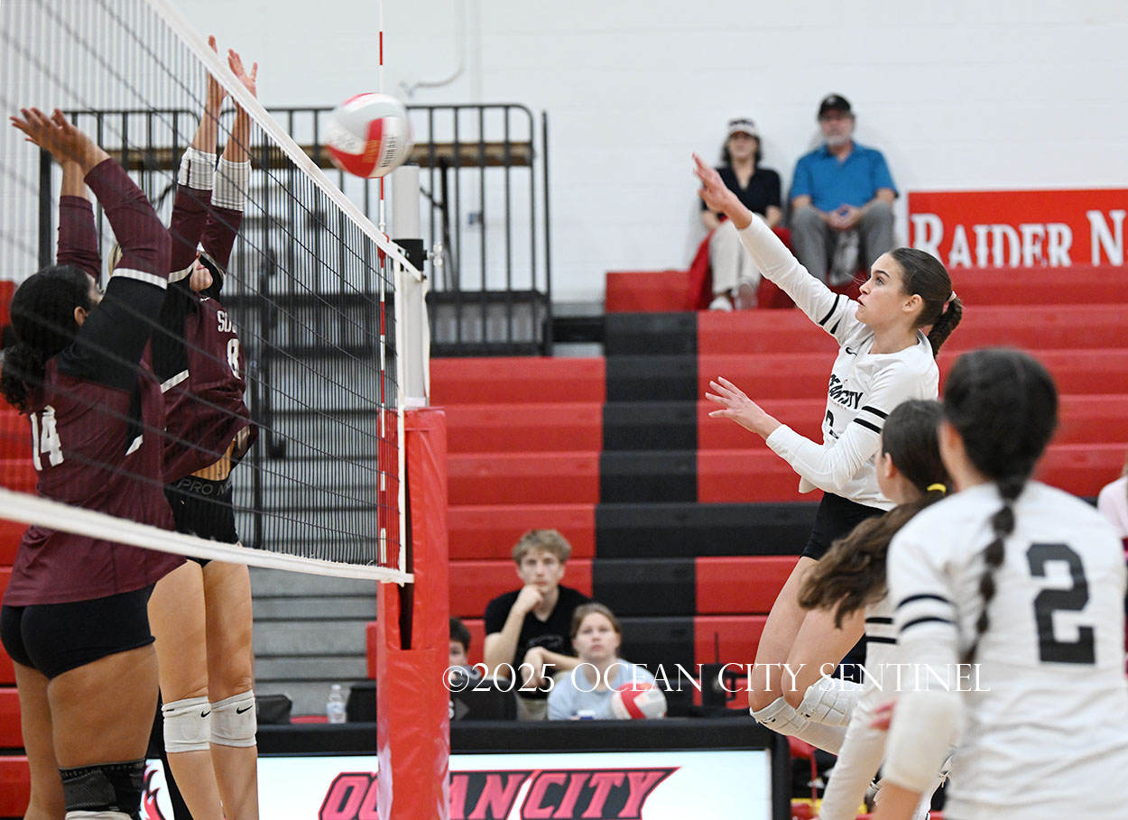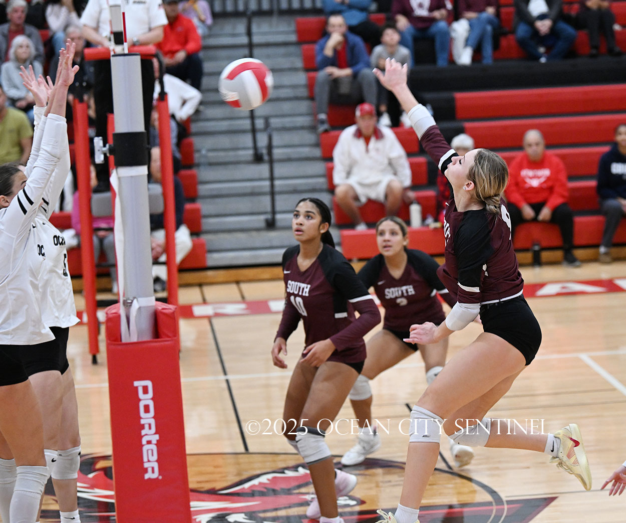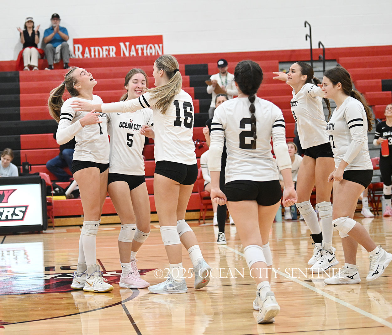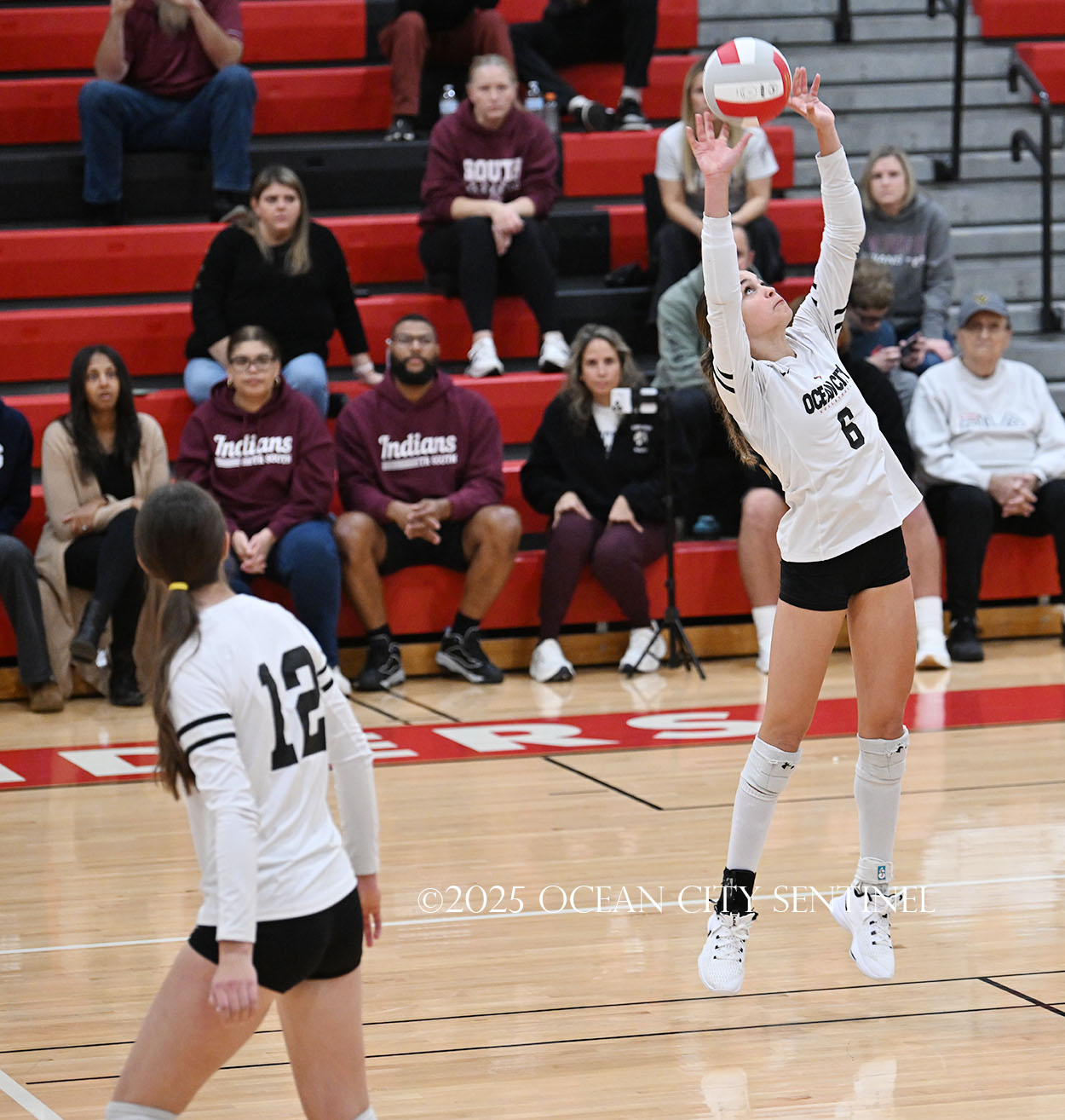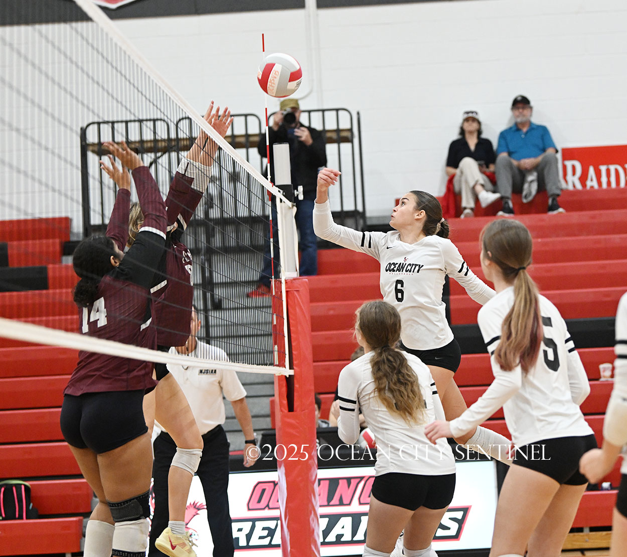 Toms River South started strong in the third set, leading early 6-2 before the Red Raiders tied at 6-6. Ocean City took the lead for good at 12-11. TRS got within a point later, 14-13, but Ocean City held at 22-18 and then got five set points at 24-19 before winning 25-19.
