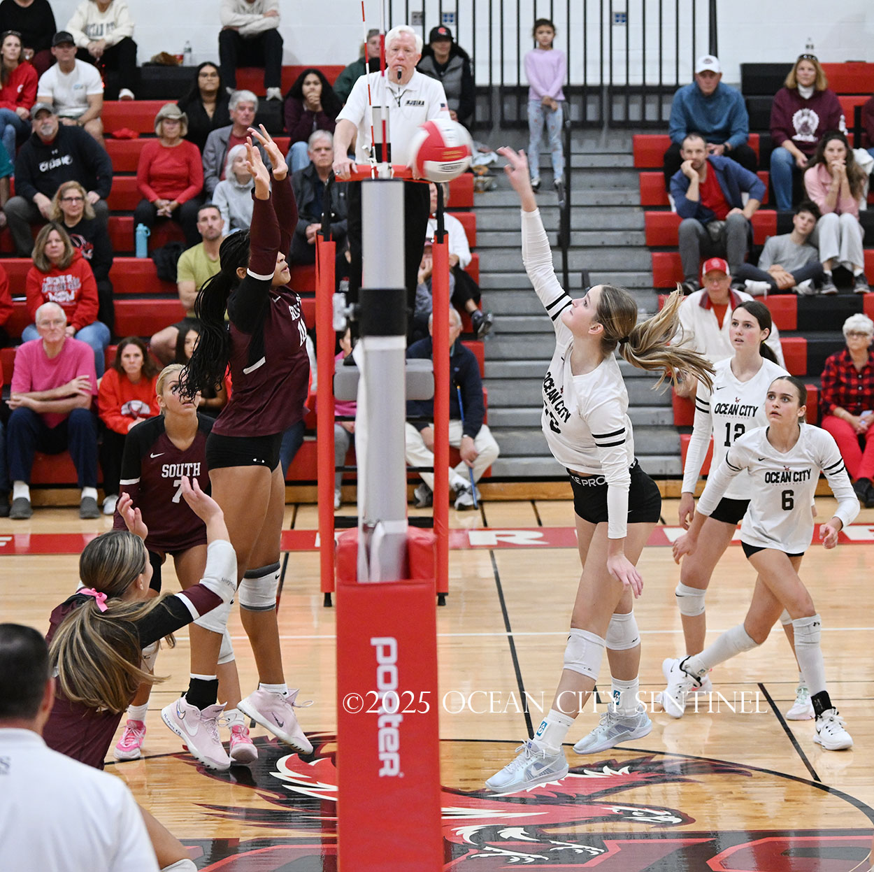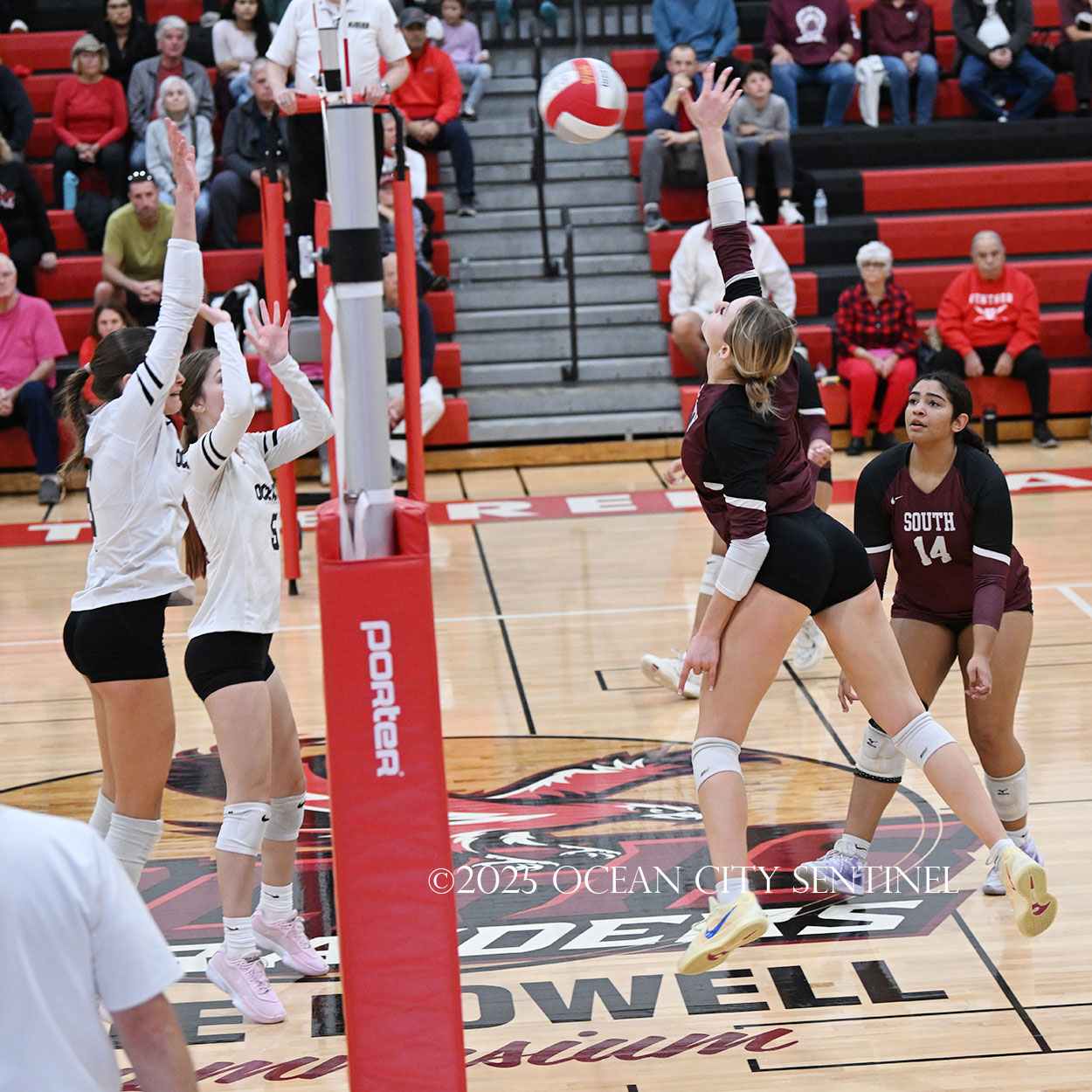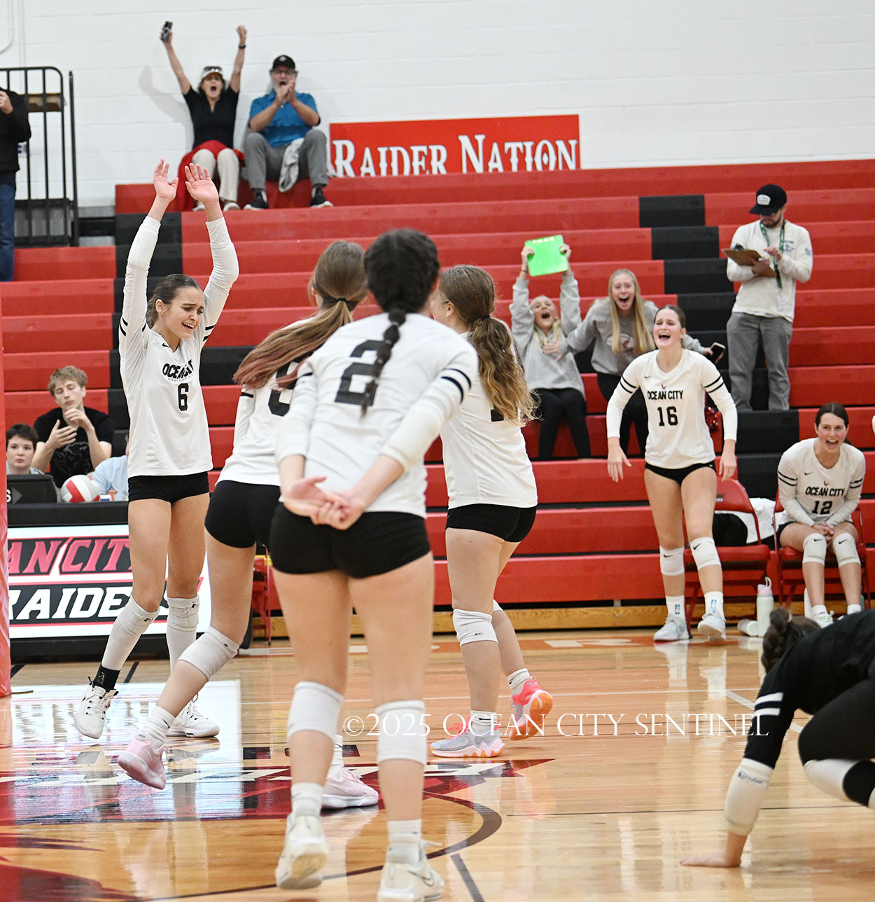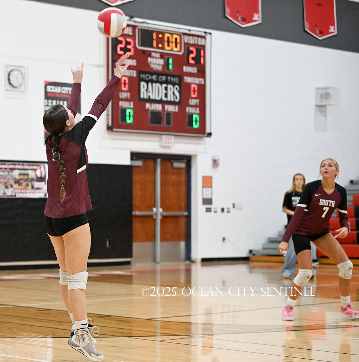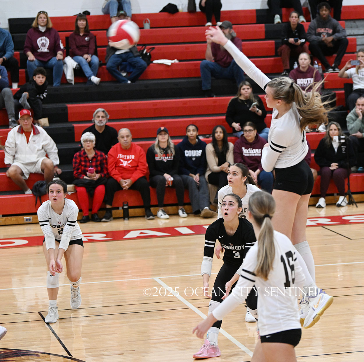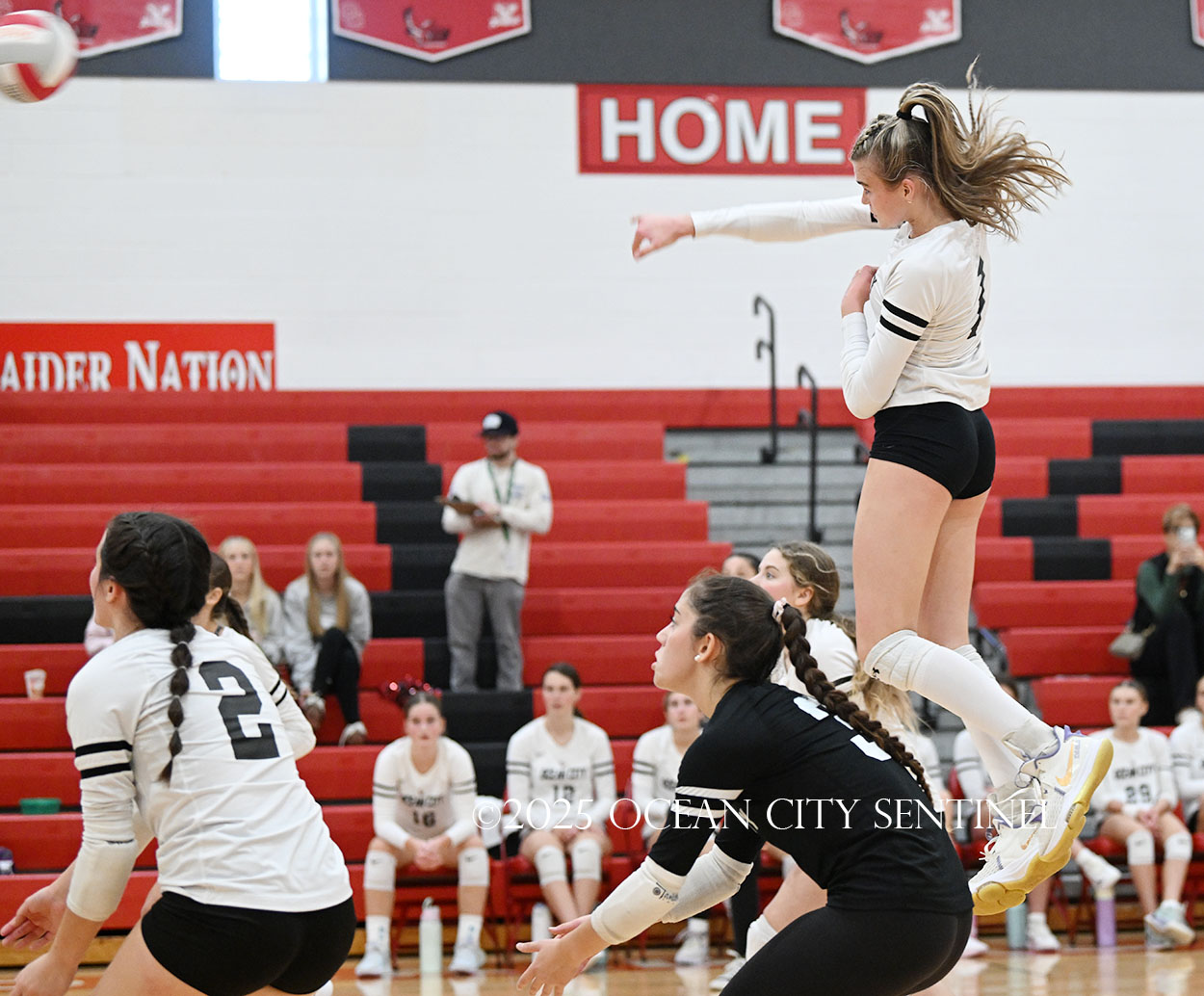 Toms River South started strong in the third set, leading early 6-2 before the Red Raiders tied at 6-6. Ocean City took the lead for good at 12-11. TRS got within a point later, 14-13, but Ocean City held at 22-18 and then got five set points at 24-19 before winning 25-19.