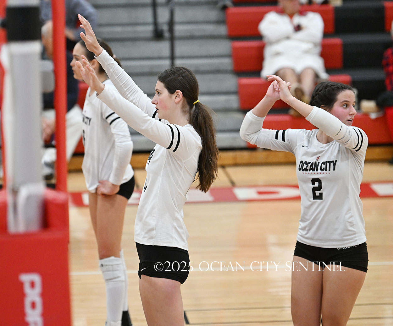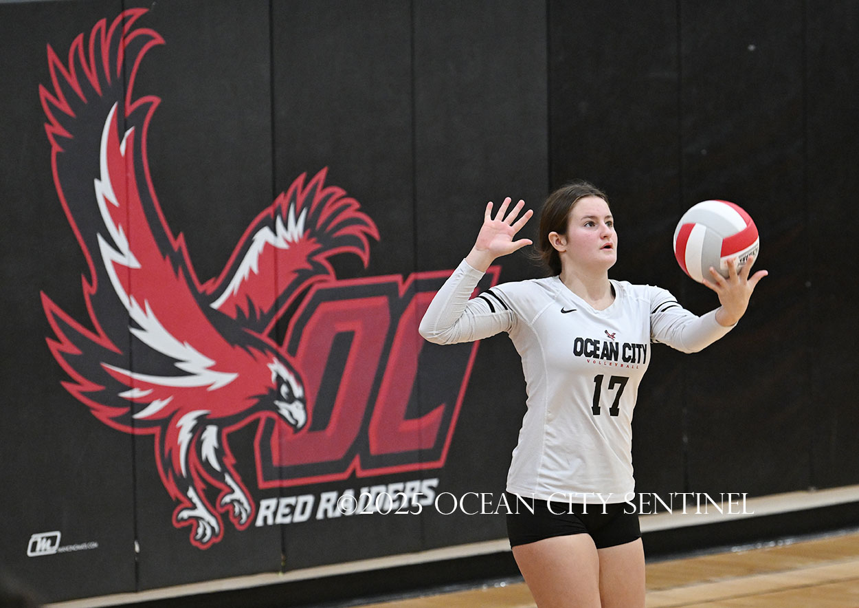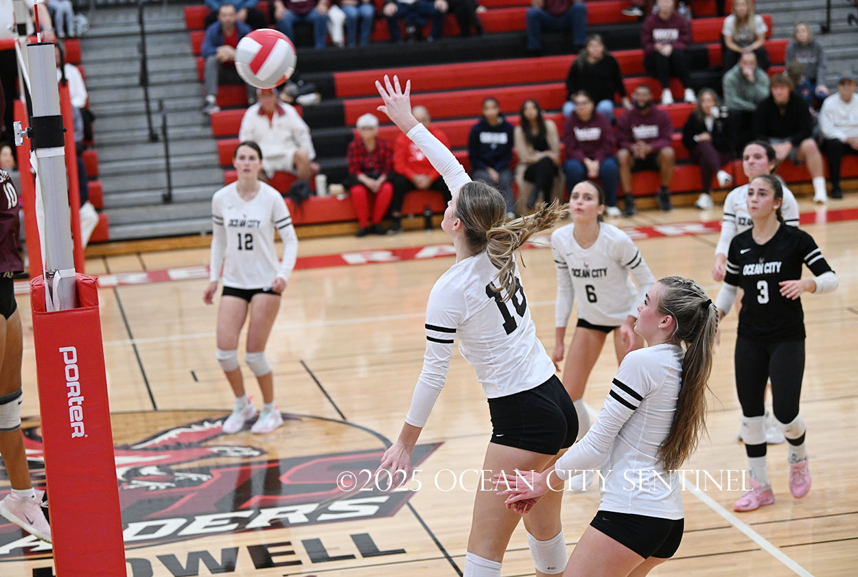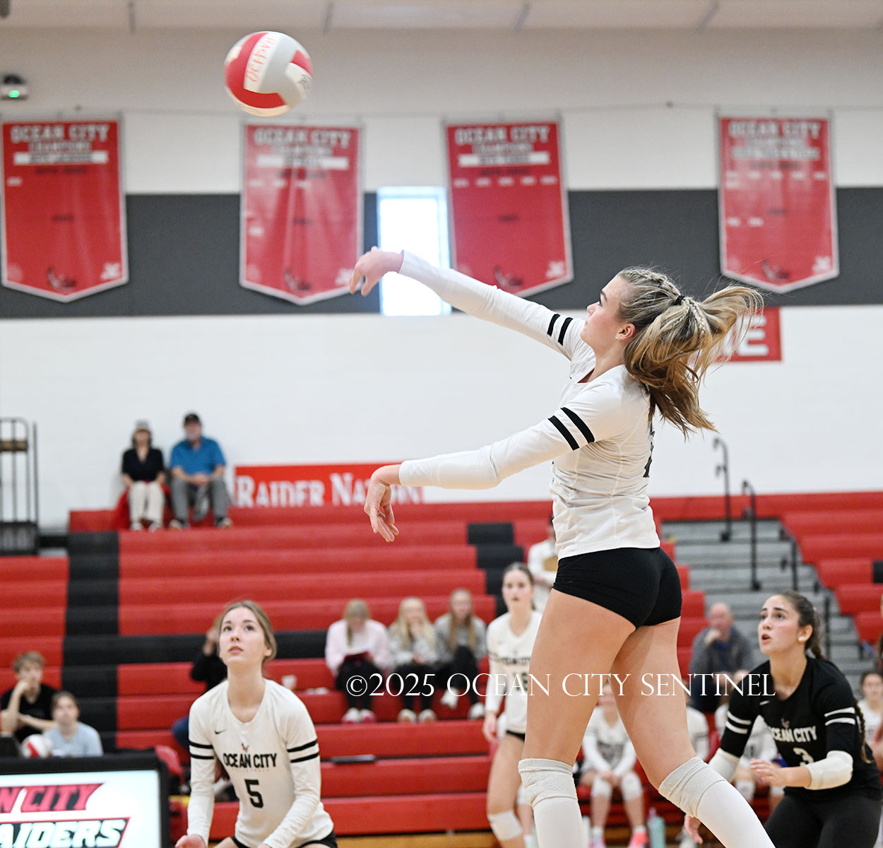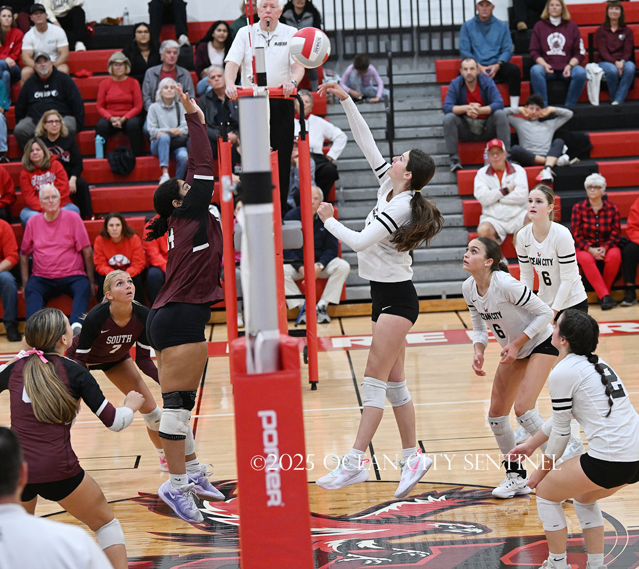 Toms River South started strong in the third set, leading early 6-2 before the Red Raiders tied at 6-6. Ocean City took the lead for good at 12-11. TRS got within a point later, 14-13, but Ocean City held at 22-18 and then got five set points at 24-19 before winning 25-19.