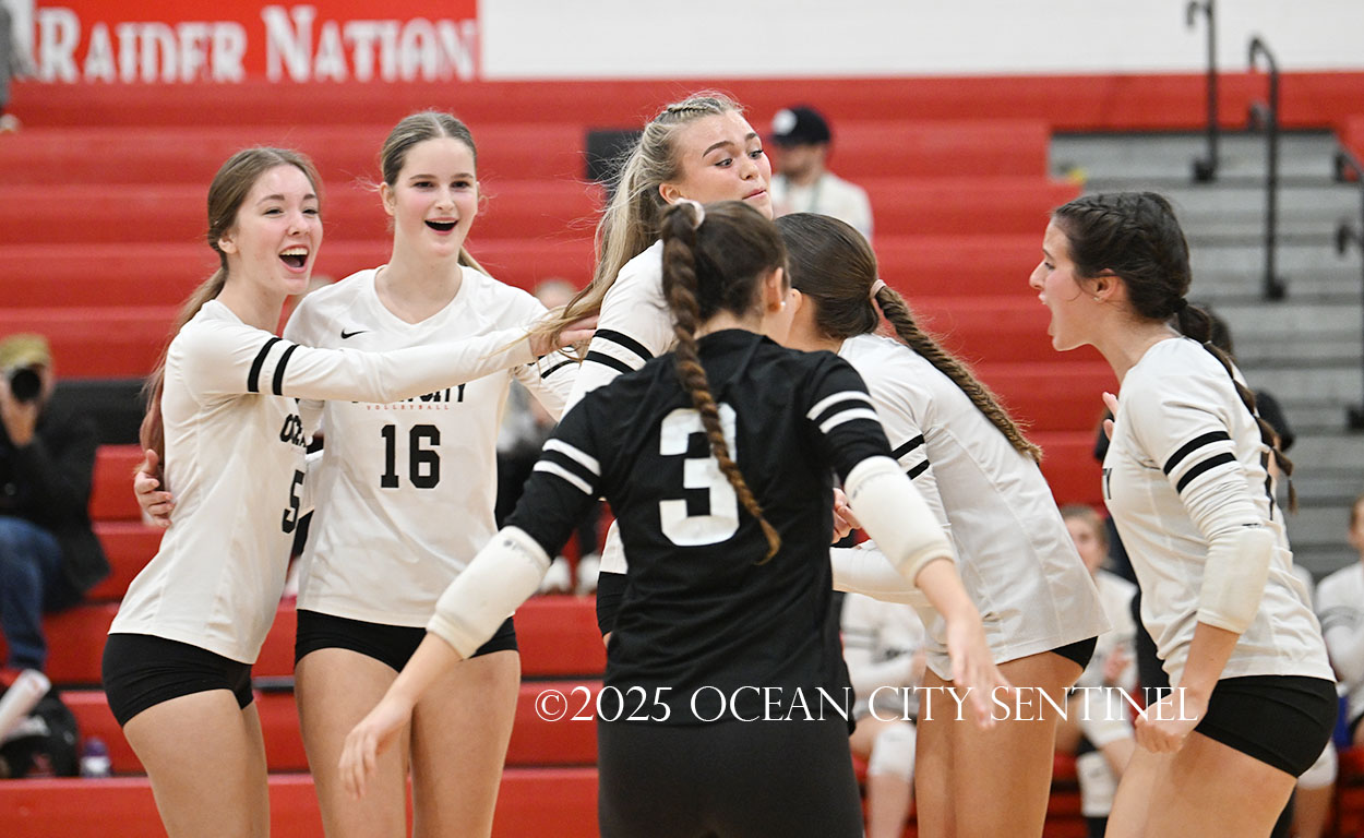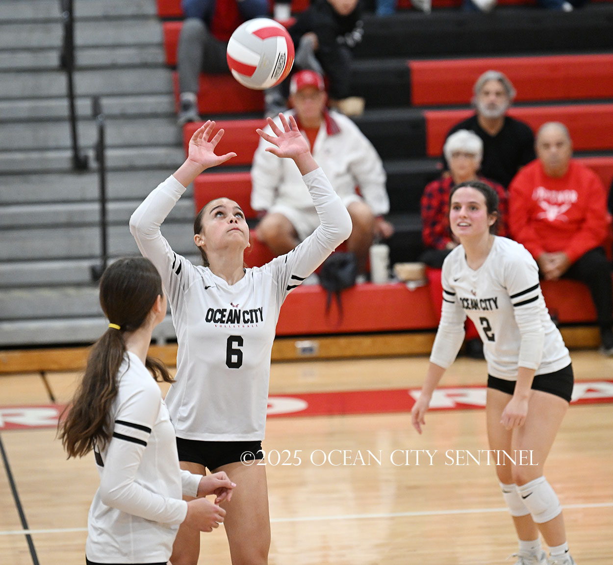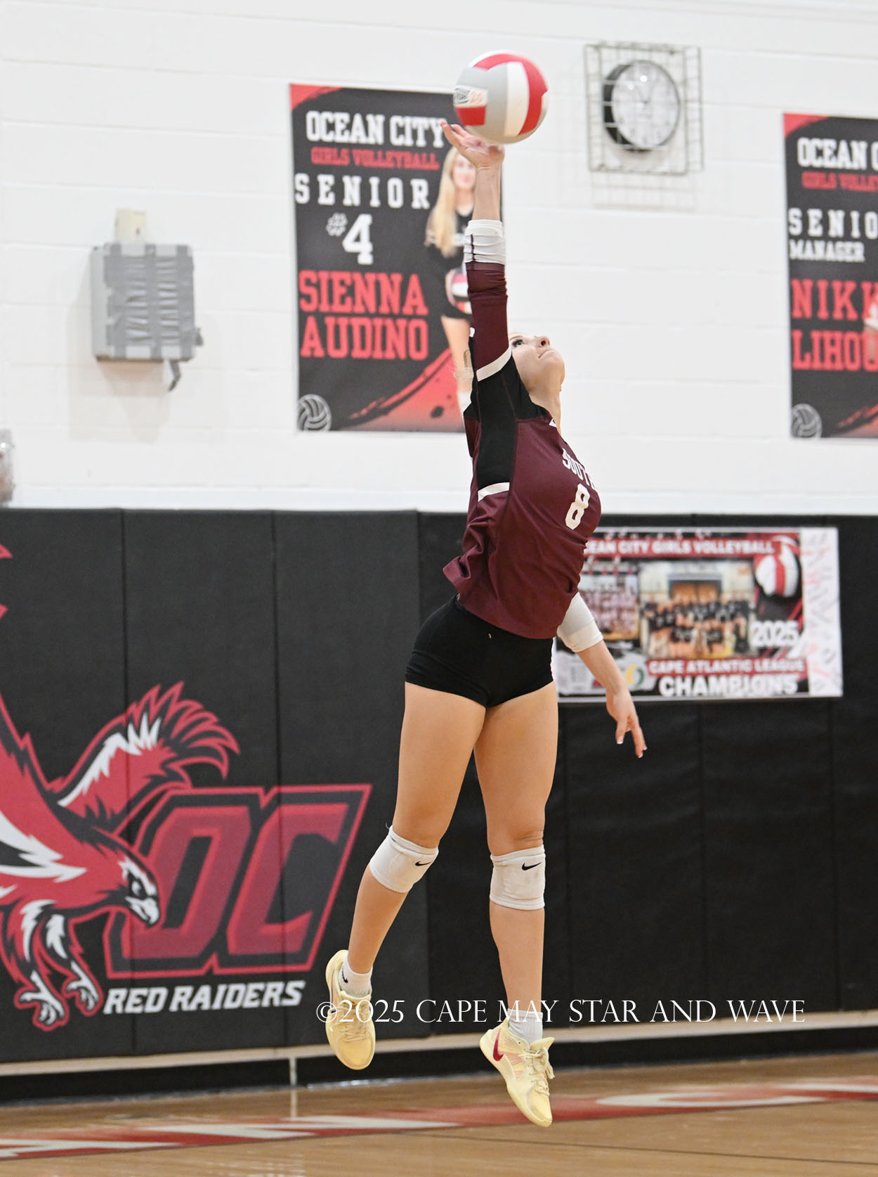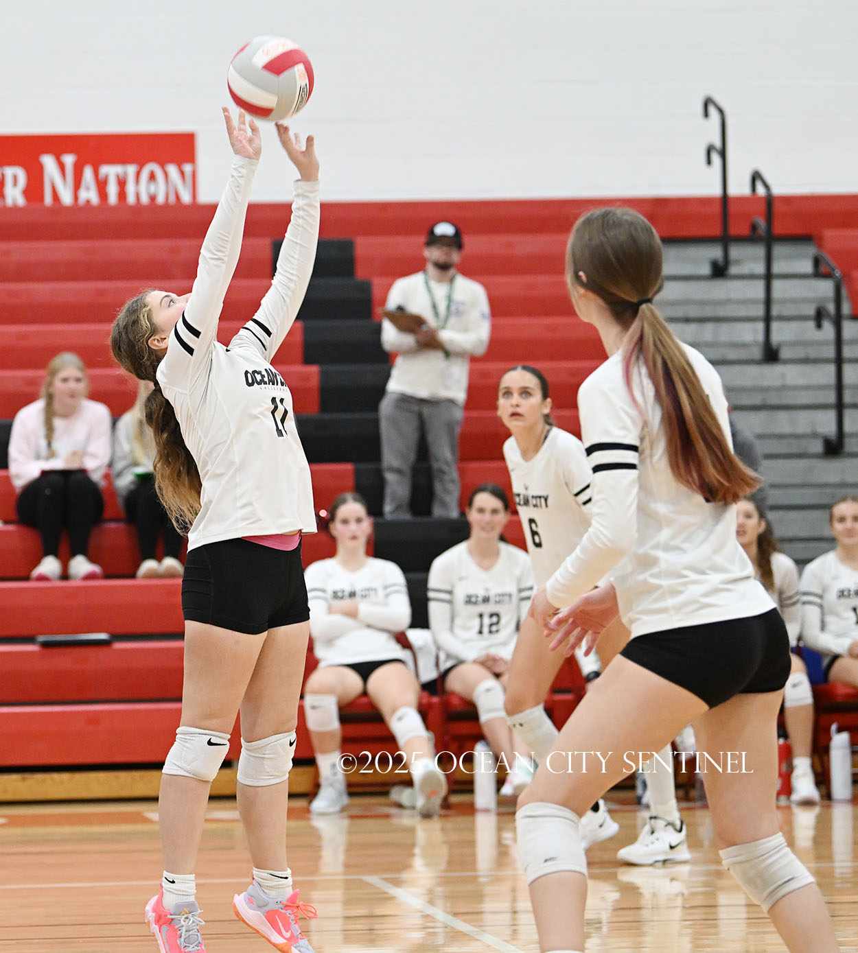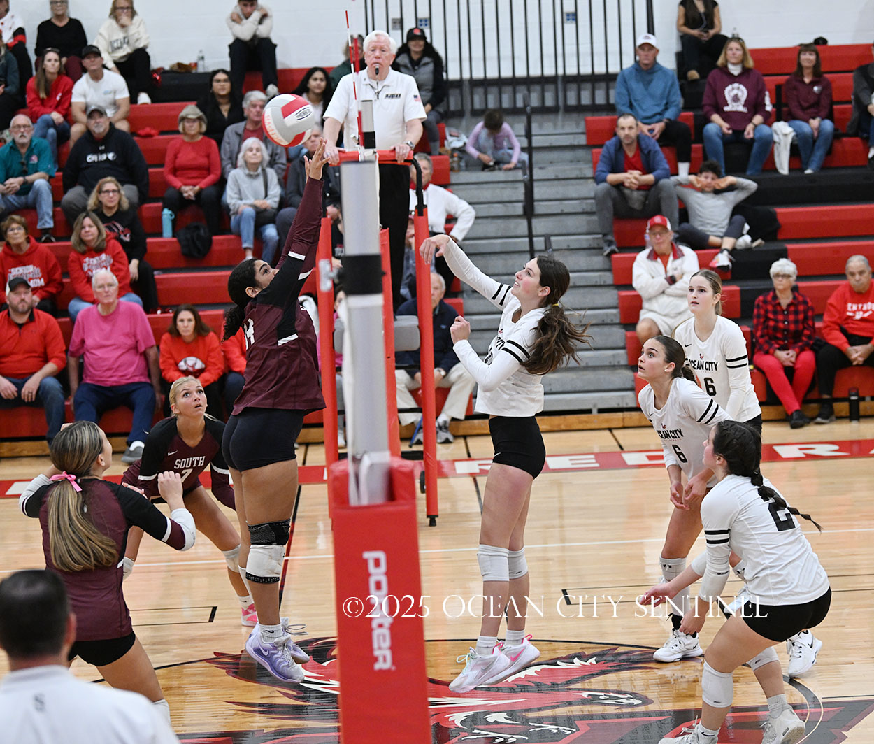 Toms River South started strong in the third set, leading early 6-2 before the Red Raiders tied at 6-6. Ocean City took the lead for good at 12-11. TRS got within a point later, 14-13, but Ocean City held at 22-18 and then got five set points at 24-19 before winning 25-19.