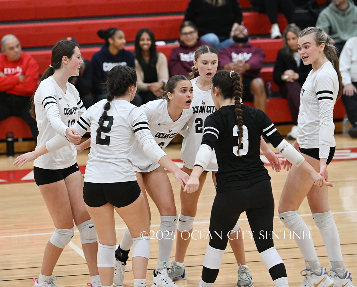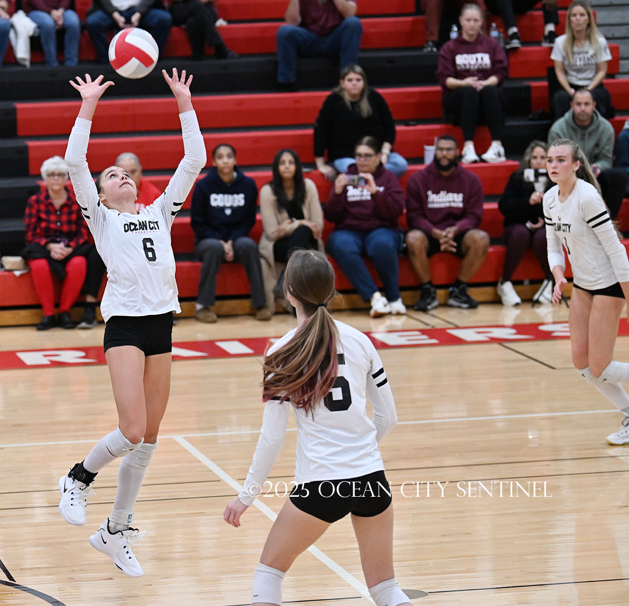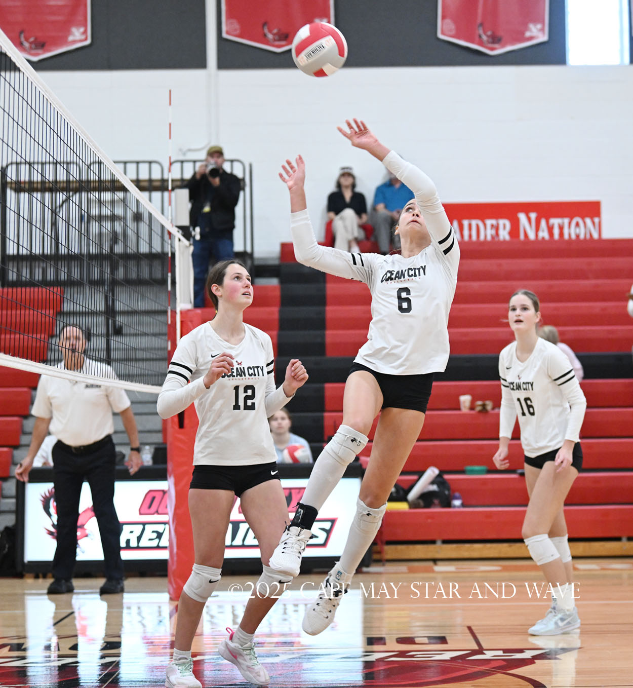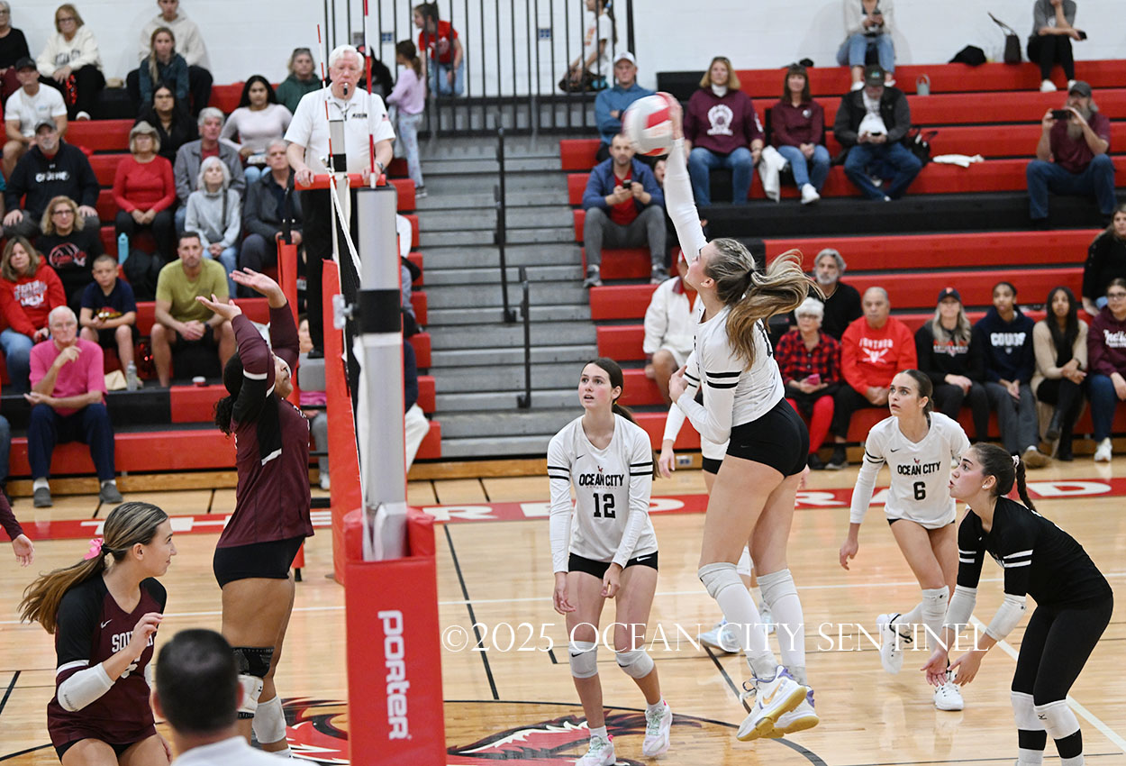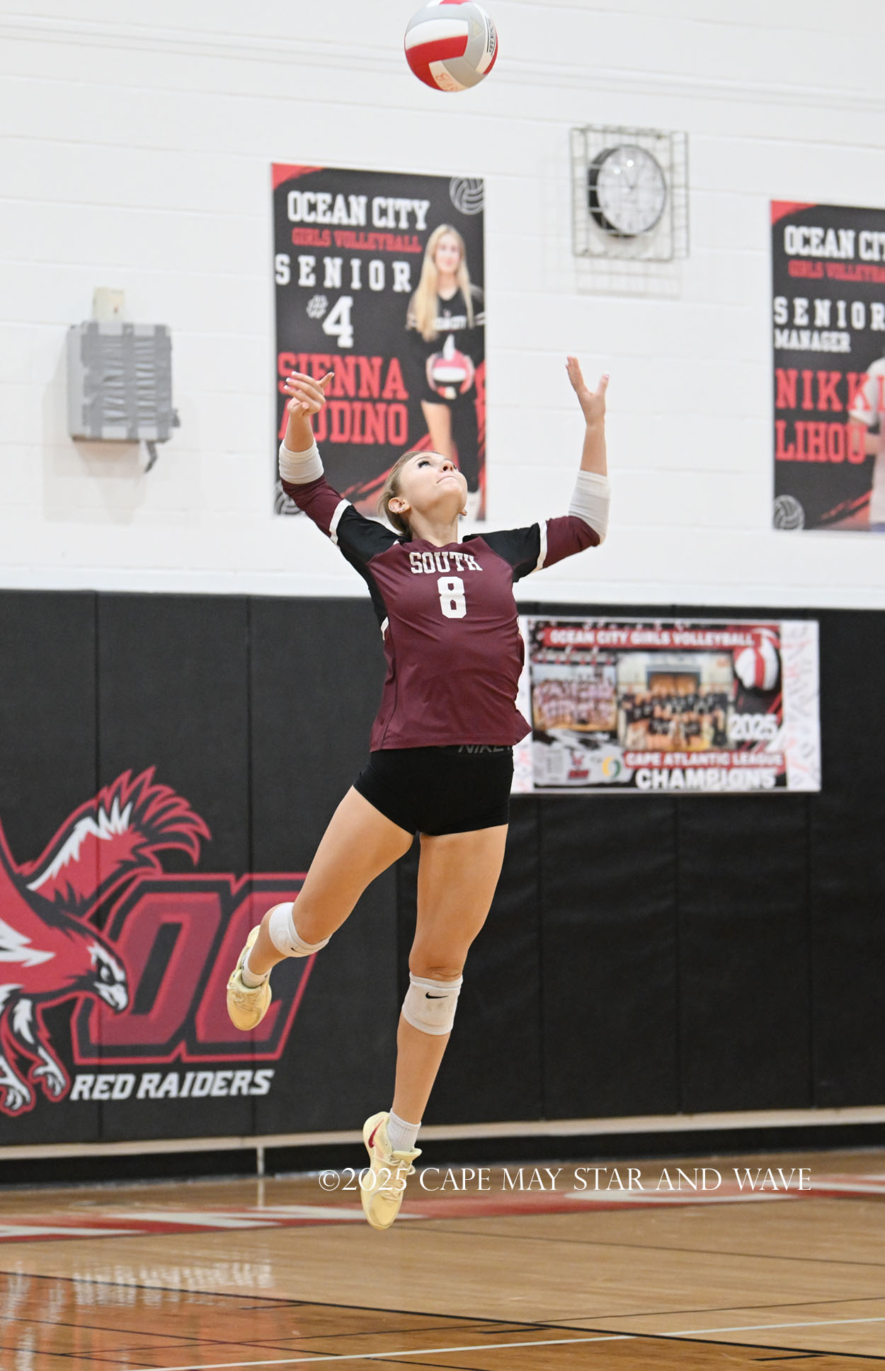 Toms River South started strong in the third set, leading early 6-2 before the Red Raiders tied at 6-6. Ocean City took the lead for good at 12-11. TRS got within a point later, 14-13, but Ocean City held at 22-18 and then got five set points at 24-19 before winning 25-19.