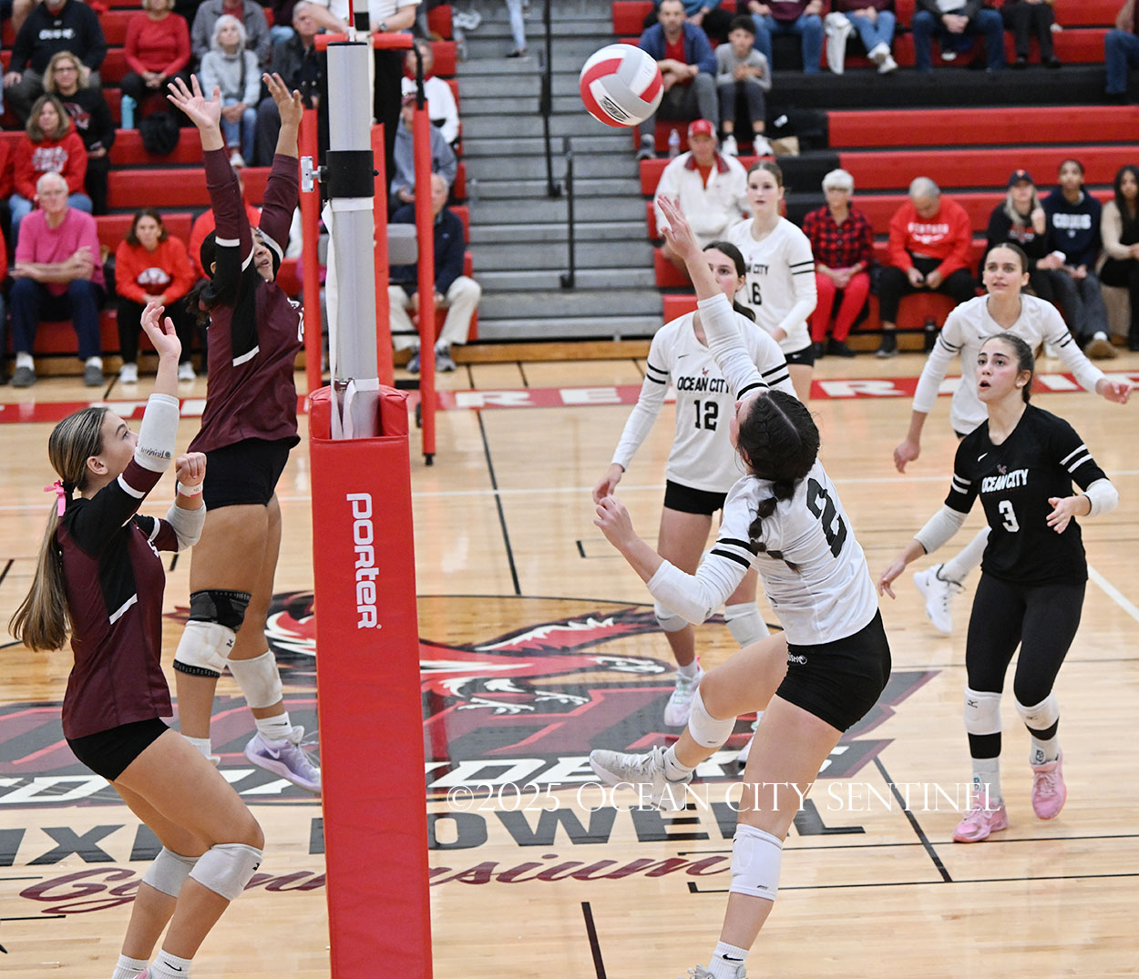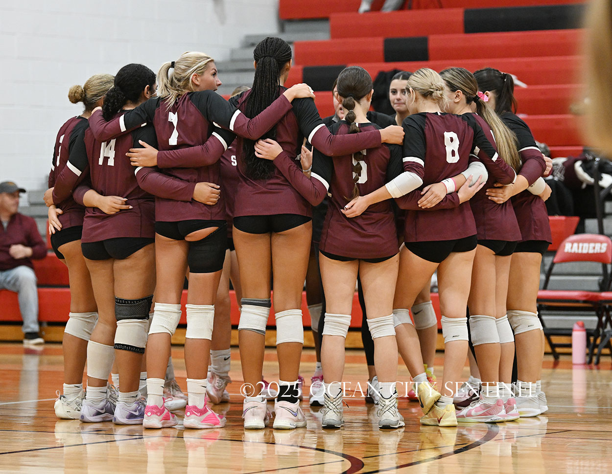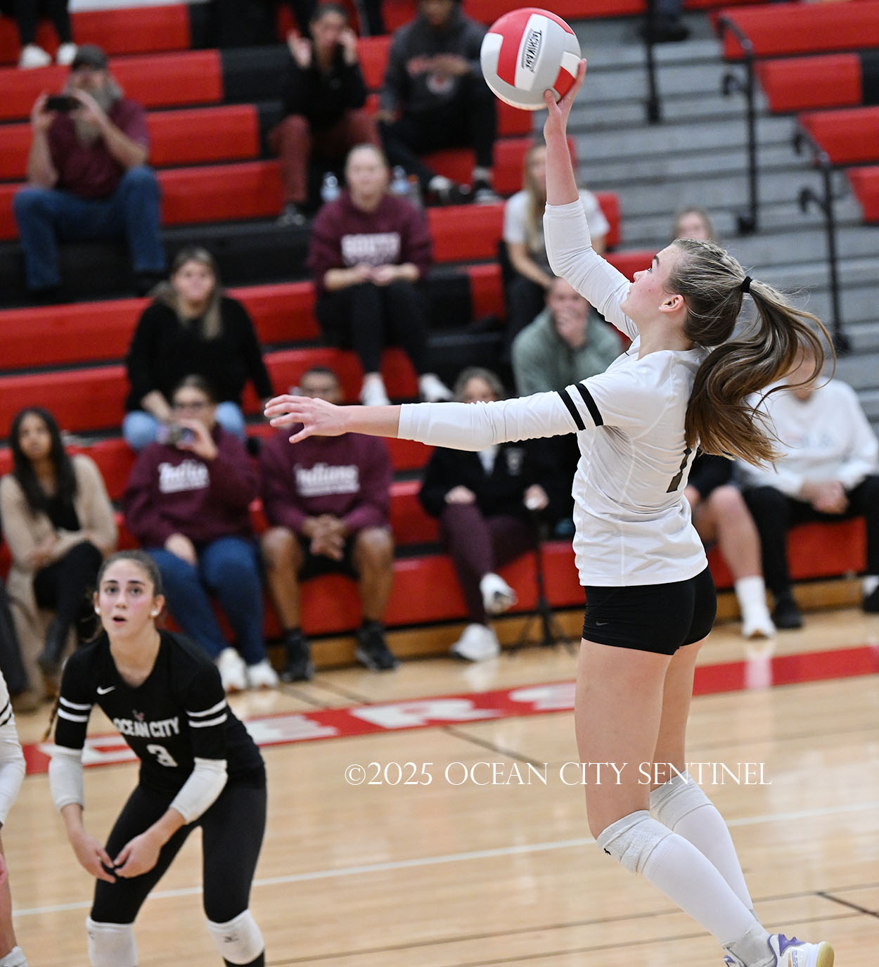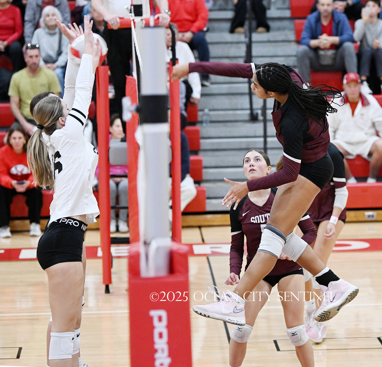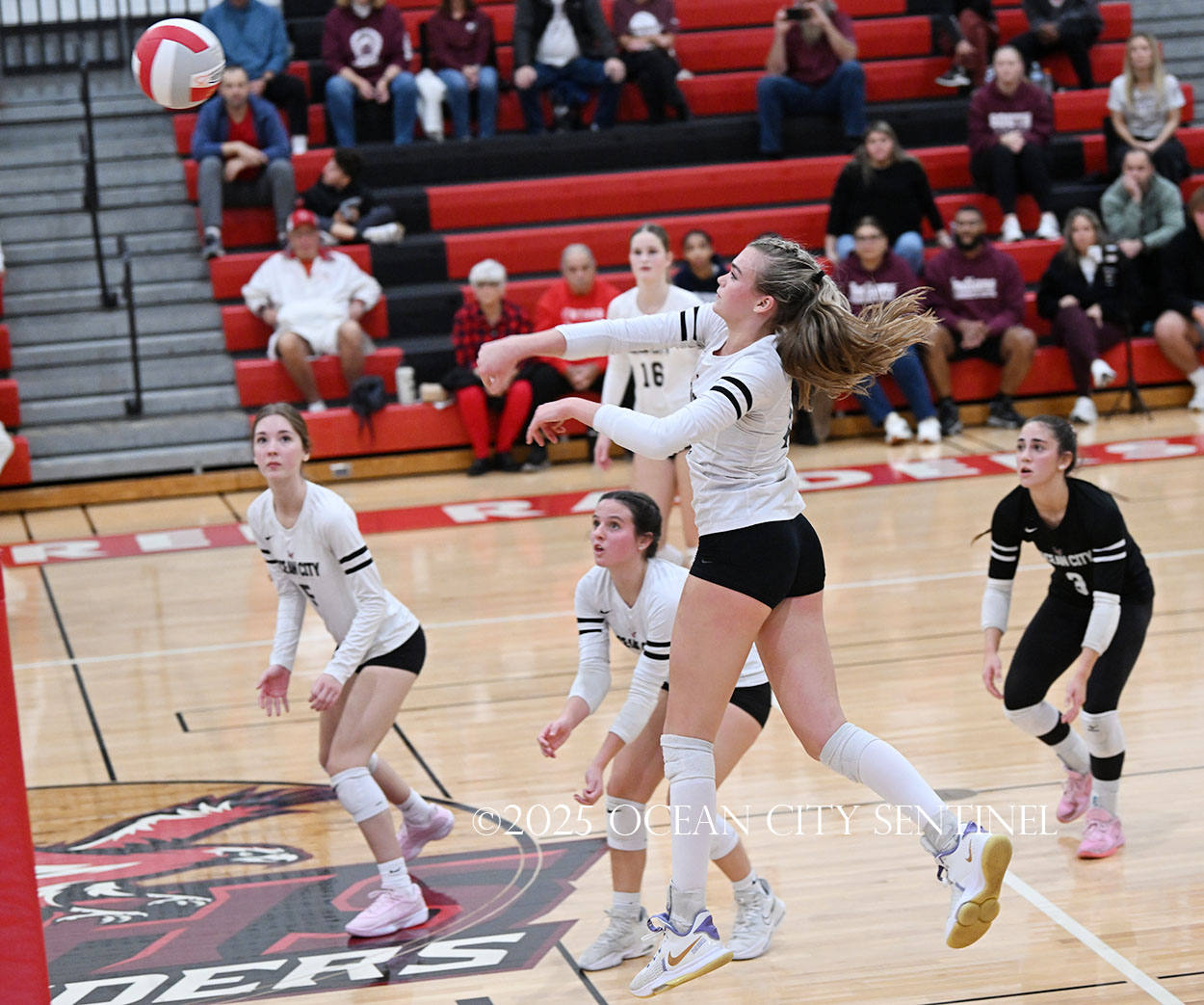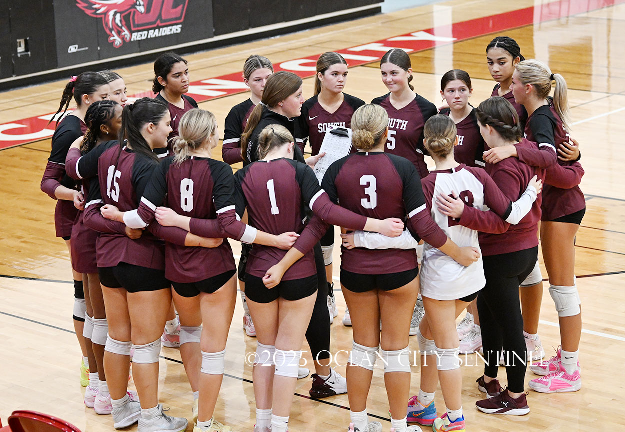 Toms River South started strong in the third set, leading early 6-2 before the Red Raiders tied at 6-6. Ocean City took the lead for good at 12-11. TRS got within a point later, 14-13, but Ocean City held at 22-18 and then got five set points at 24-19 before winning 25-19.