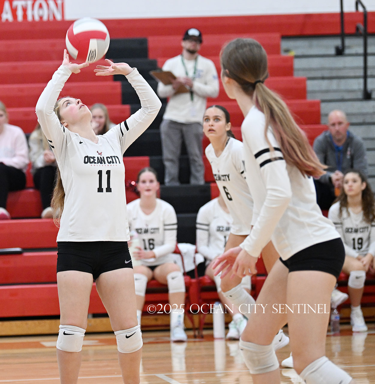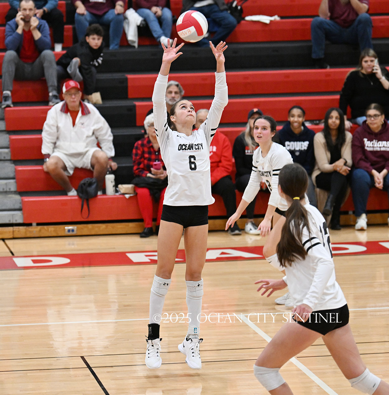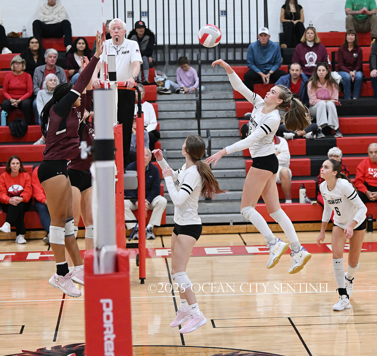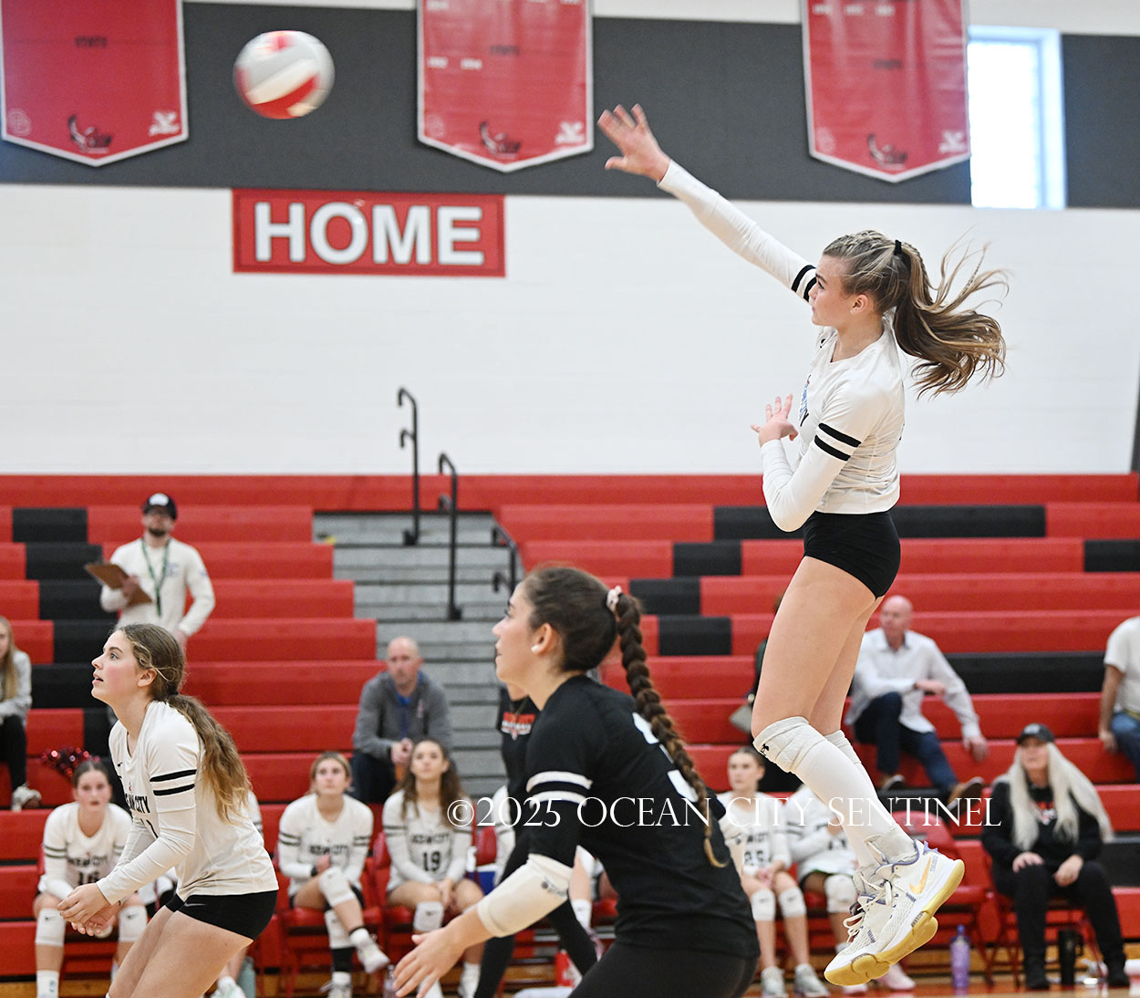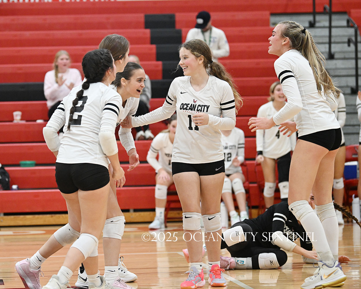 Toms River South started strong in the third set, leading early 6-2 before the Red Raiders tied at 6-6. Ocean City took the lead for good at 12-11. TRS got within a point later, 14-13, but Ocean City held at 22-18 and then got five set points at 24-19 before winning 25-19.