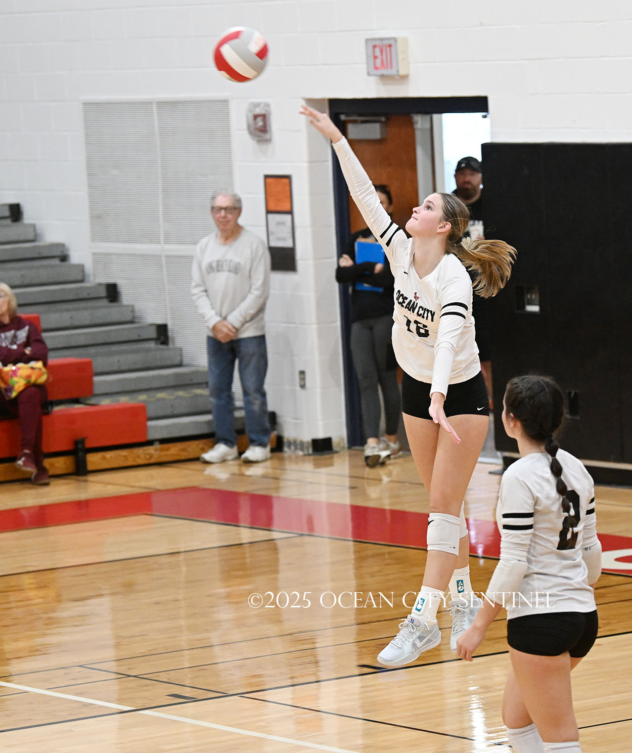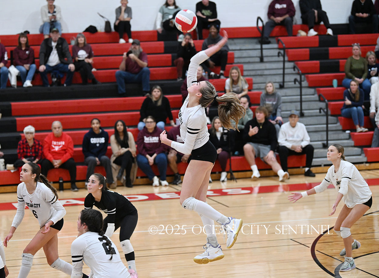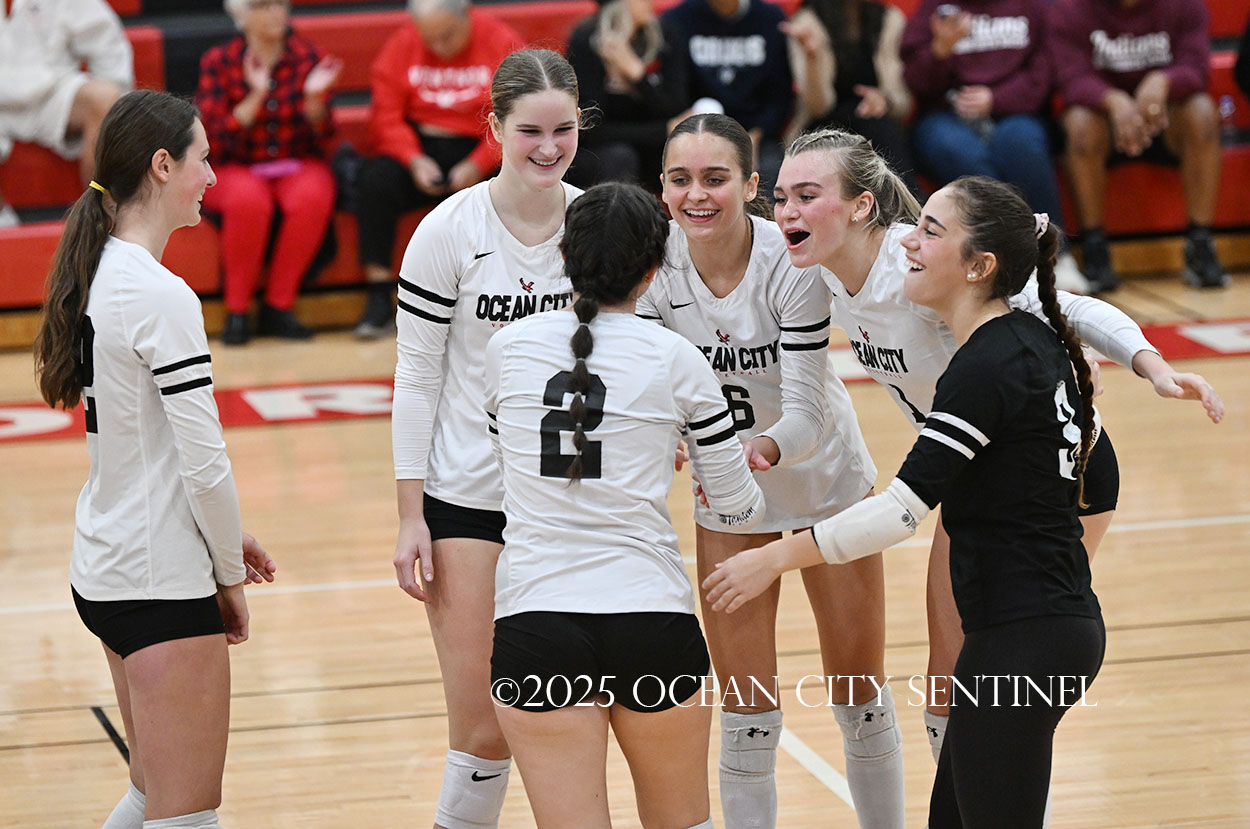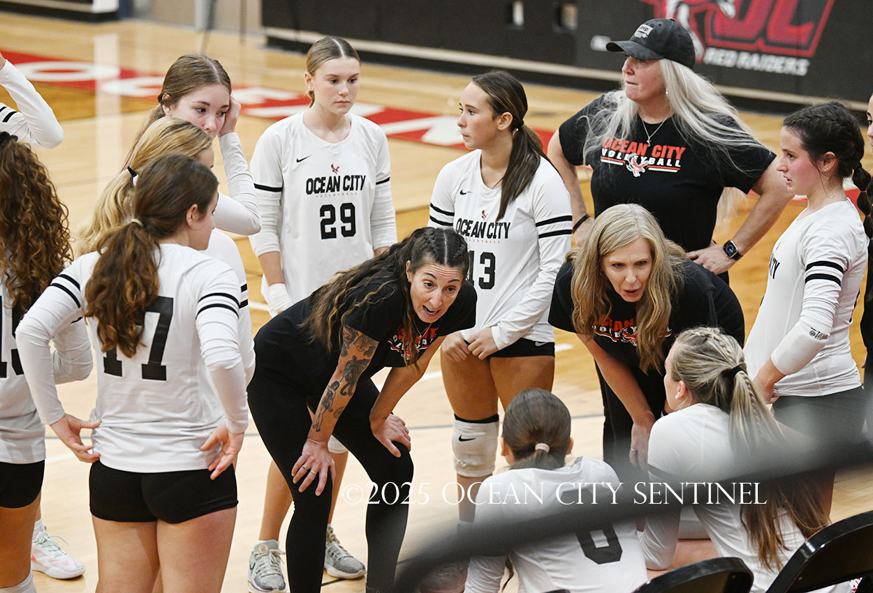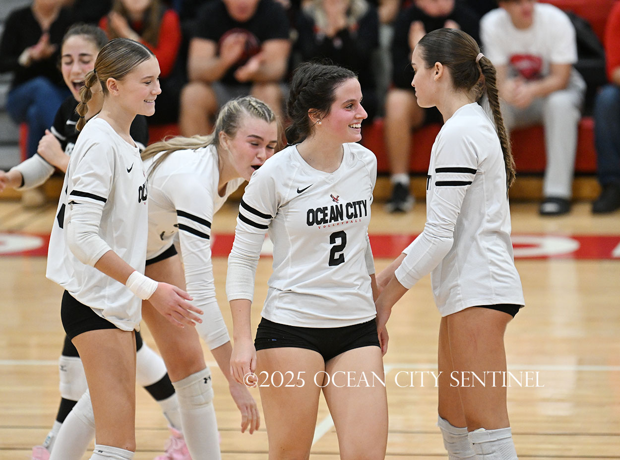 Toms River South started strong in the third set, leading early 6-2 before the Red Raiders tied at 6-6. Ocean City took the lead for good at 12-11. TRS got within a point later, 14-13, but Ocean City held at 22-18 and then got five set points at 24-19 before winning 25-19.