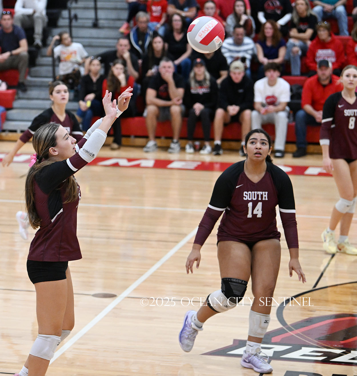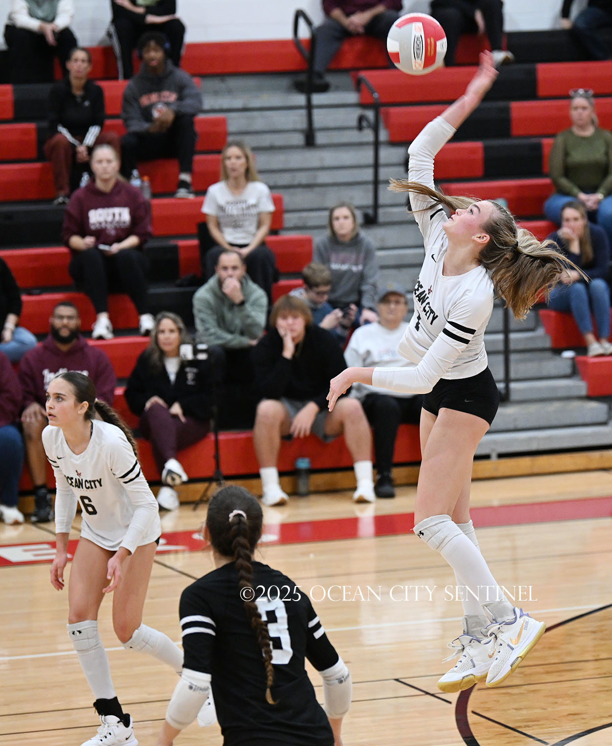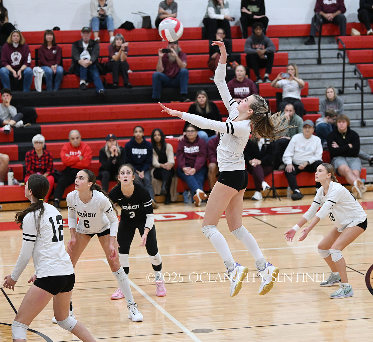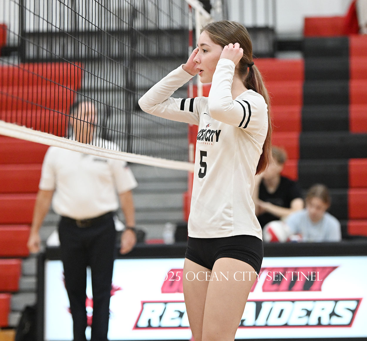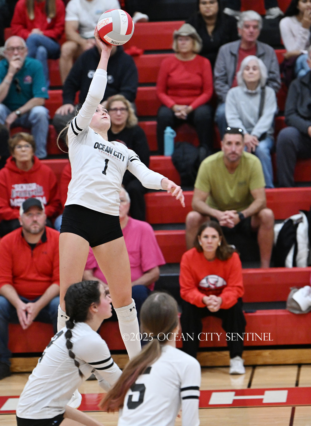 Toms River South started strong in the third set, leading early 6-2 before the Red Raiders tied at 6-6. Ocean City took the lead for good at 12-11. TRS got within a point later, 14-13, but Ocean City held at 22-18 and then got five set points at 24-19 before winning 25-19.