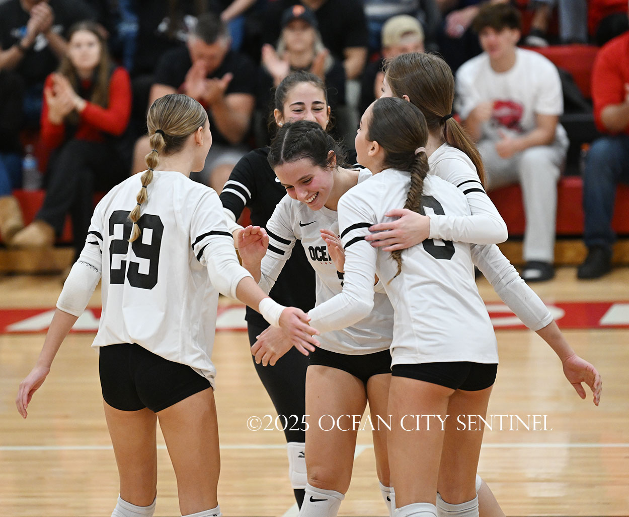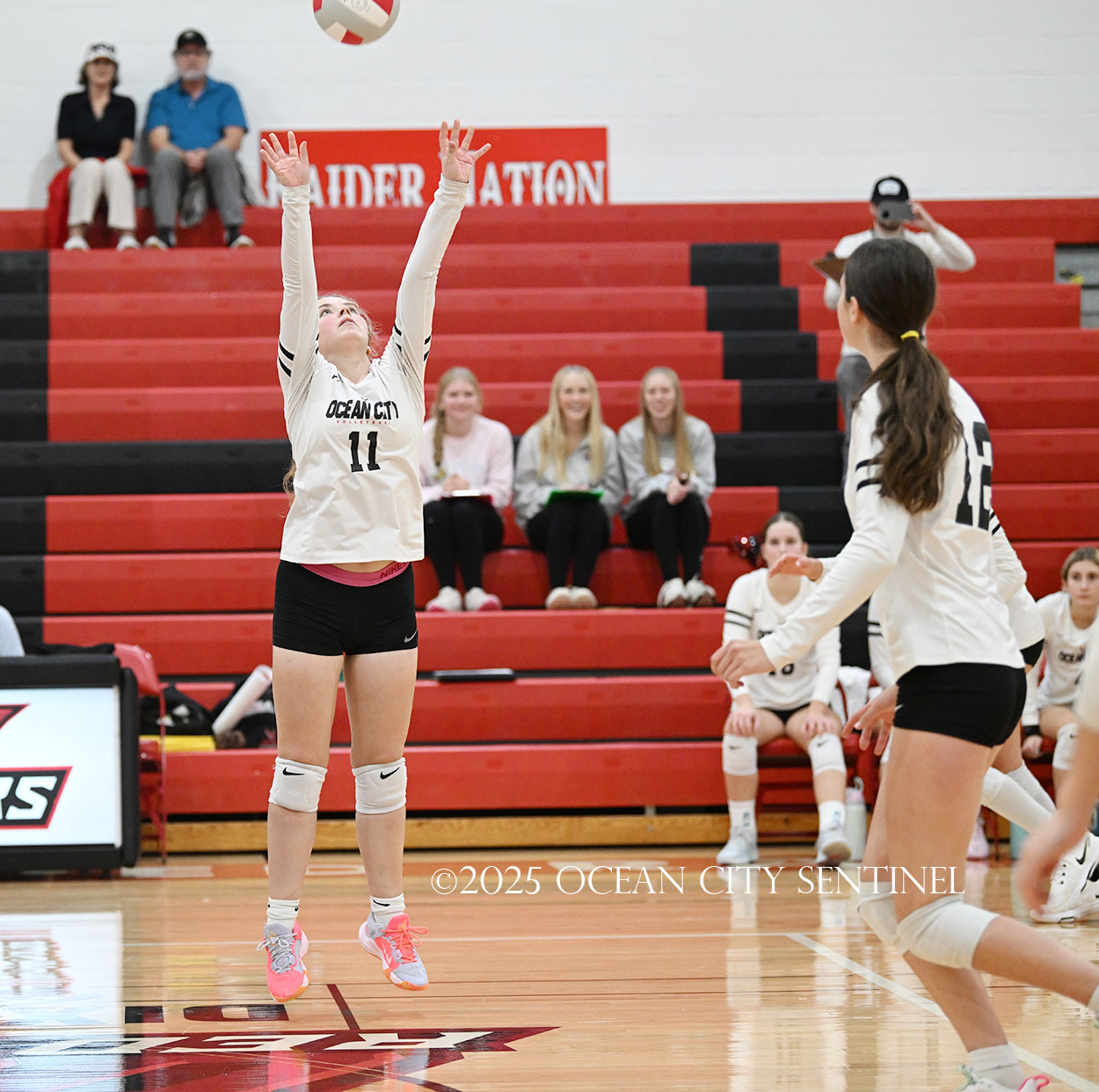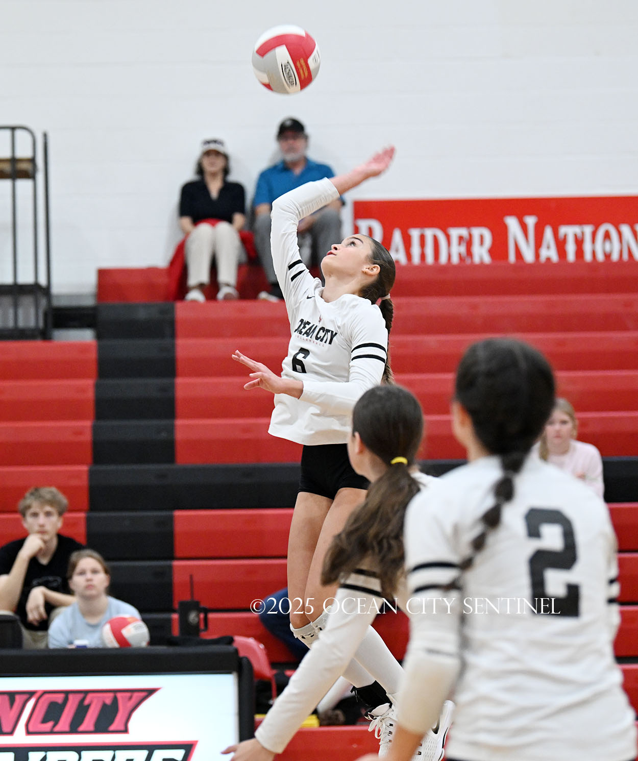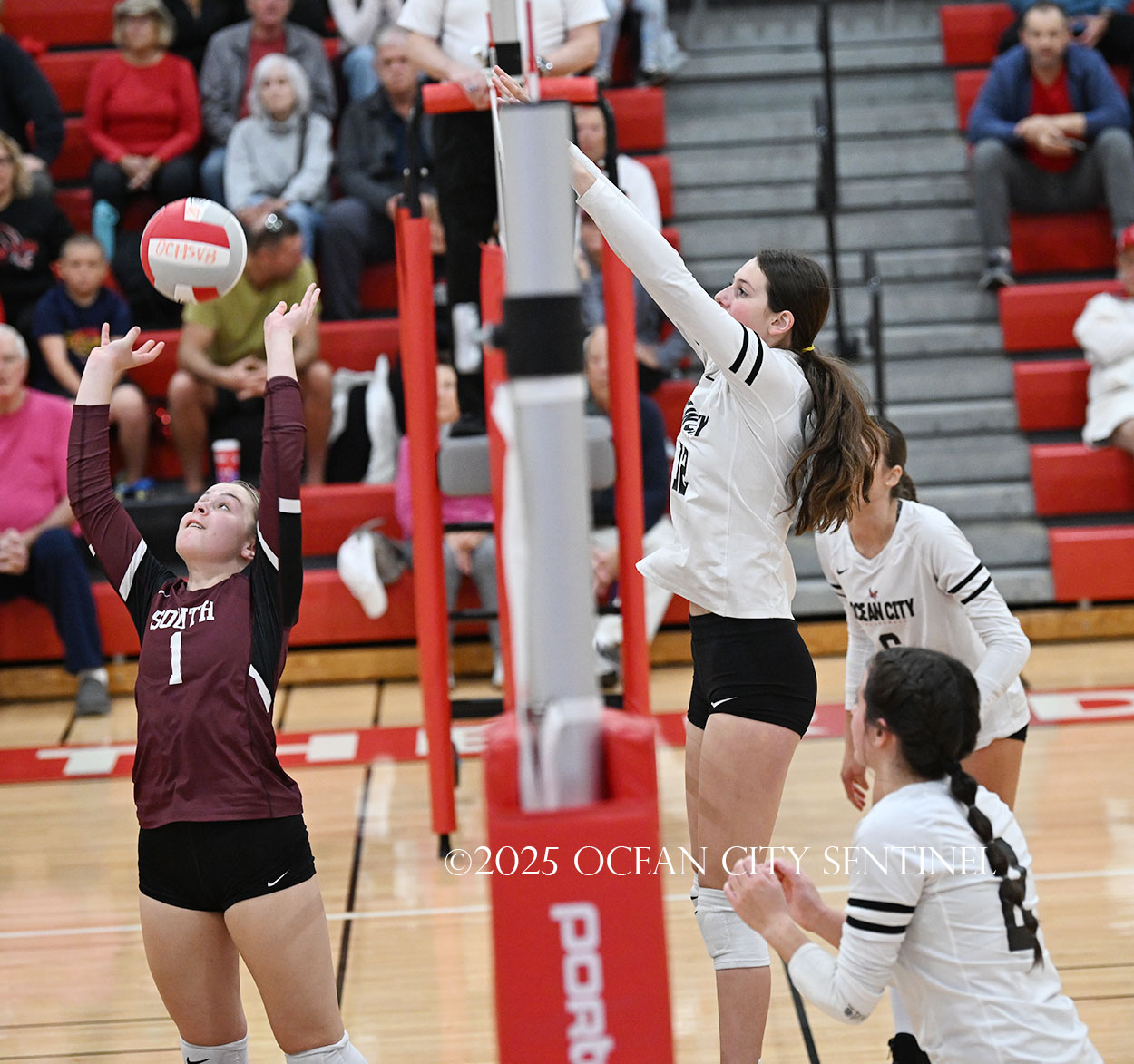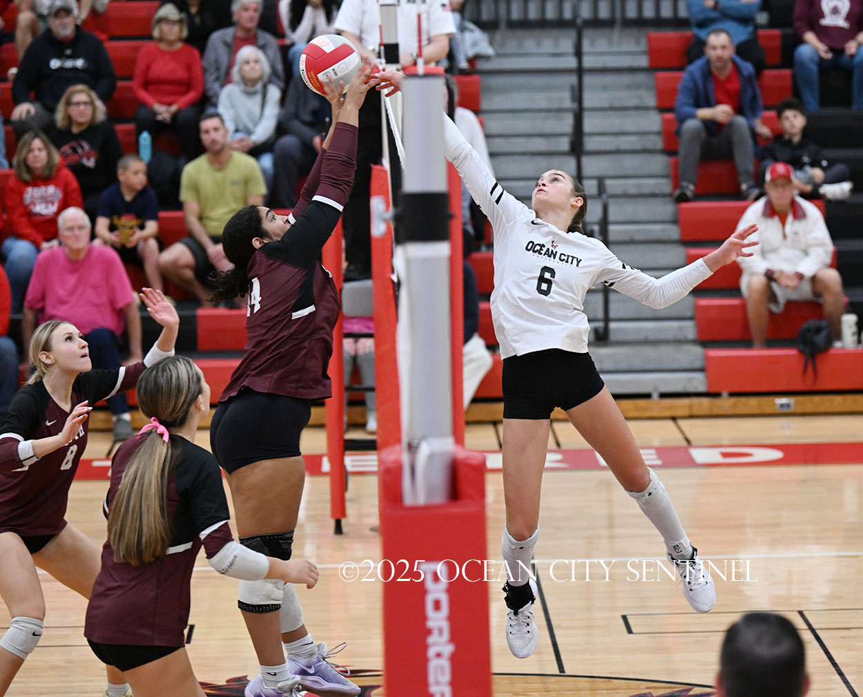 Toms River South started strong in the third set, leading early 6-2 before the Red Raiders tied at 6-6. Ocean City took the lead for good at 12-11. TRS got within a point later, 14-13, but Ocean City held at 22-18 and then got five set points at 24-19 before winning 25-19.
