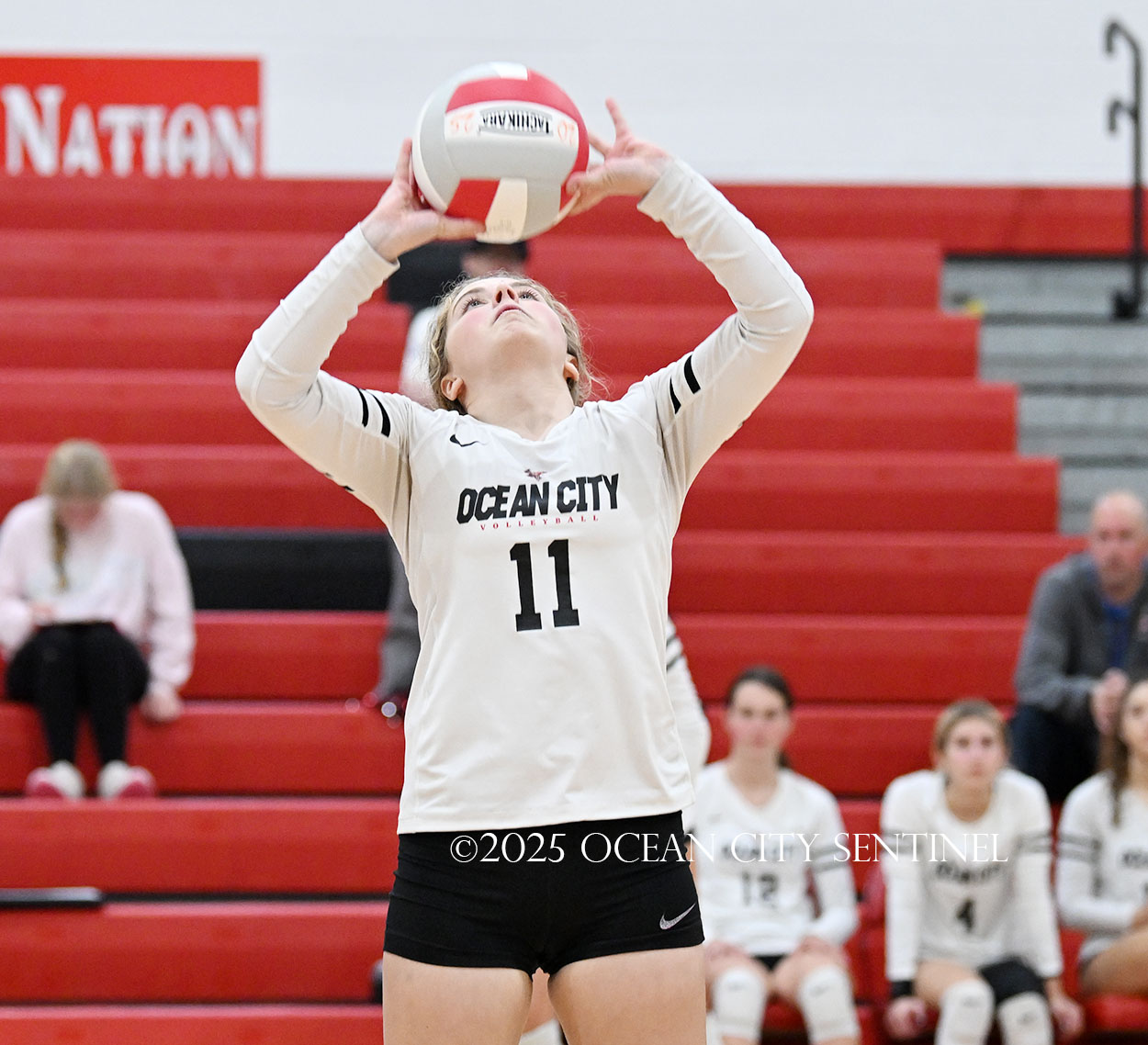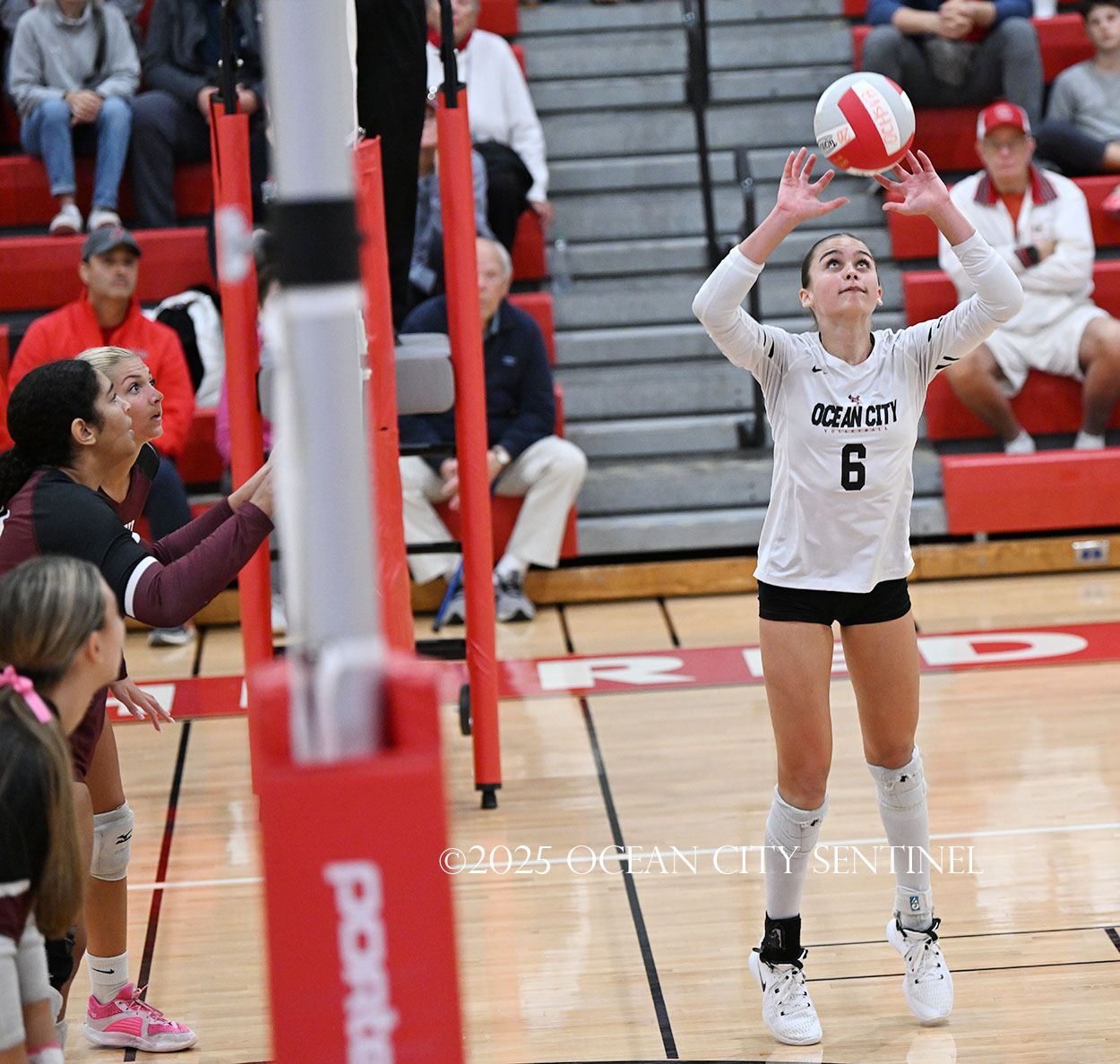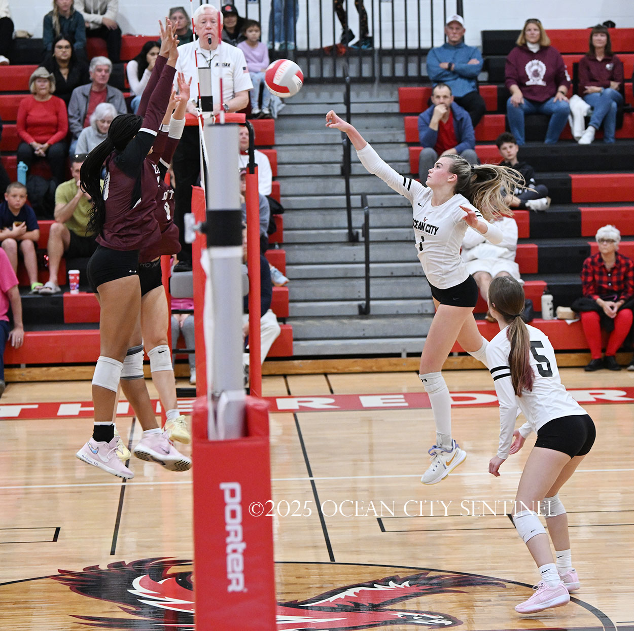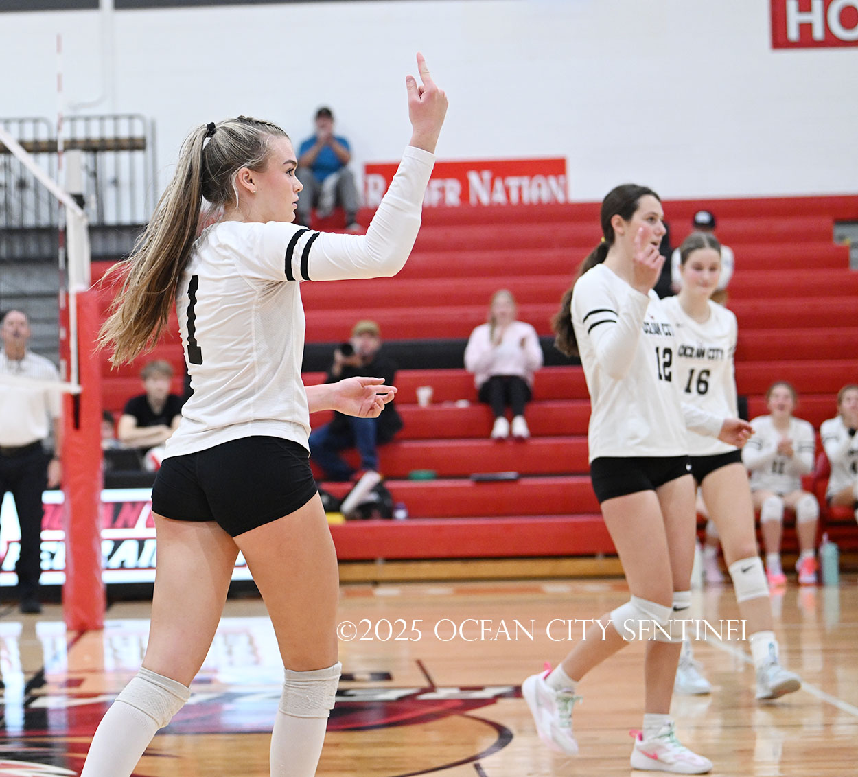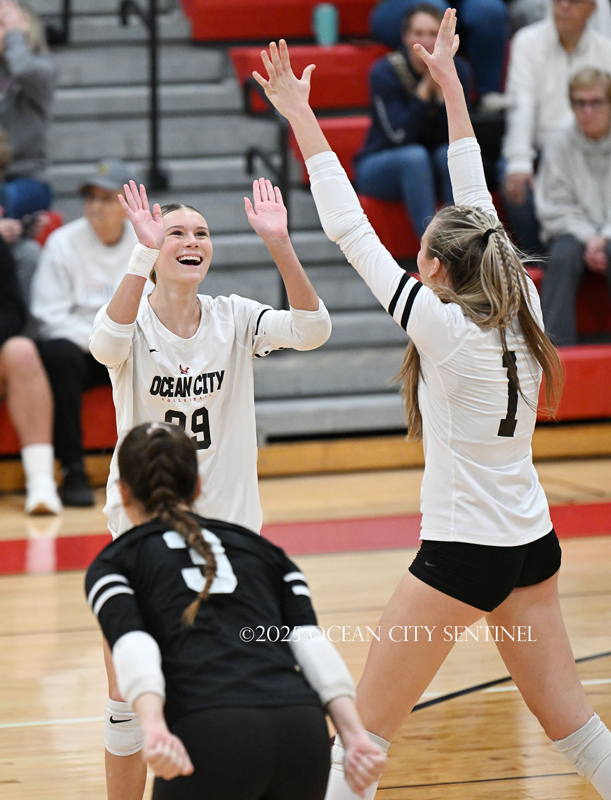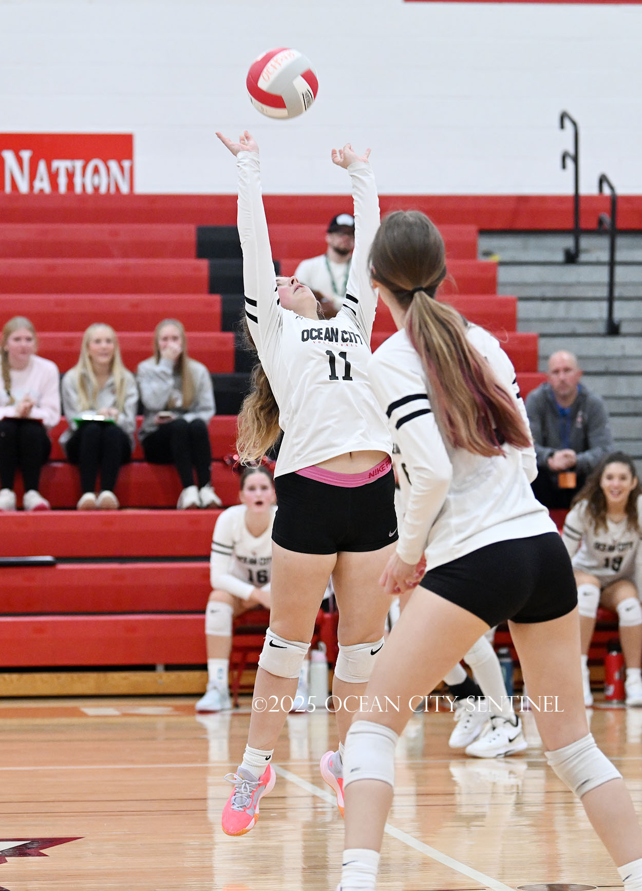 Toms River South started strong in the third set, leading early 6-2 before the Red Raiders tied at 6-6. Ocean City took the lead for good at 12-11. TRS got within a point later, 14-13, but Ocean City held at 22-18 and then got five set points at 24-19 before winning 25-19.