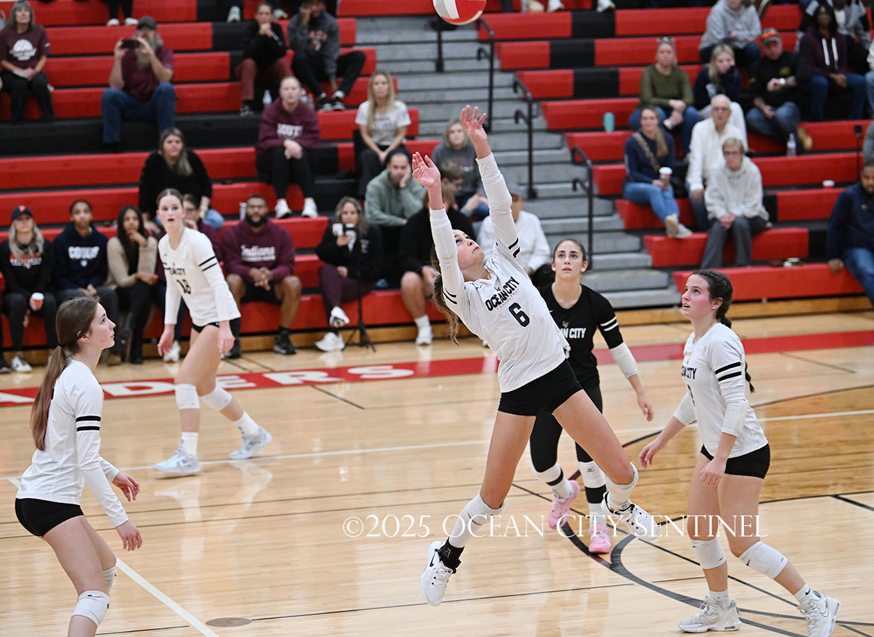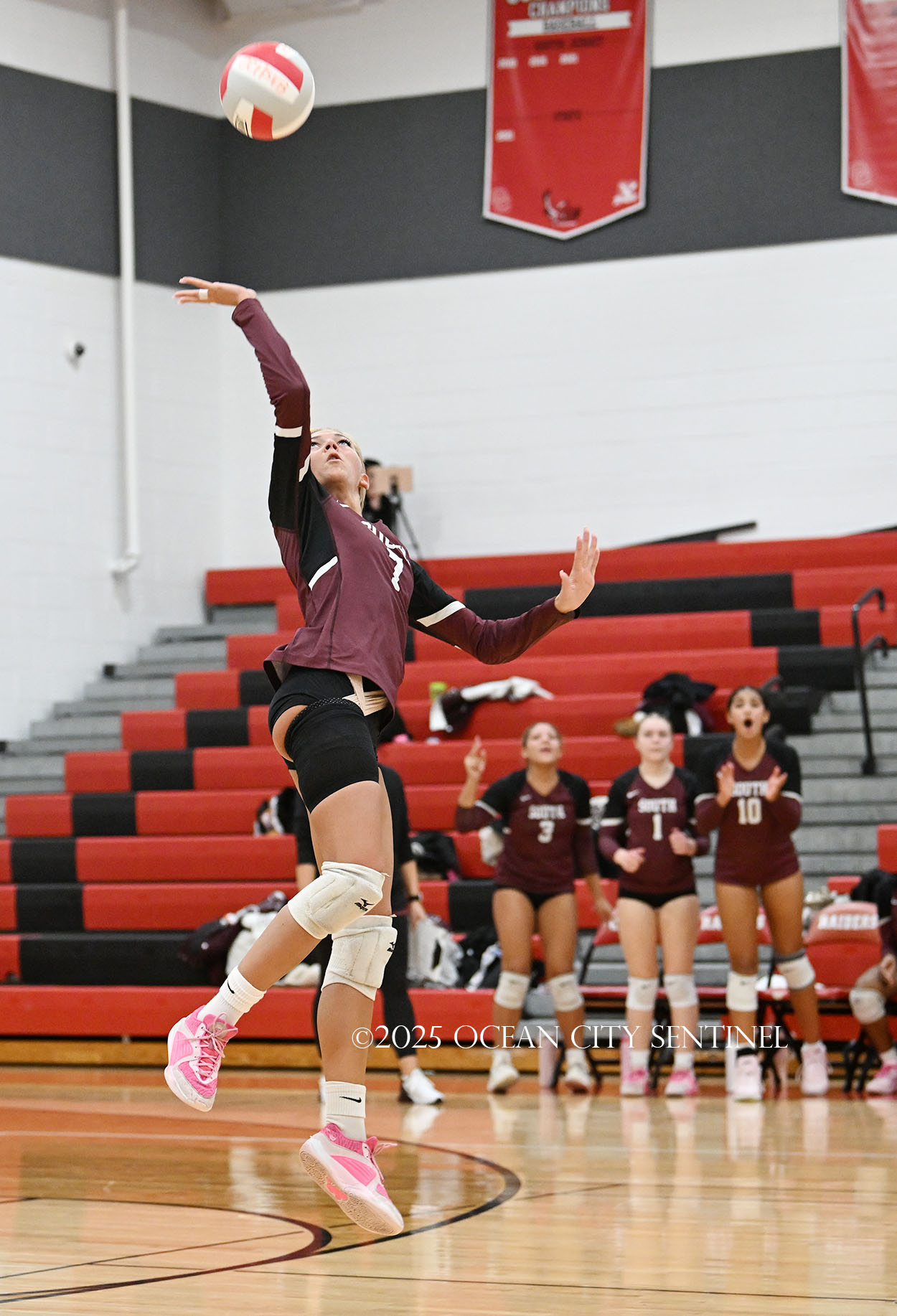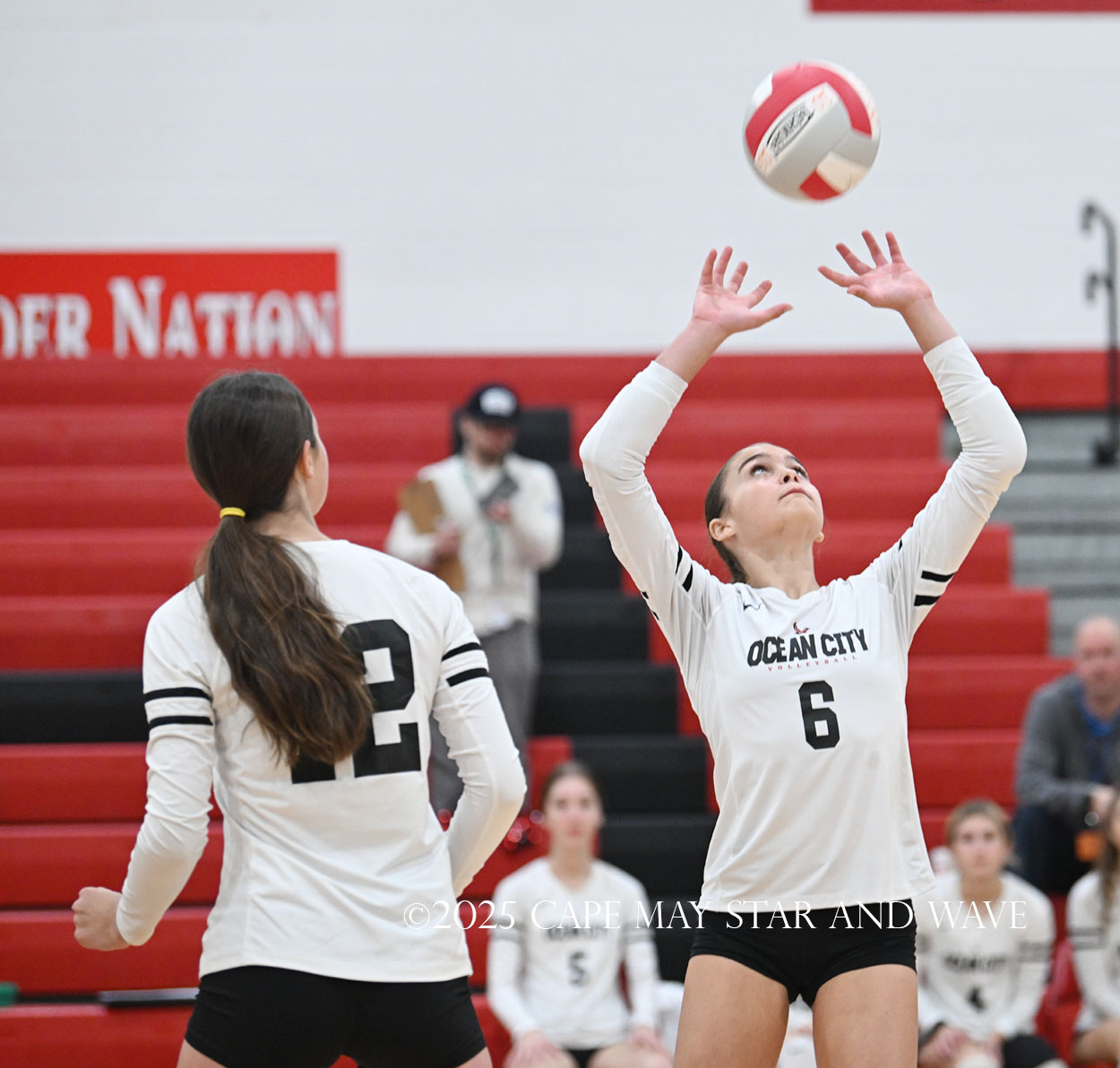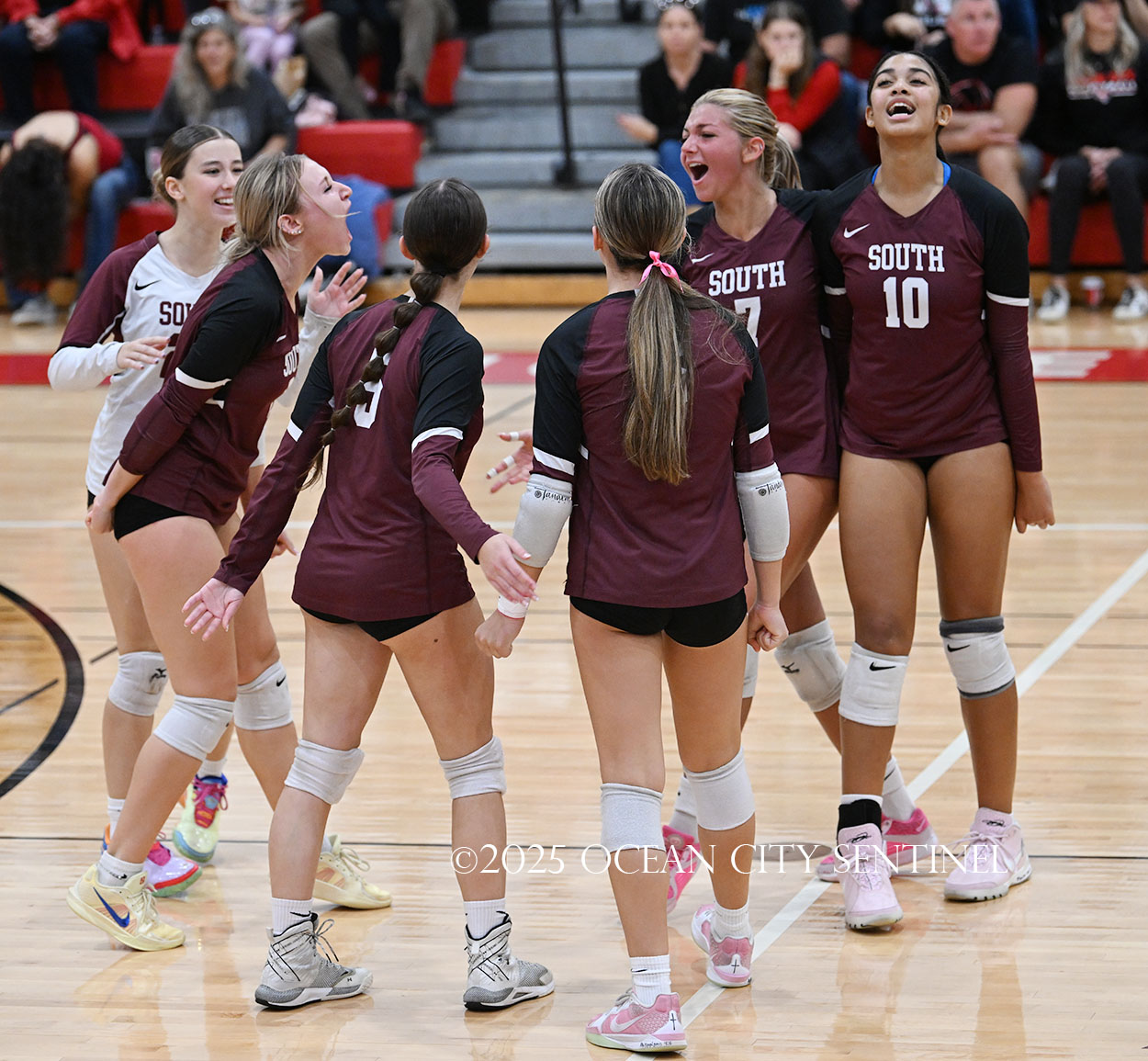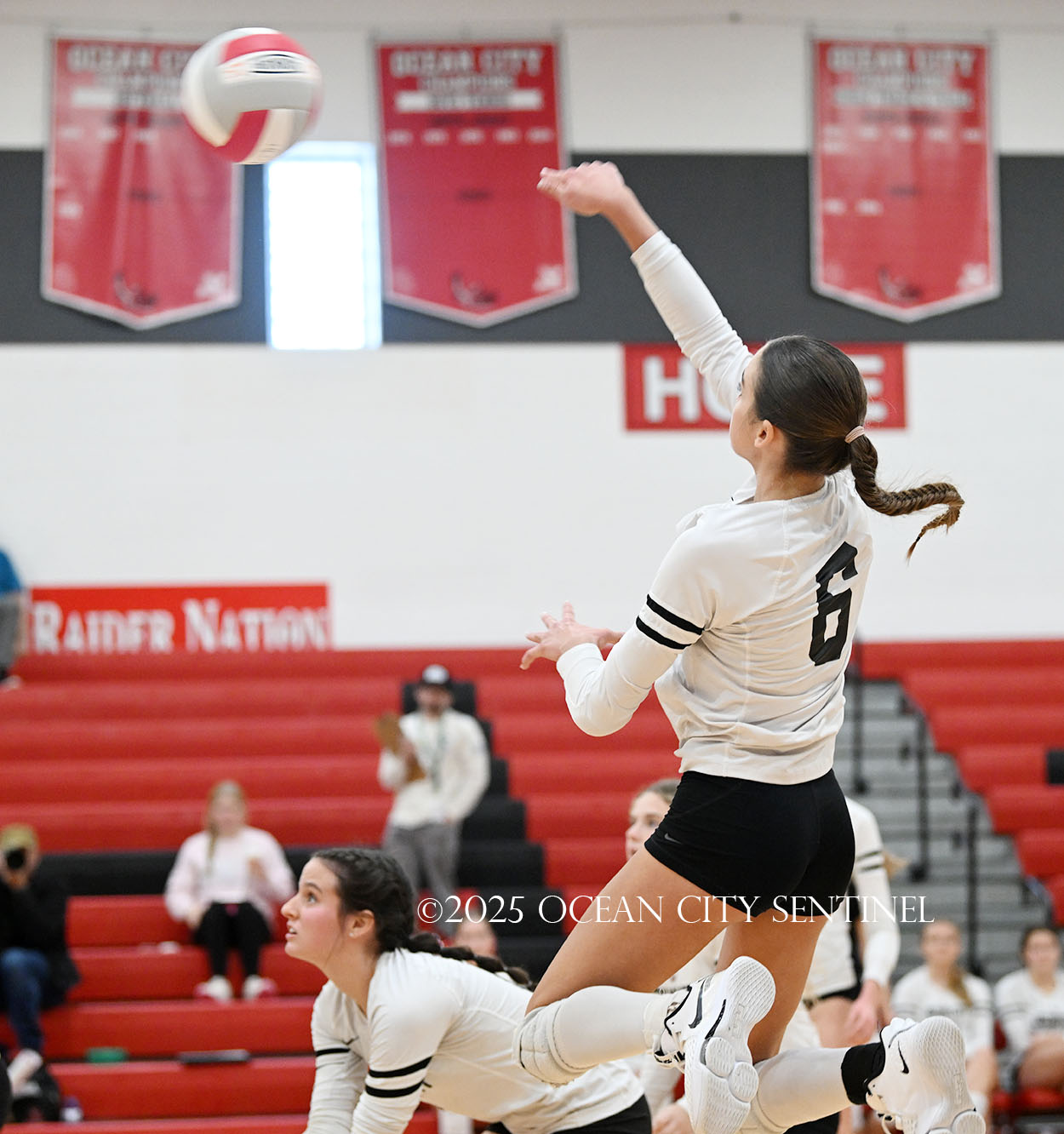 Toms River South started strong in the third set, leading early 6-2 before the Red Raiders tied at 6-6. Ocean City took the lead for good at 12-11. TRS got within a point later, 14-13, but Ocean City held at 22-18 and then got five set points at 24-19 before winning 25-19.