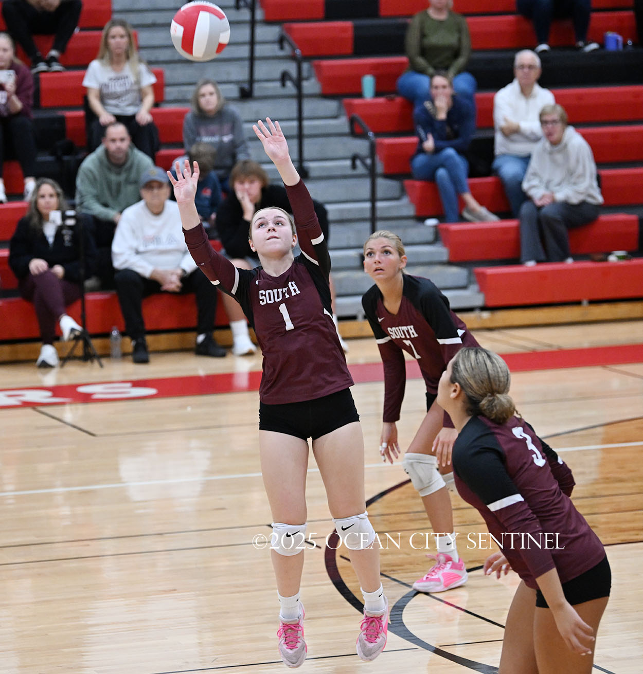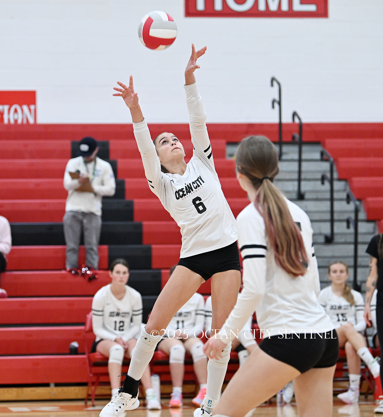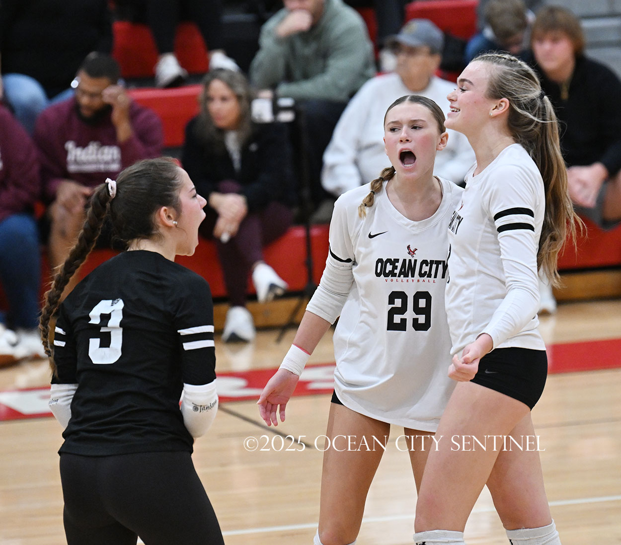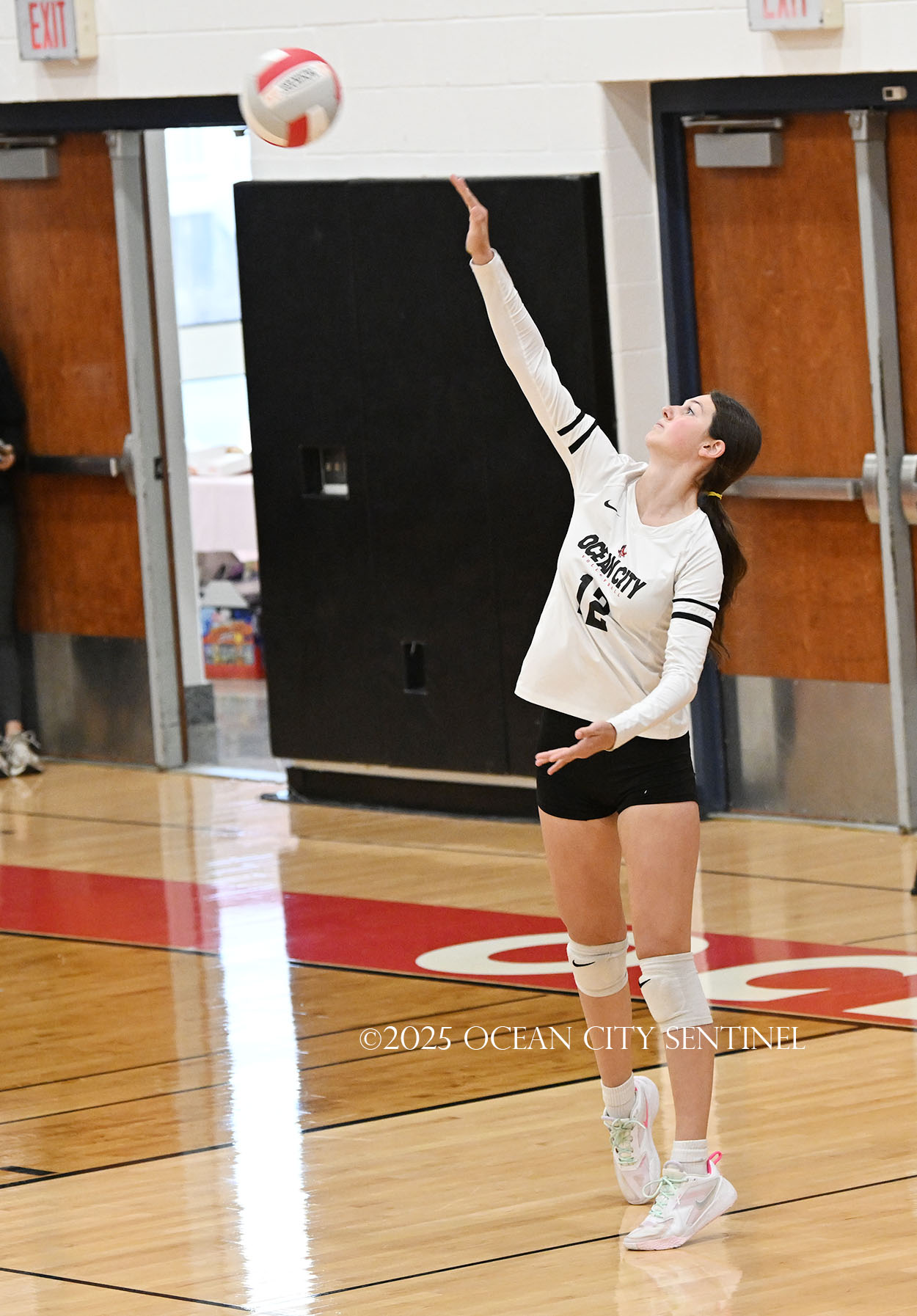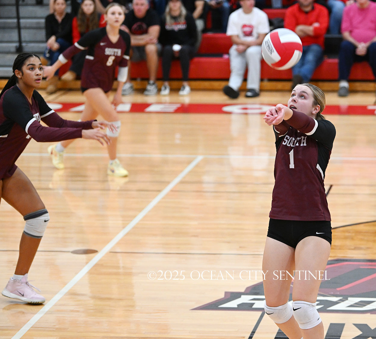 Toms River South started strong in the third set, leading early 6-2 before the Red Raiders tied at 6-6. Ocean City took the lead for good at 12-11. TRS got within a point later, 14-13, but Ocean City held at 22-18 and then got five set points at 24-19 before winning 25-19.