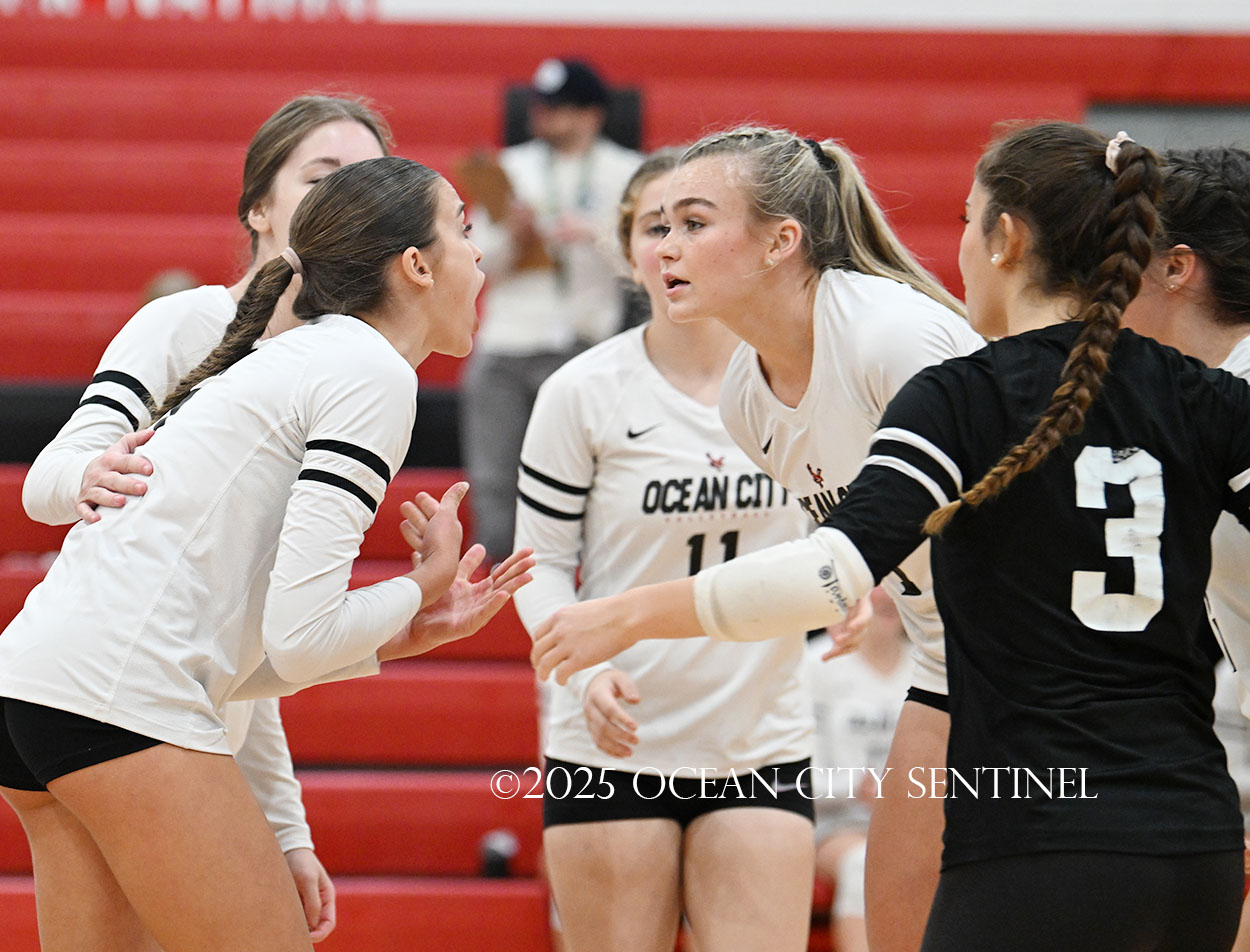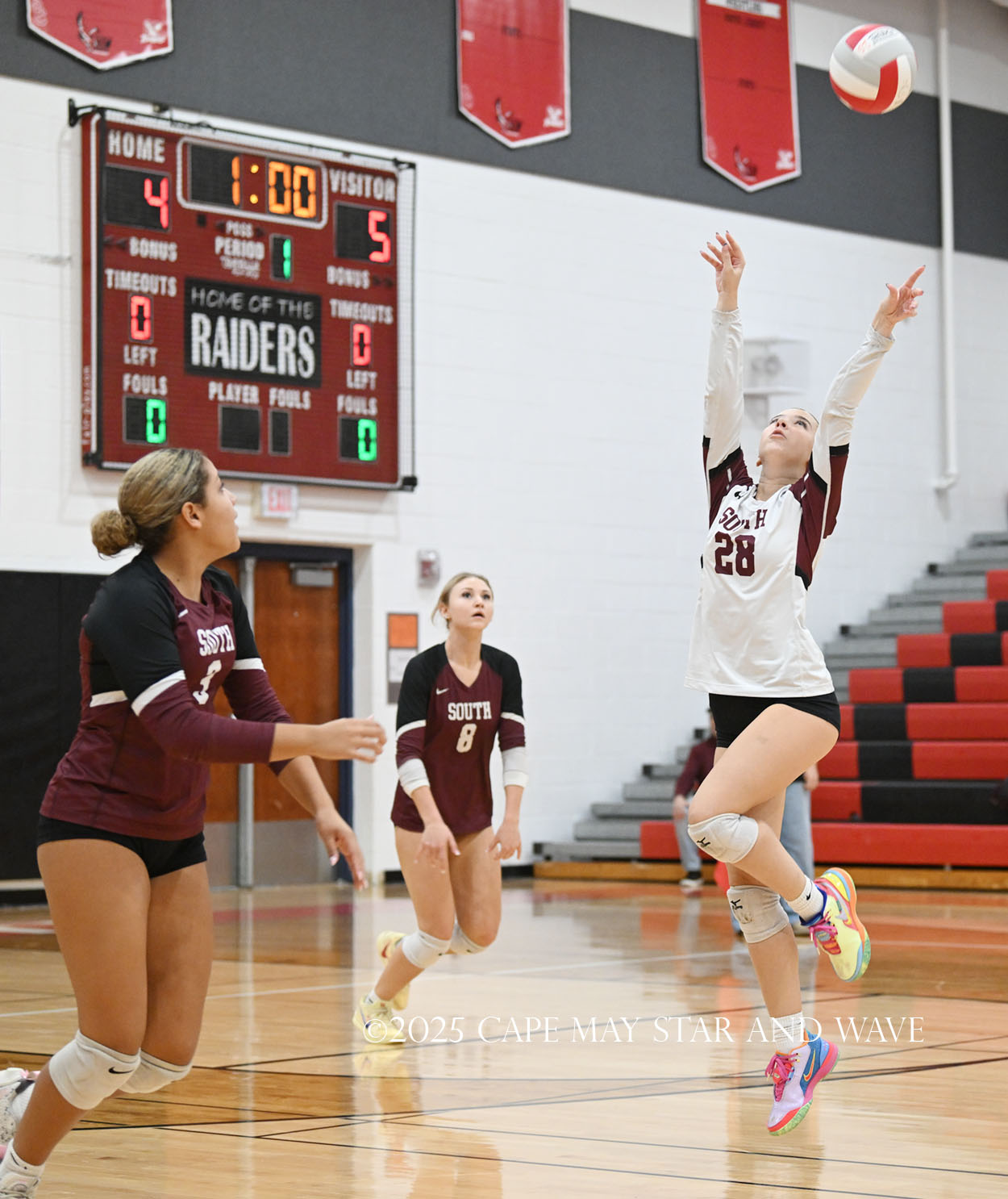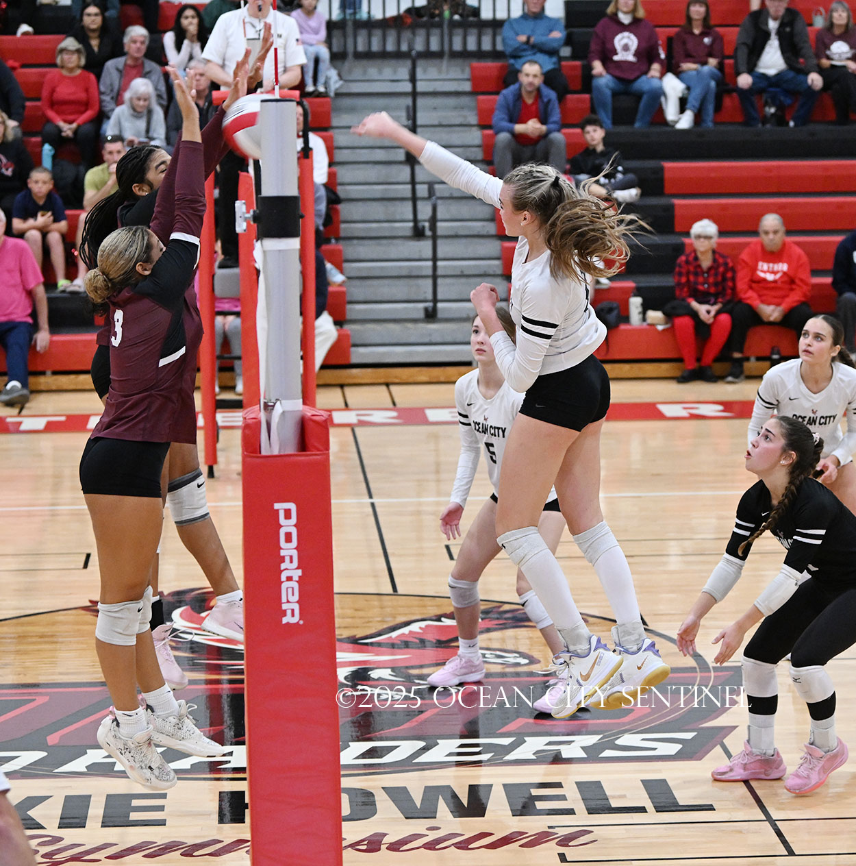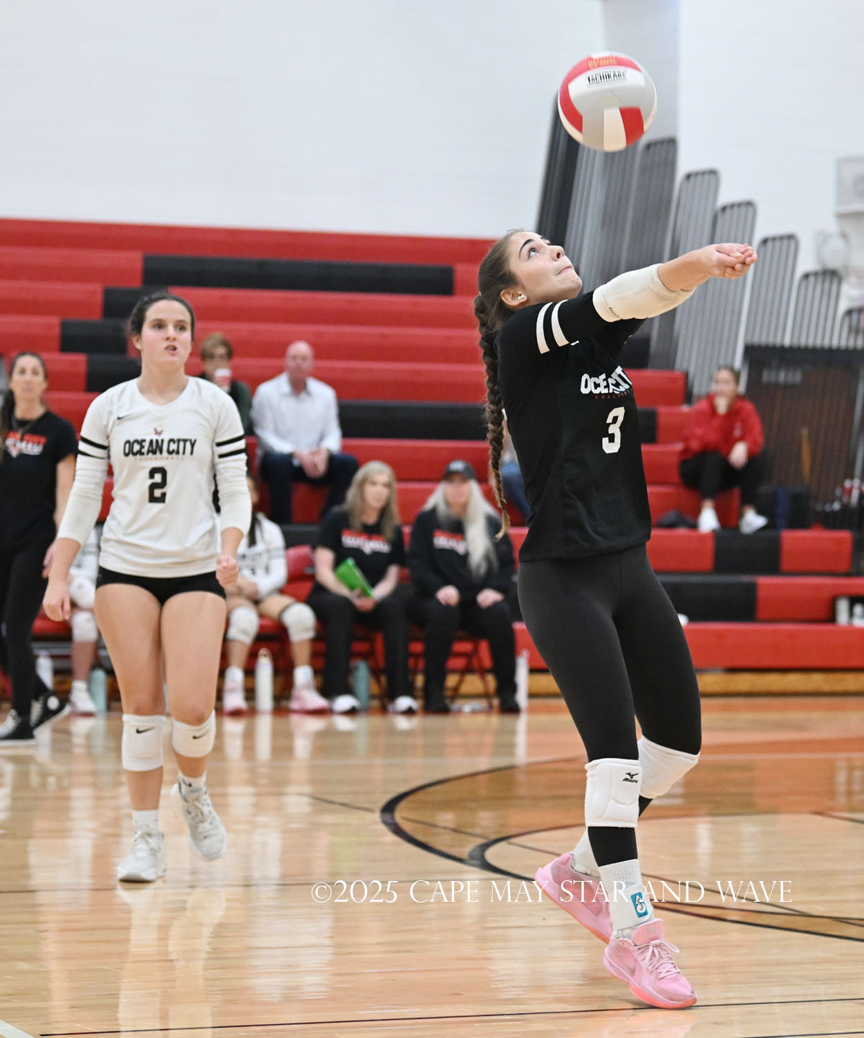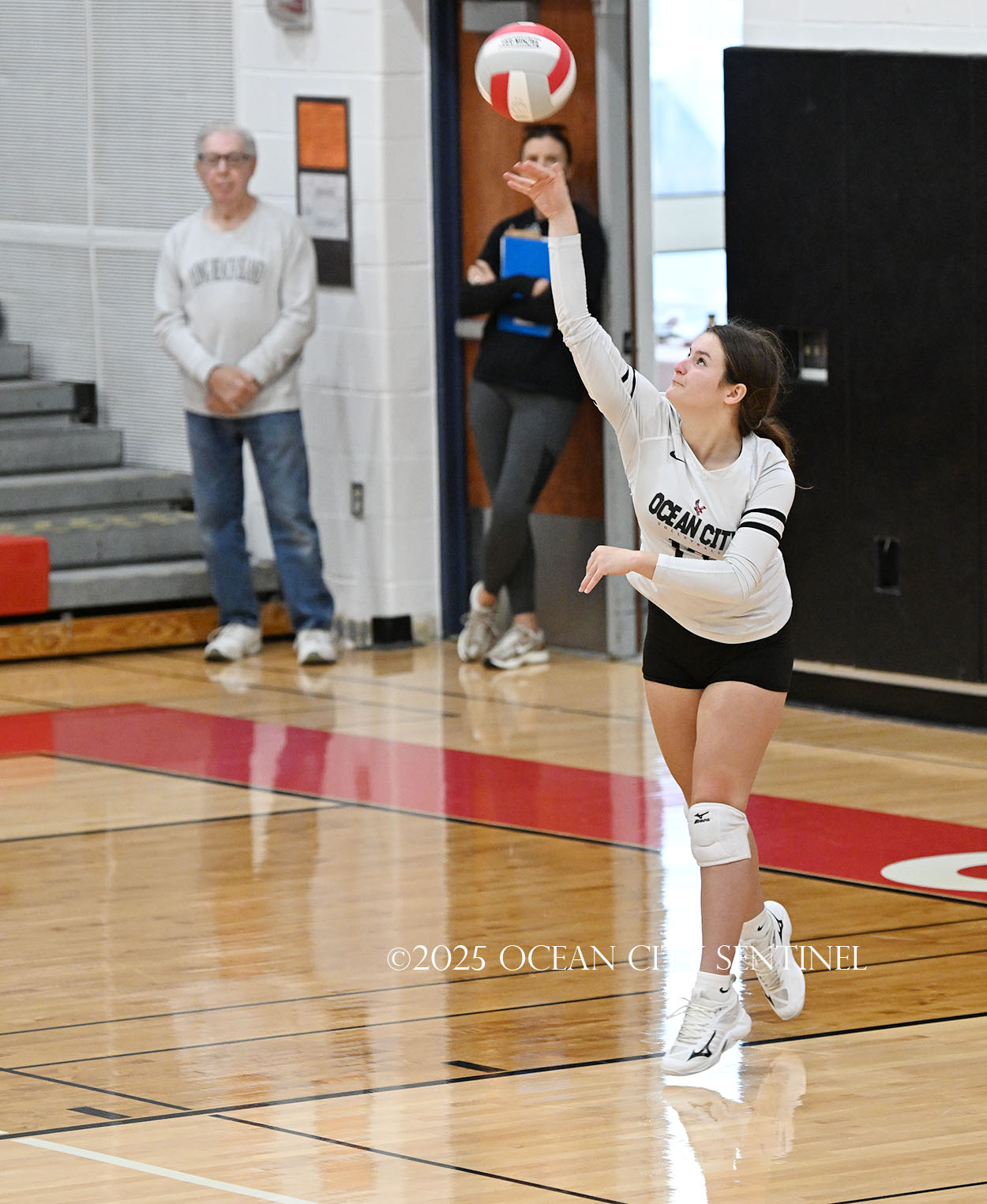 Toms River South started strong in the third set, leading early 6-2 before the Red Raiders tied at 6-6. Ocean City took the lead for good at 12-11. TRS got within a point later, 14-13, but Ocean City held at 22-18 and then got five set points at 24-19 before winning 25-19.