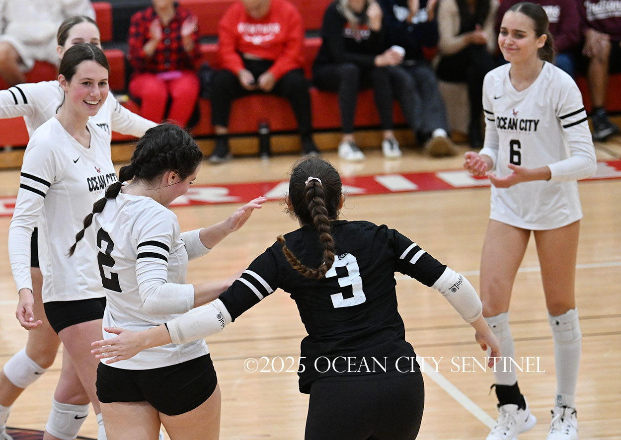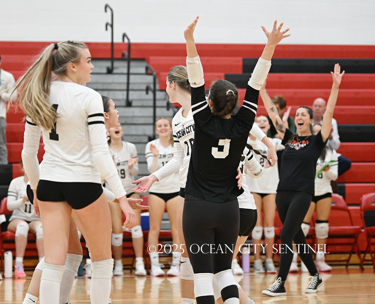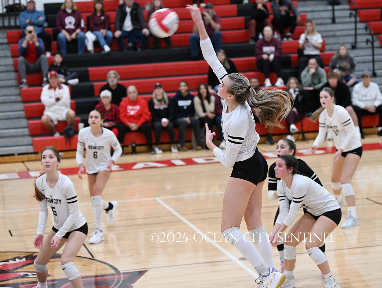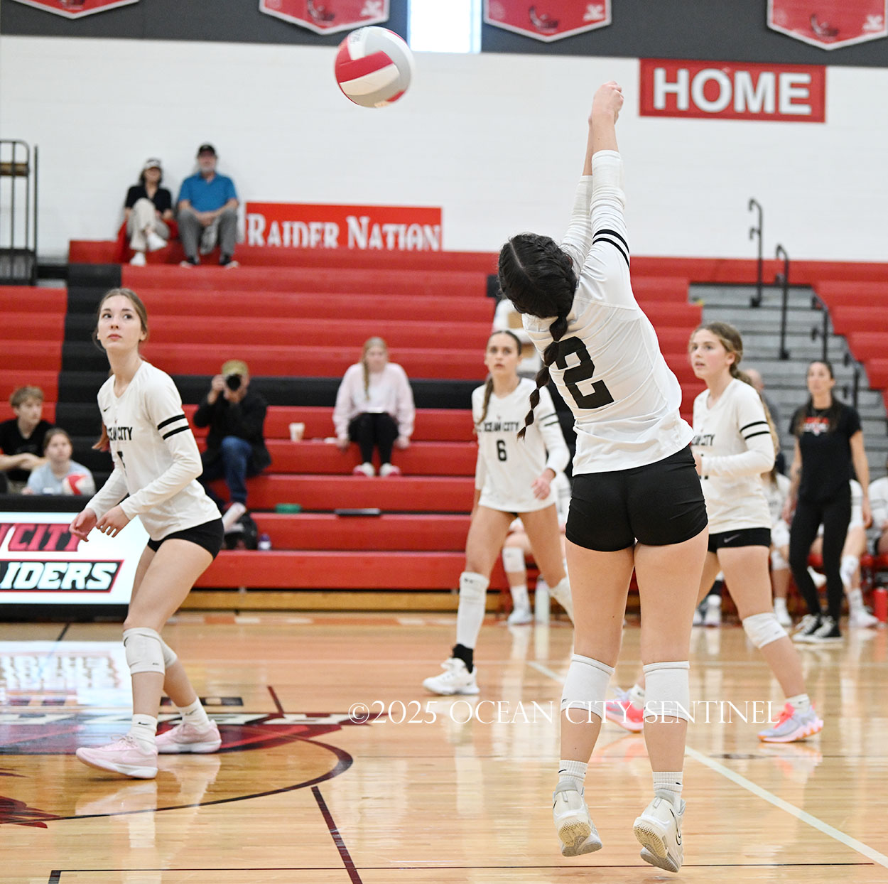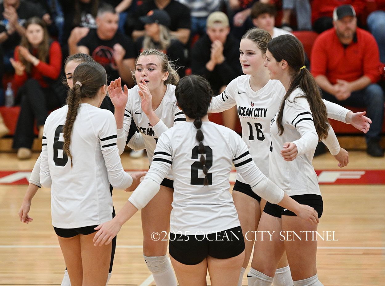 Toms River South started strong in the third set, leading early 6-2 before the Red Raiders tied at 6-6. Ocean City took the lead for good at 12-11. TRS got within a point later, 14-13, but Ocean City held at 22-18 and then got five set points at 24-19 before winning 25-19.