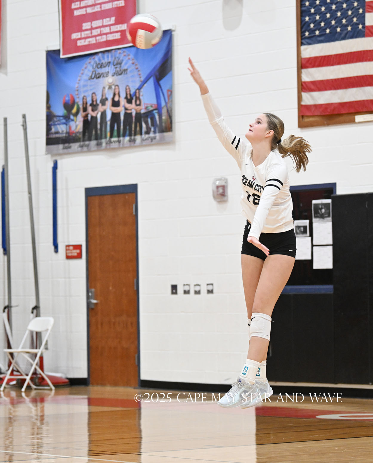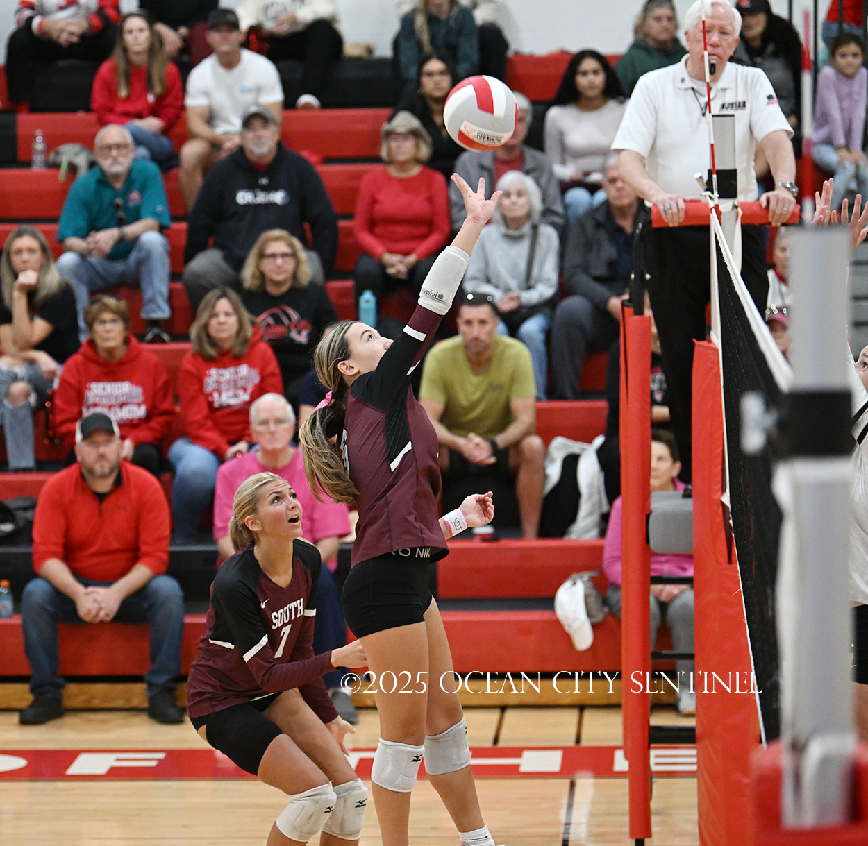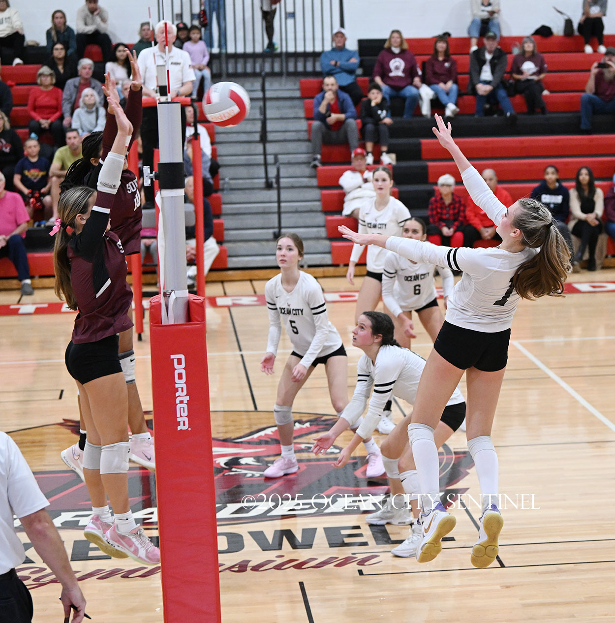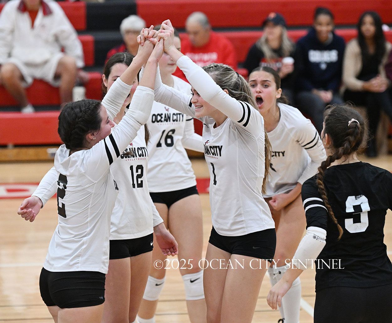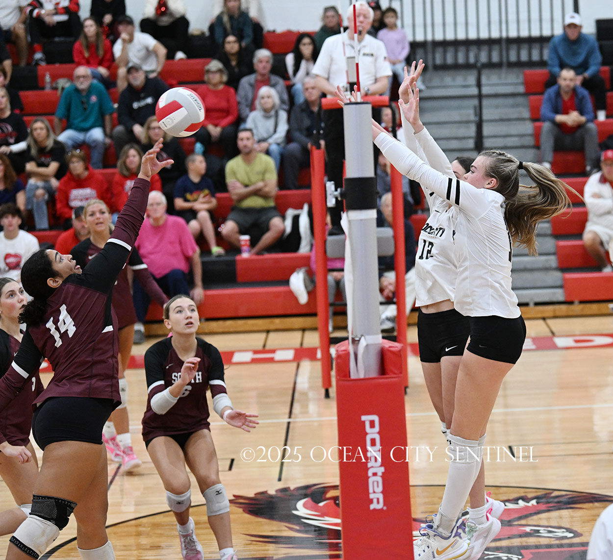 Toms River South started strong in the third set, leading early 6-2 before the Red Raiders tied at 6-6. Ocean City took the lead for good at 12-11. TRS got within a point later, 14-13, but Ocean City held at 22-18 and then got five set points at 24-19 before winning 25-19.