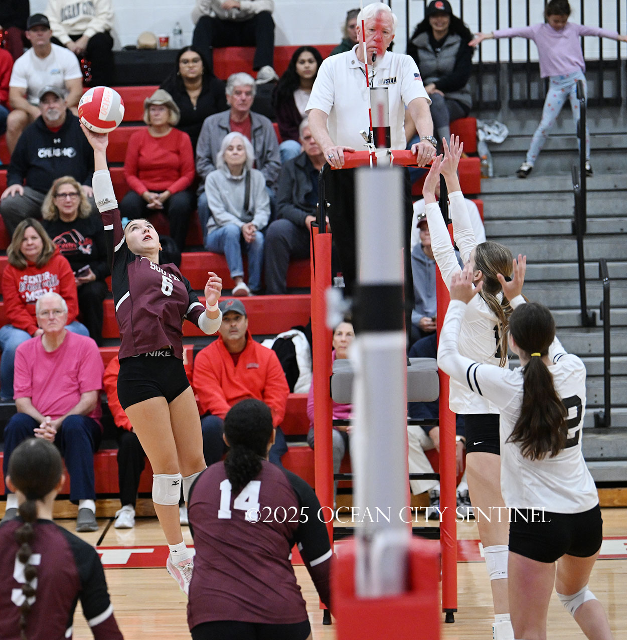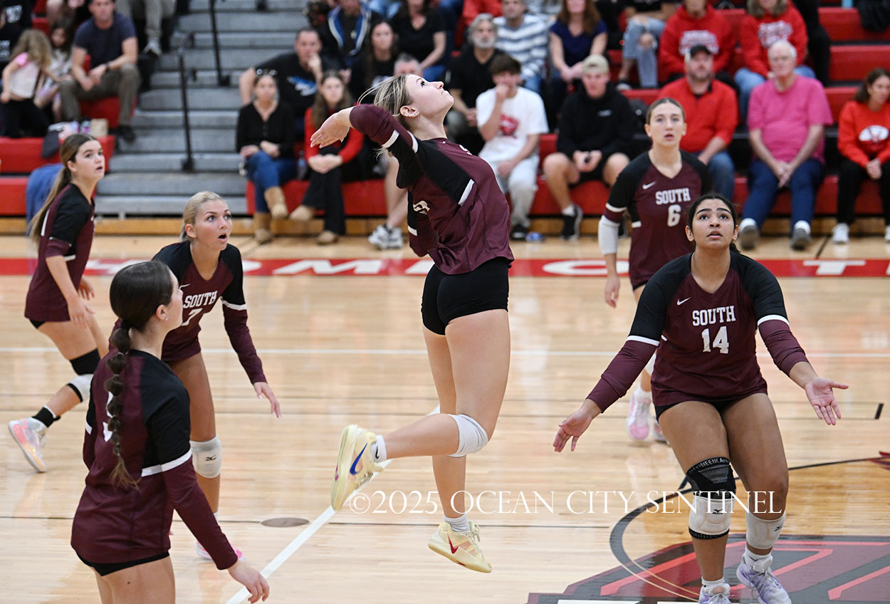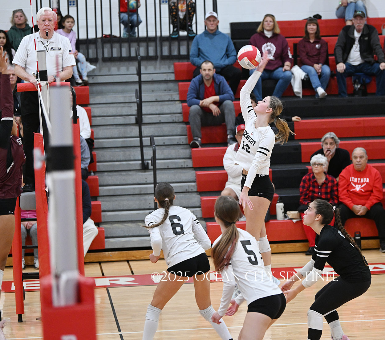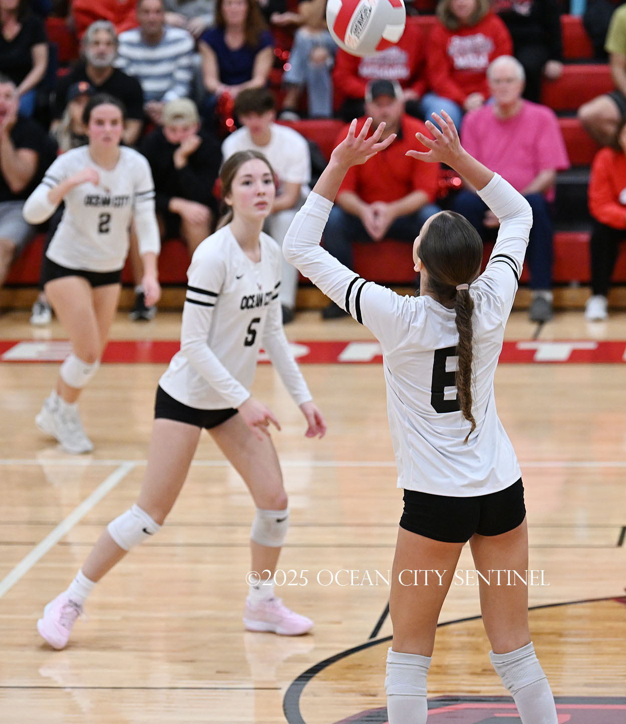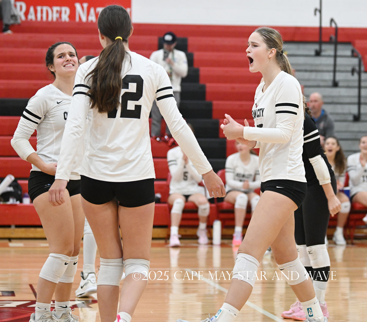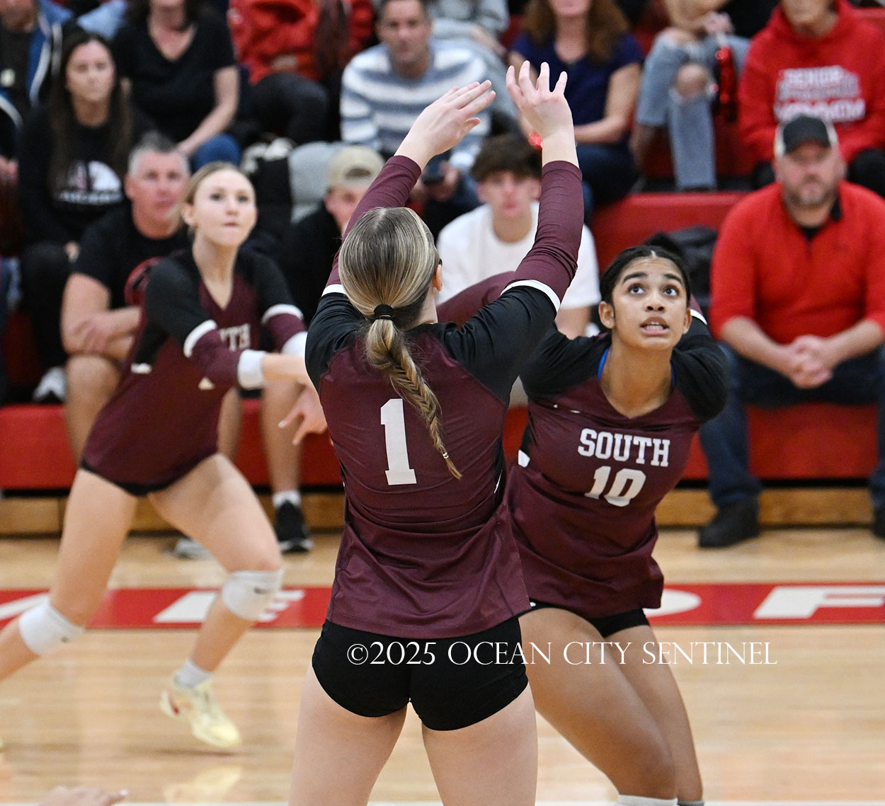 Toms River South started strong in the third set, leading early 6-2 before the Red Raiders tied at 6-6. Ocean City took the lead for good at 12-11. TRS got within a point later, 14-13, but Ocean City held at 22-18 and then got five set points at 24-19 before winning 25-19.
