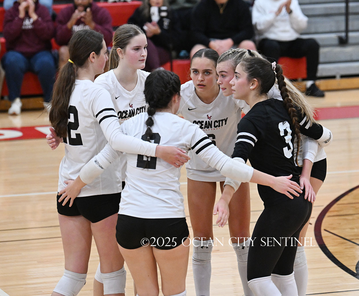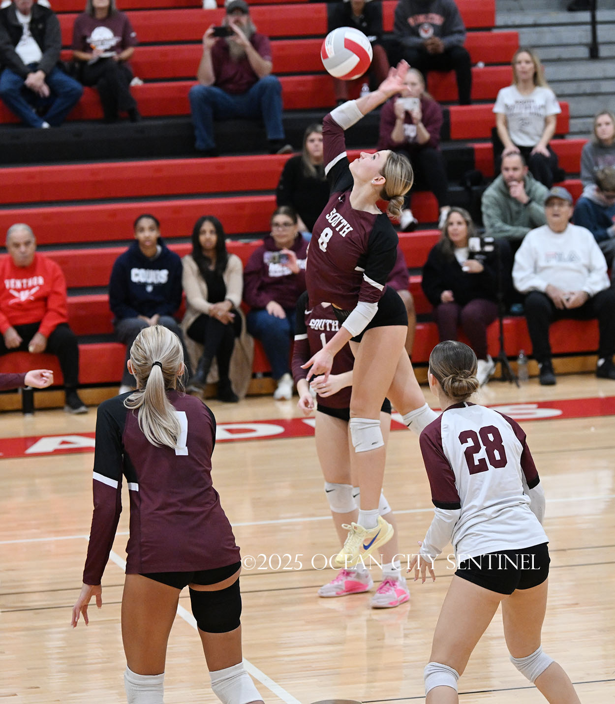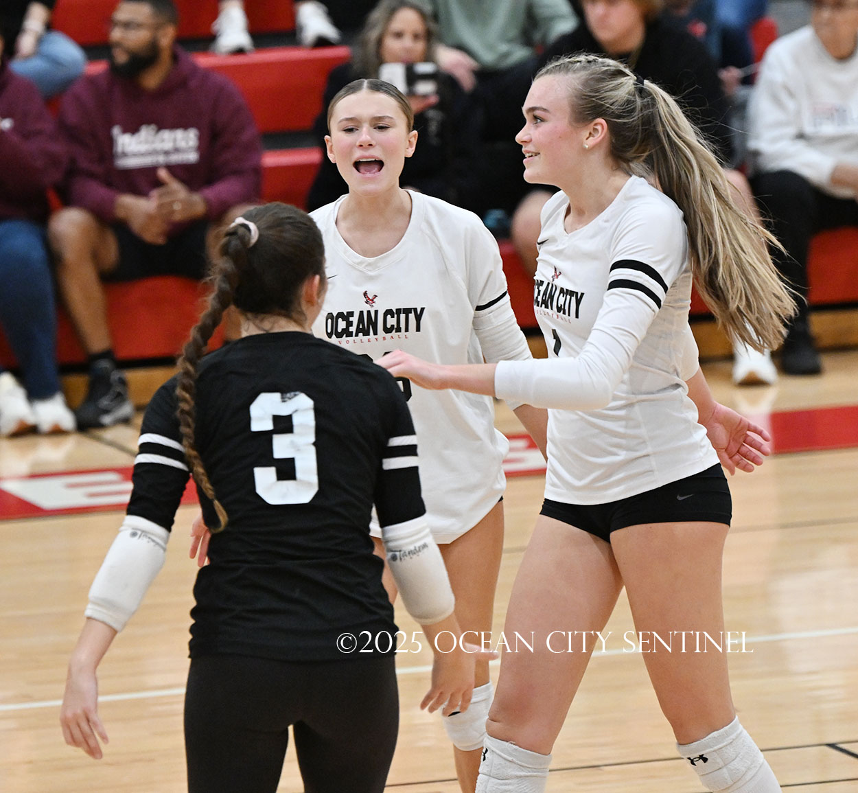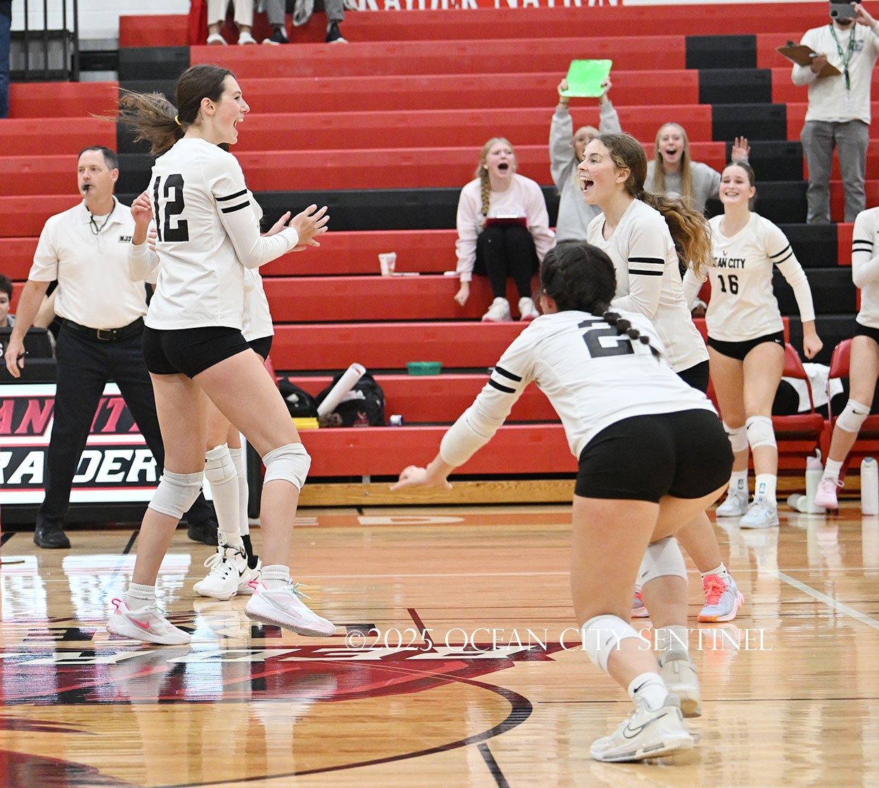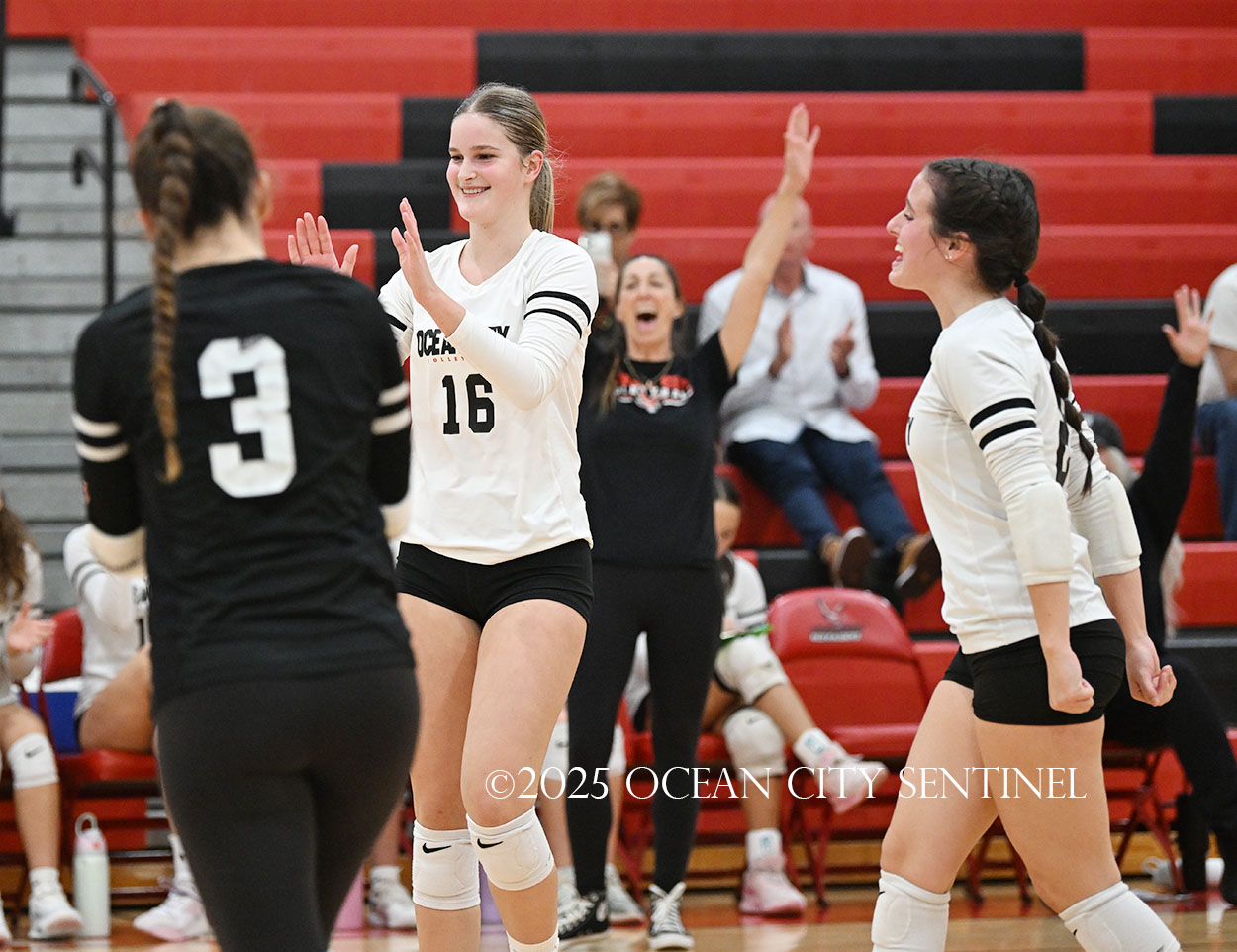 Toms River South started strong in the third set, leading early 6-2 before the Red Raiders tied at 6-6. Ocean City took the lead for good at 12-11. TRS got within a point later, 14-13, but Ocean City held at 22-18 and then got five set points at 24-19 before winning 25-19.