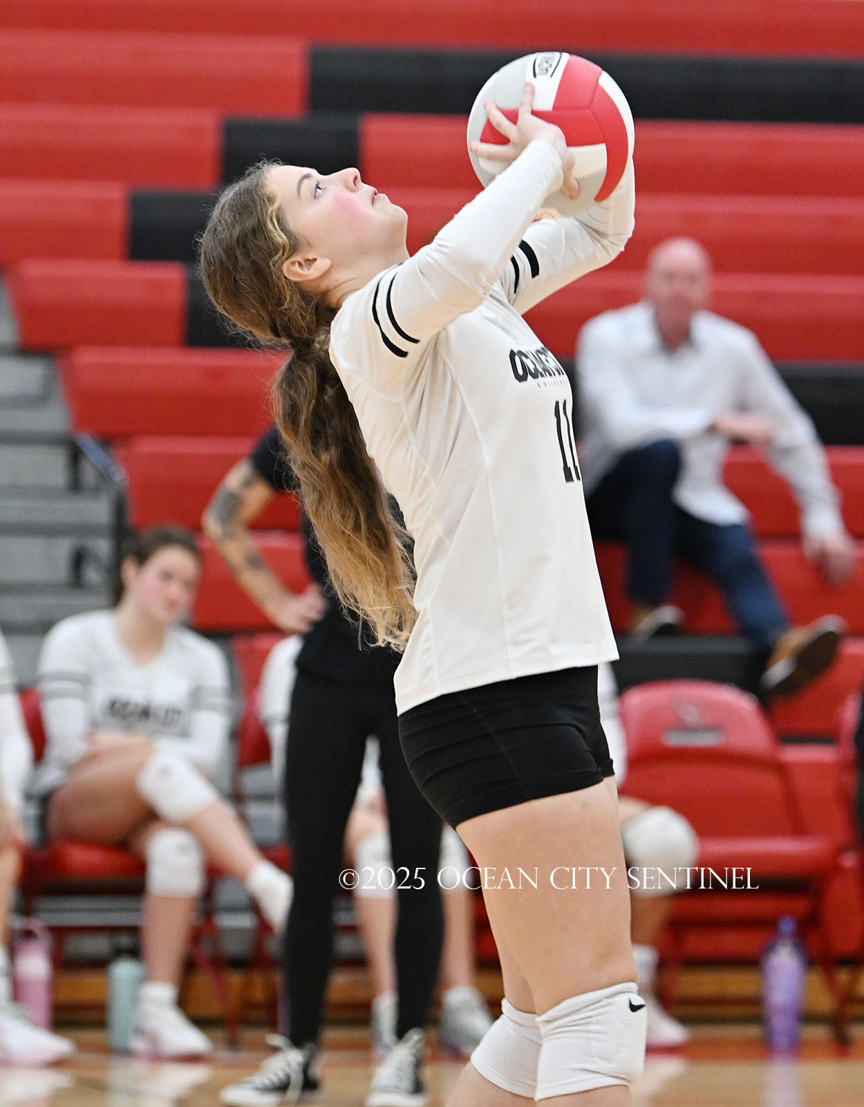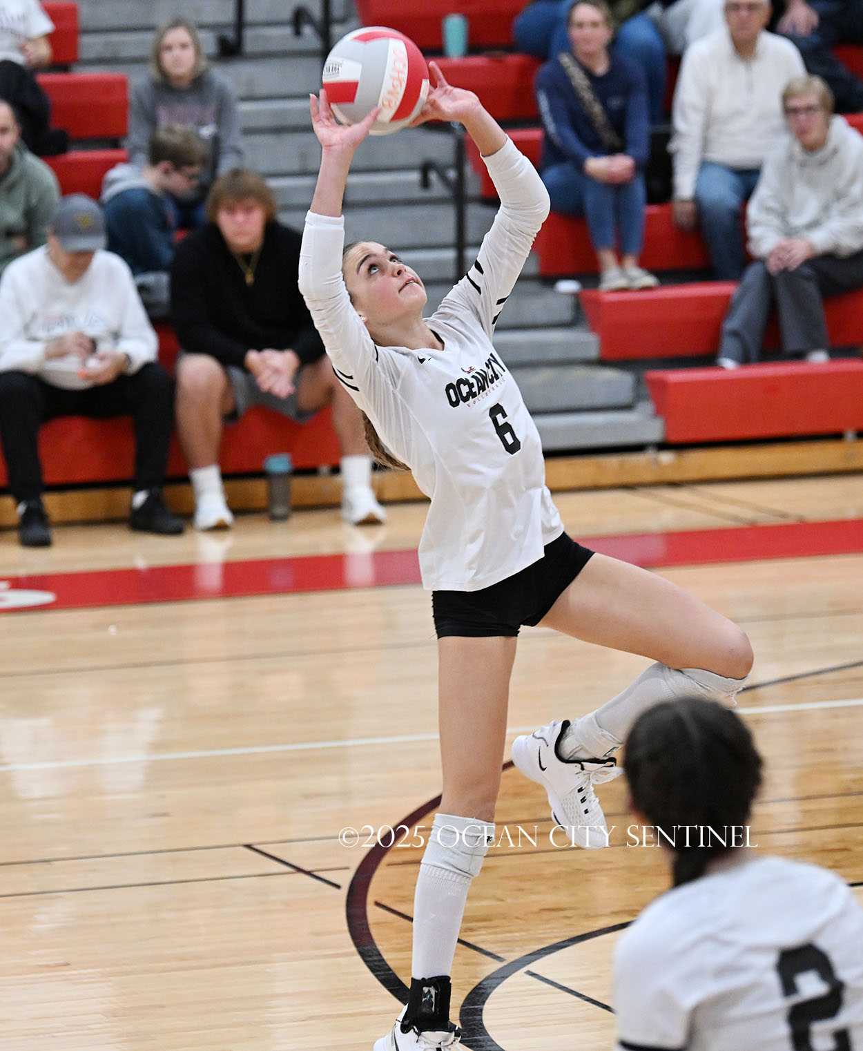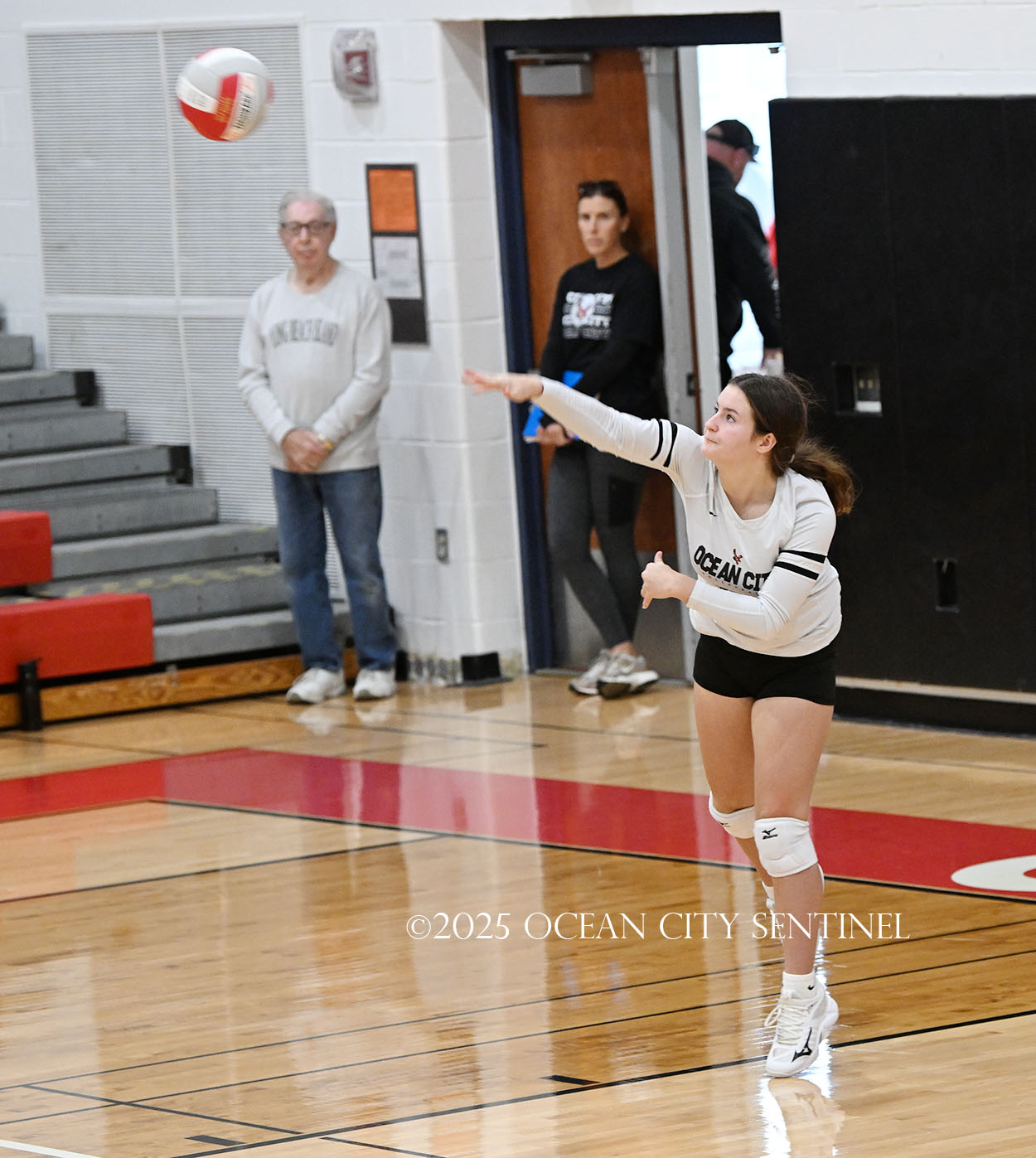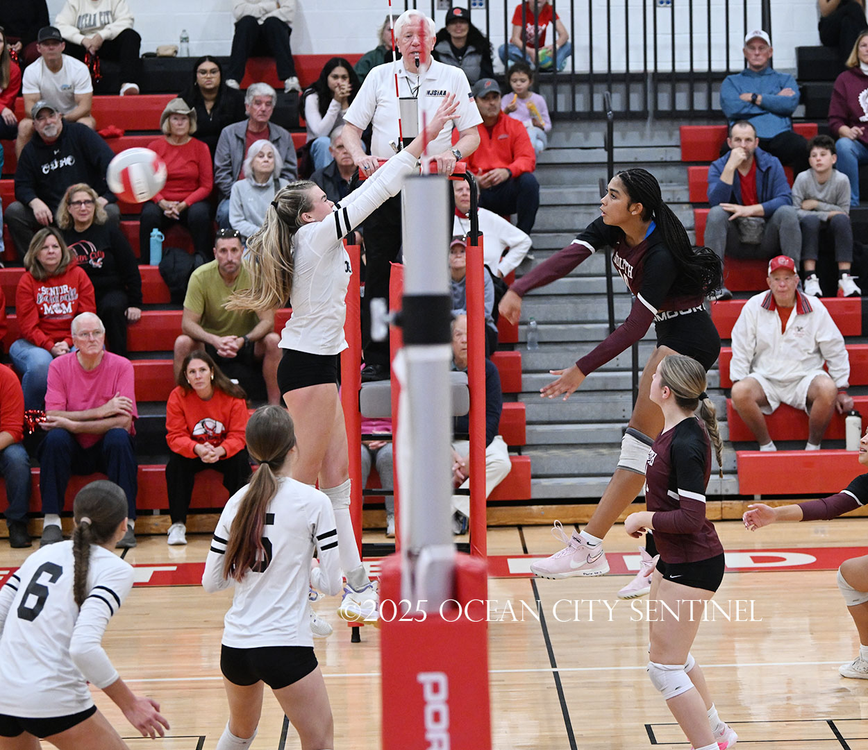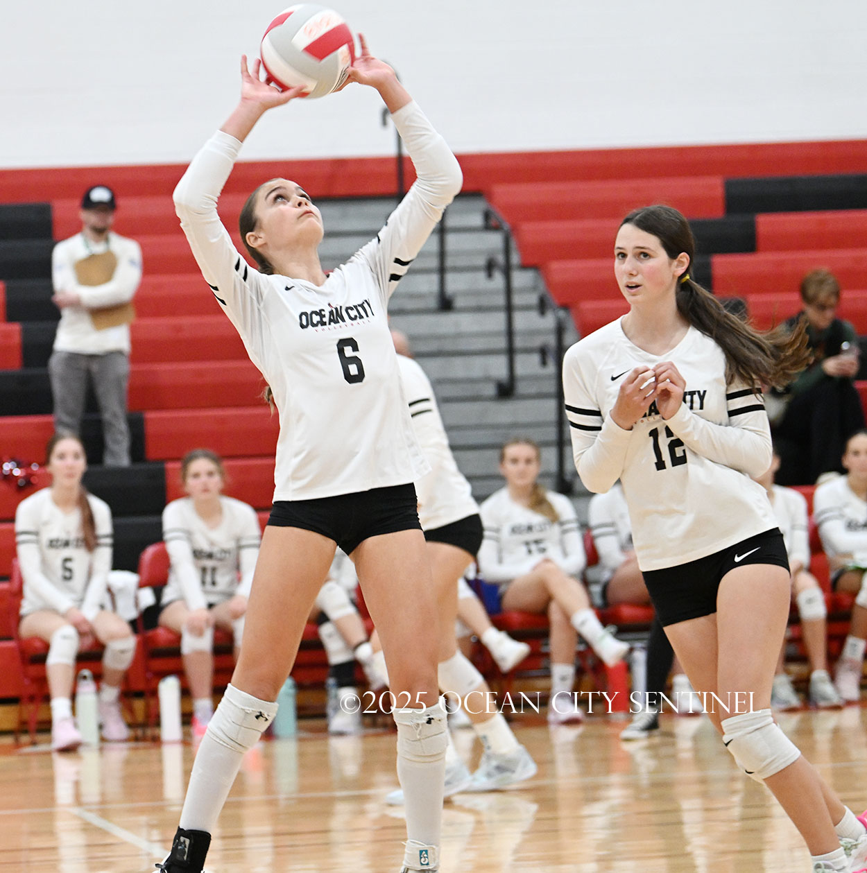 Toms River South started strong in the third set, leading early 6-2 before the Red Raiders tied at 6-6. Ocean City took the lead for good at 12-11. TRS got within a point later, 14-13, but Ocean City held at 22-18 and then got five set points at 24-19 before winning 25-19.
