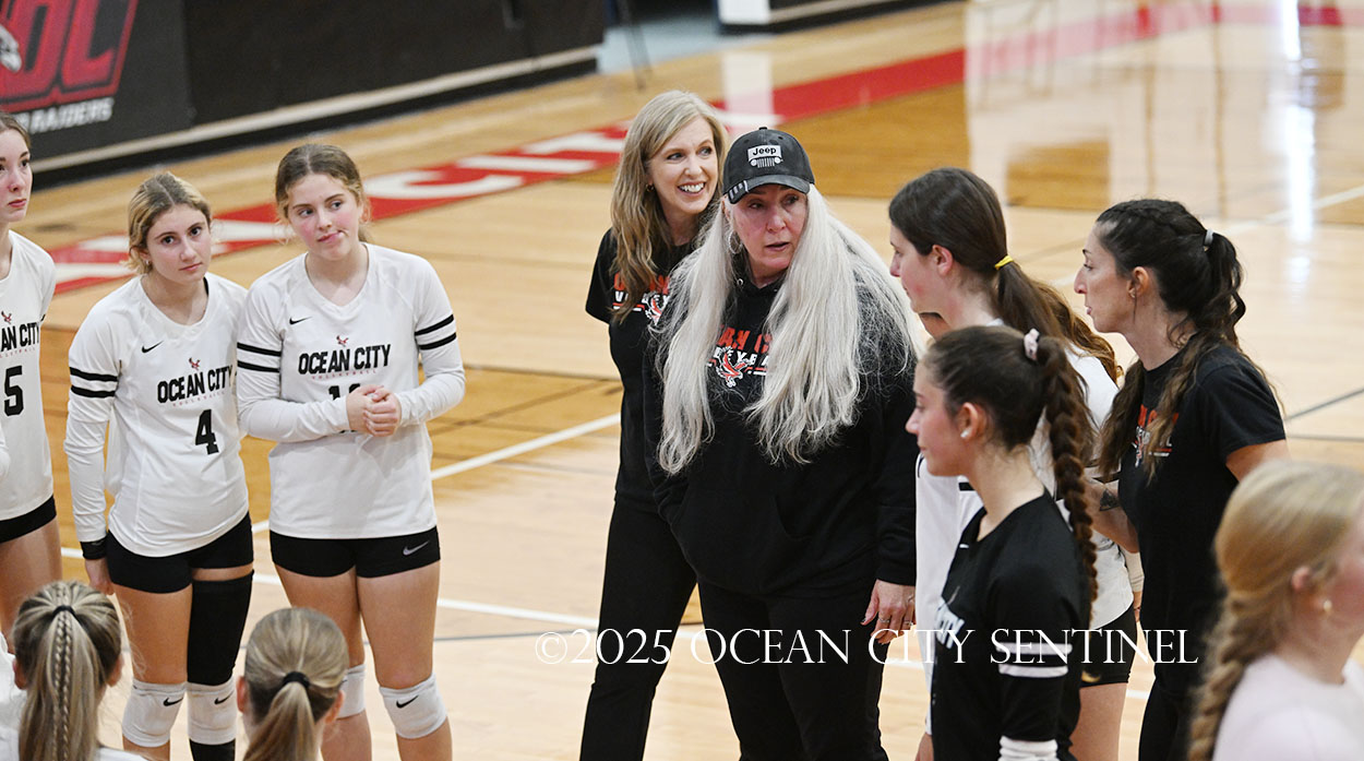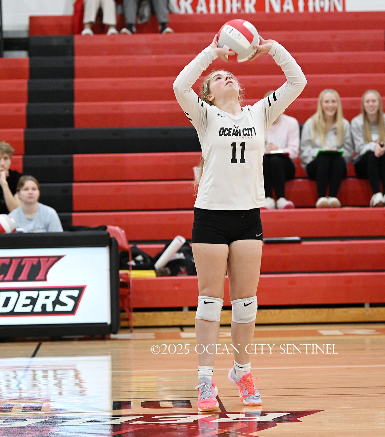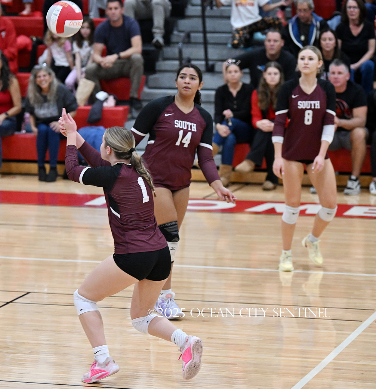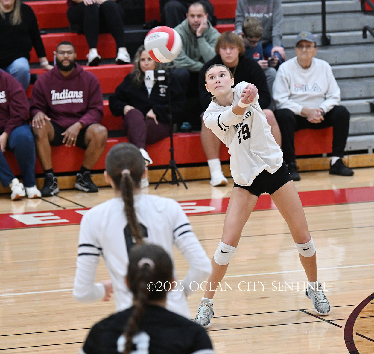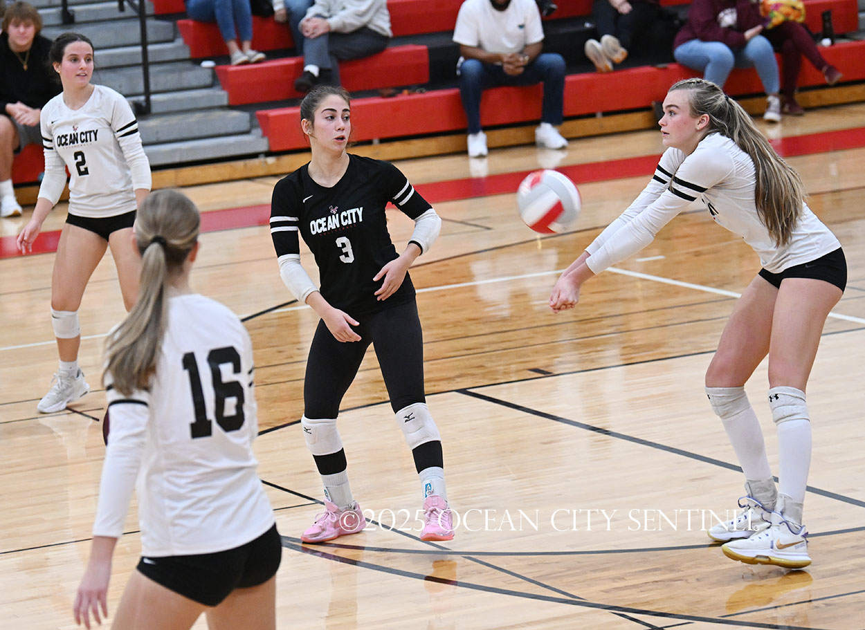 Toms River South started strong in the third set, leading early 6-2 before the Red Raiders tied at 6-6. Ocean City took the lead for good at 12-11. TRS got within a point later, 14-13, but Ocean City held at 22-18 and then got five set points at 24-19 before winning 25-19.