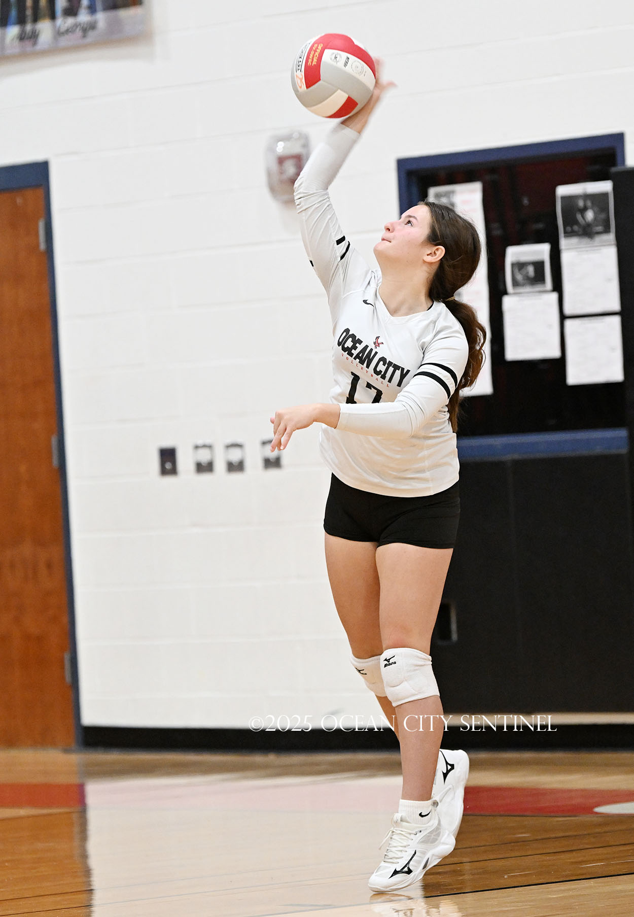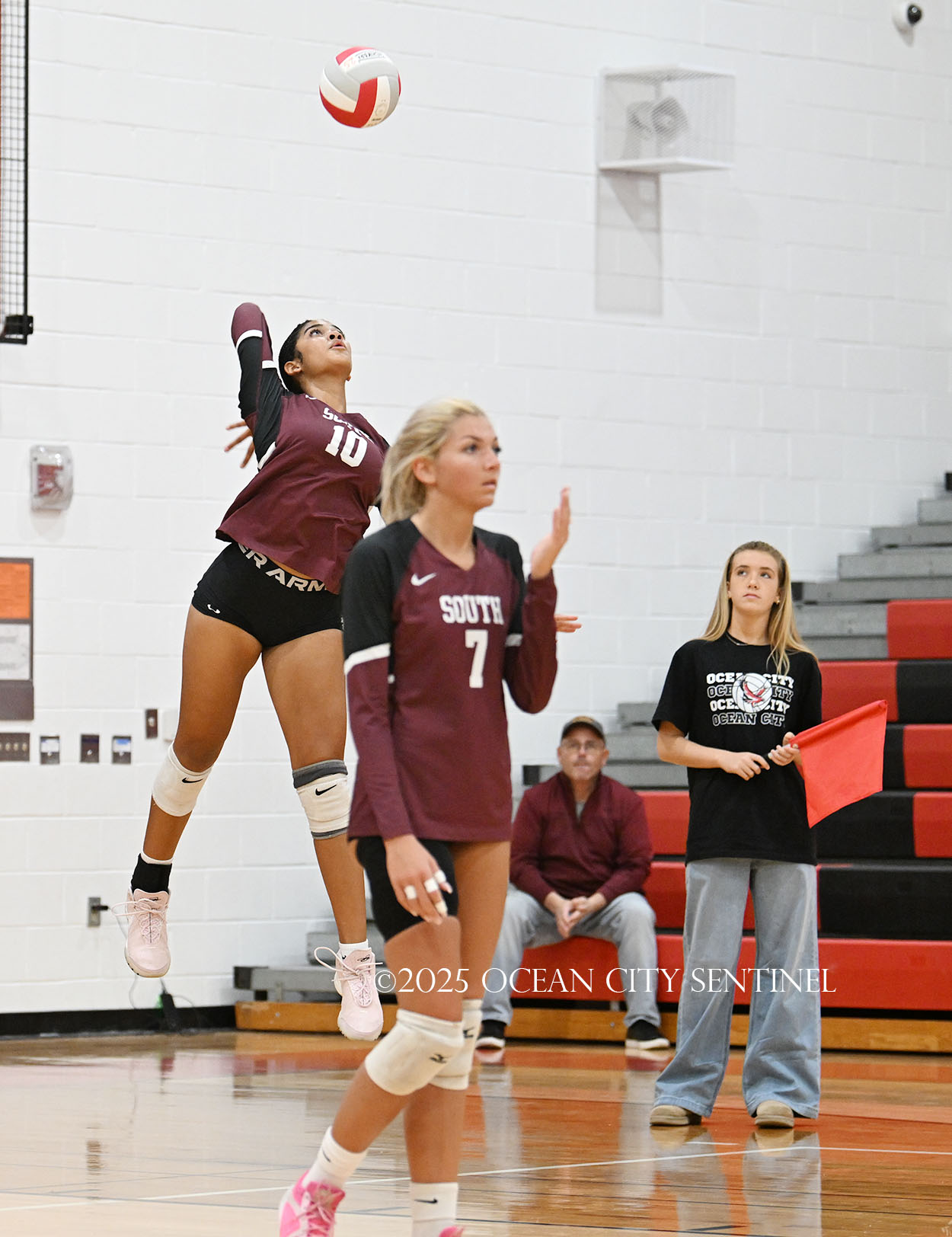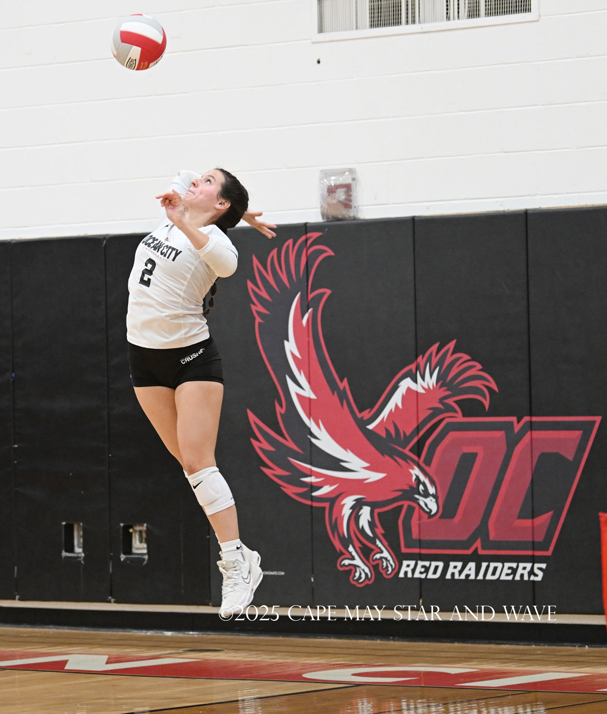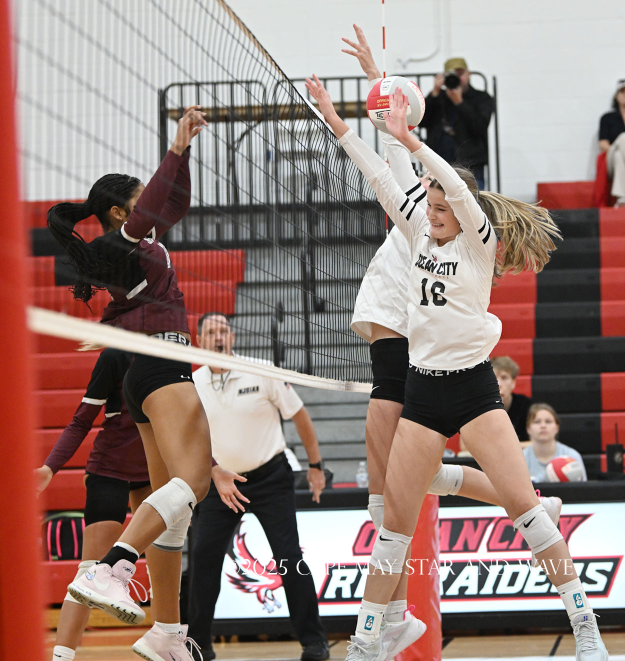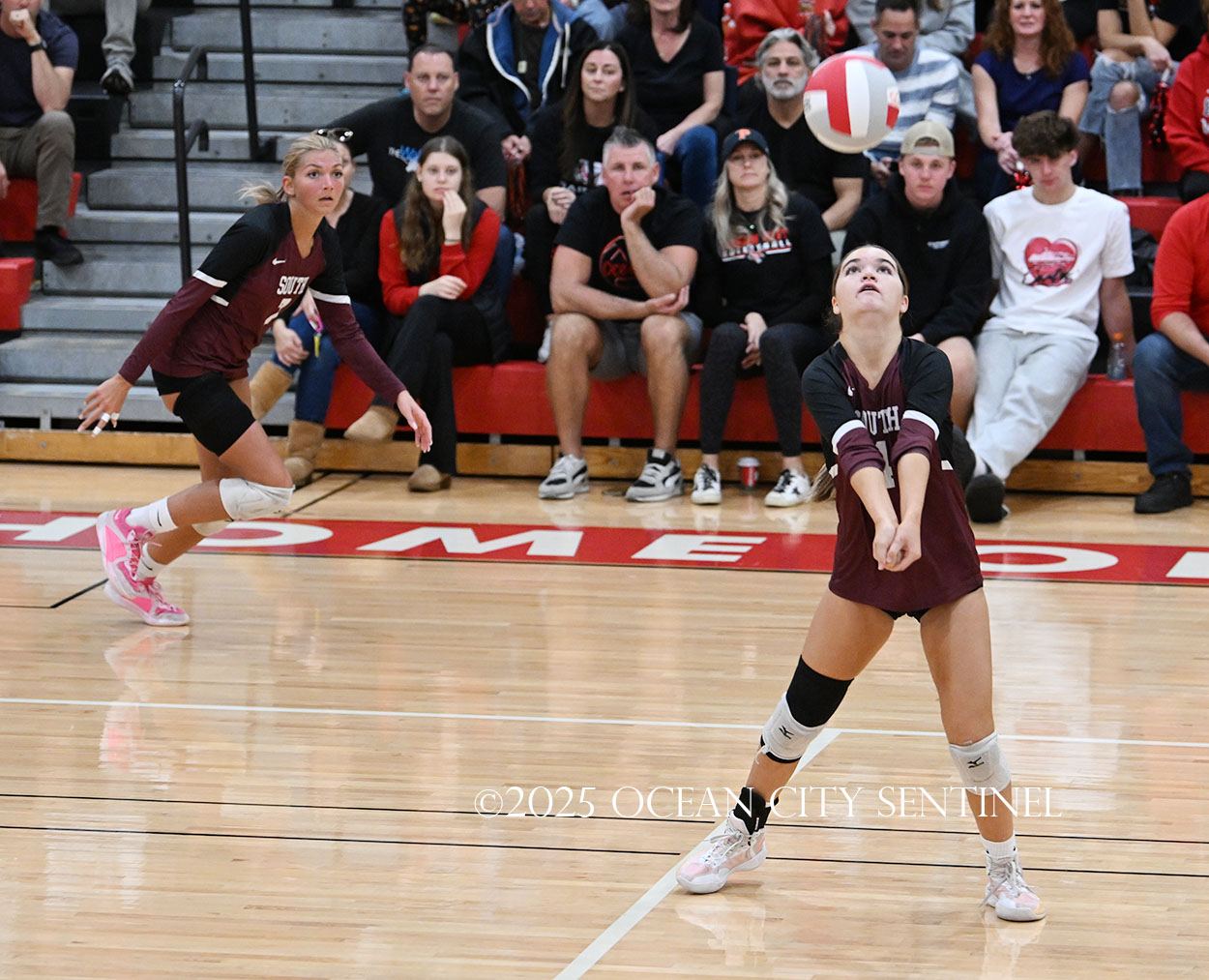 Toms River South started strong in the third set, leading early 6-2 before the Red Raiders tied at 6-6. Ocean City took the lead for good at 12-11. TRS got within a point later, 14-13, but Ocean City held at 22-18 and then got five set points at 24-19 before winning 25-19.