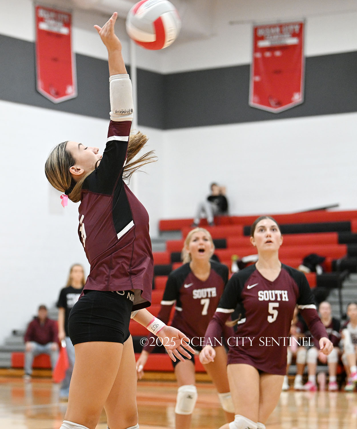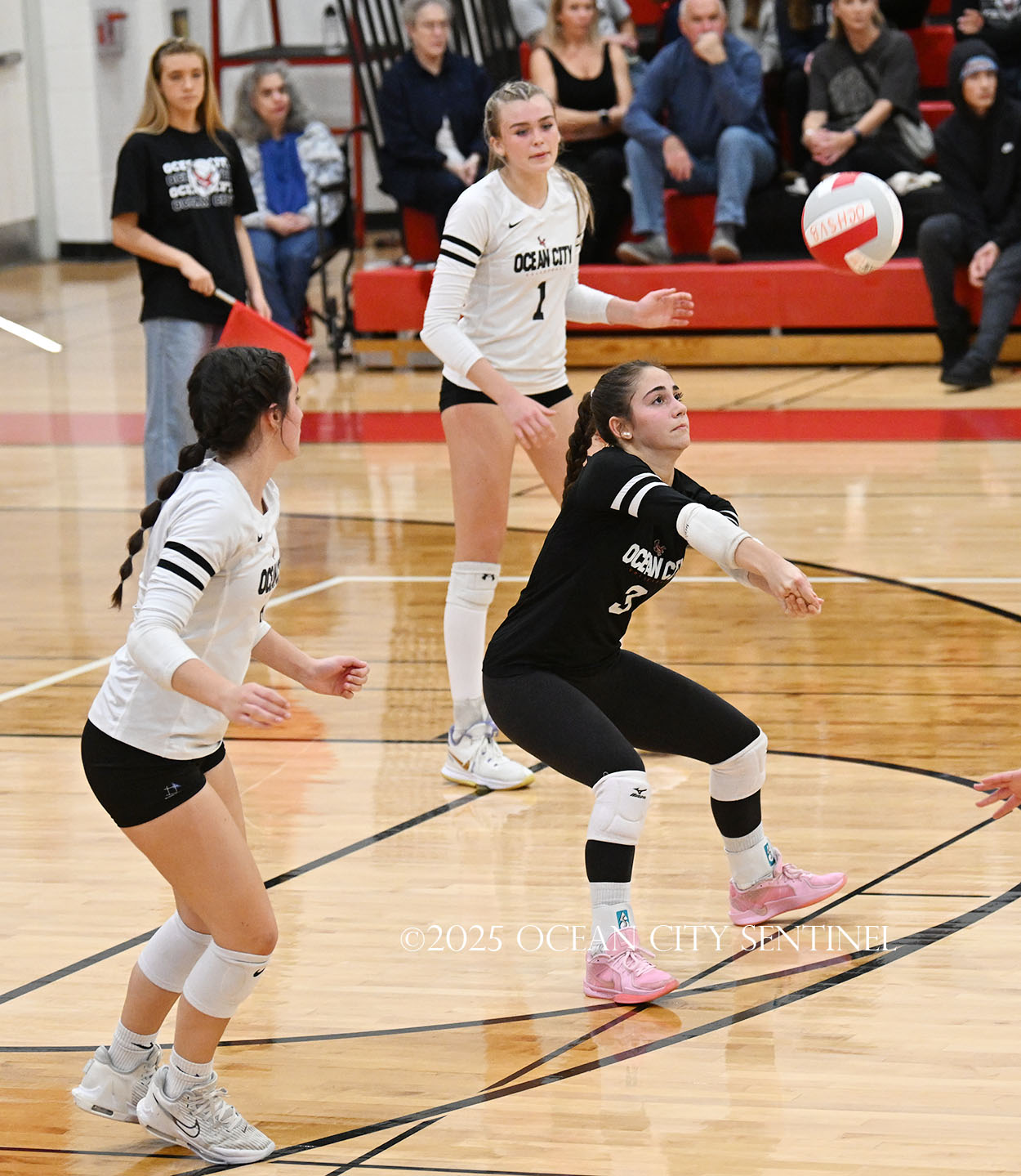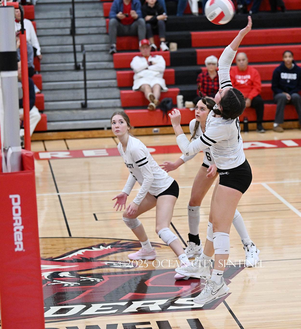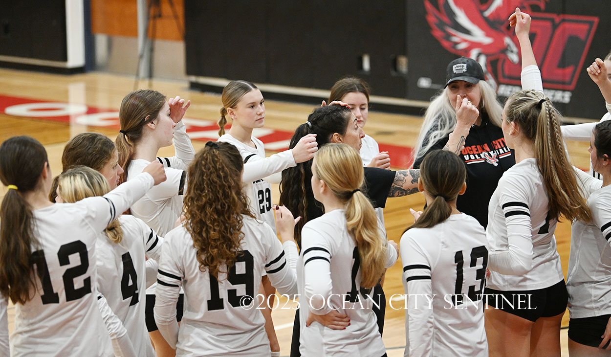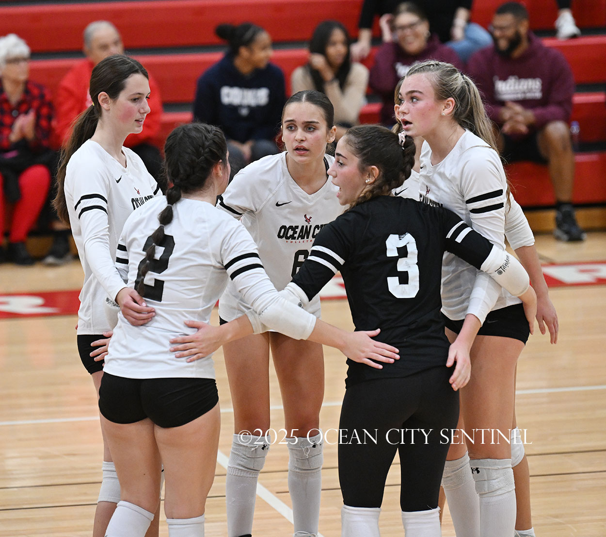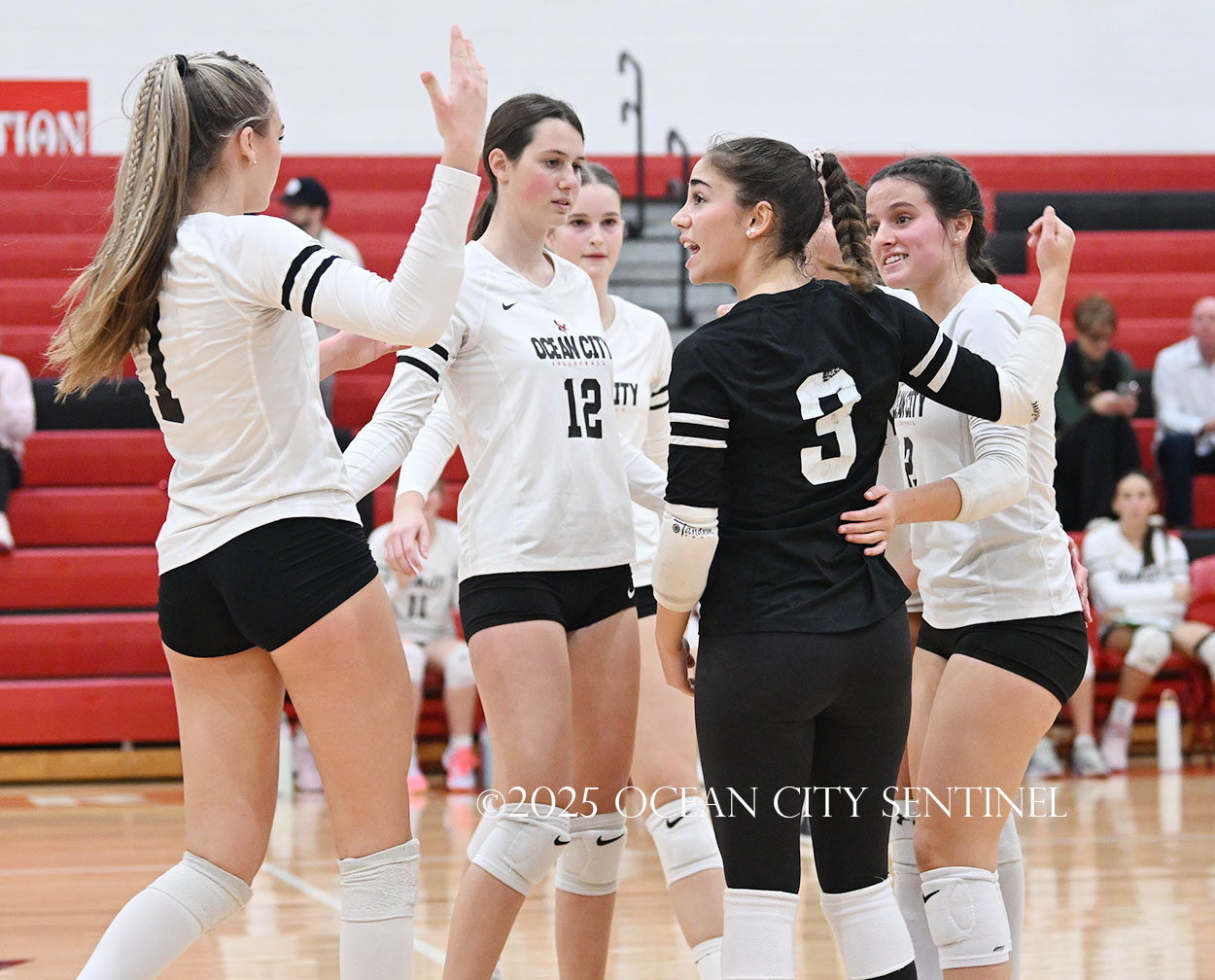 Toms River South started strong in the third set, leading early 6-2 before the Red Raiders tied at 6-6. Ocean City took the lead for good at 12-11. TRS got within a point later, 14-13, but Ocean City held at 22-18 and then got five set points at 24-19 before winning 25-19.