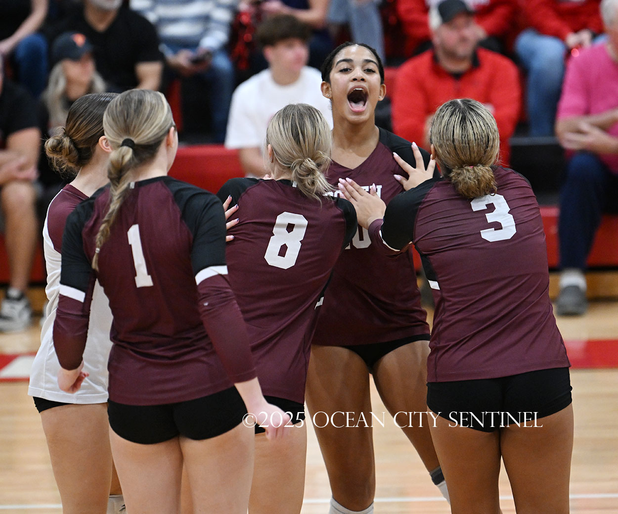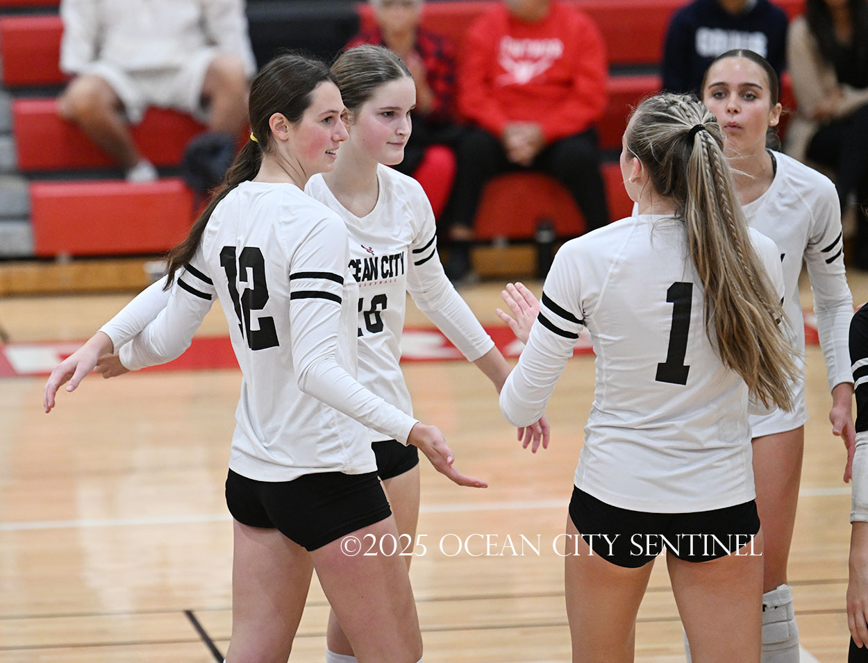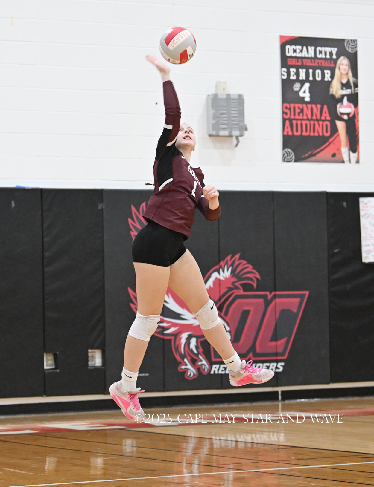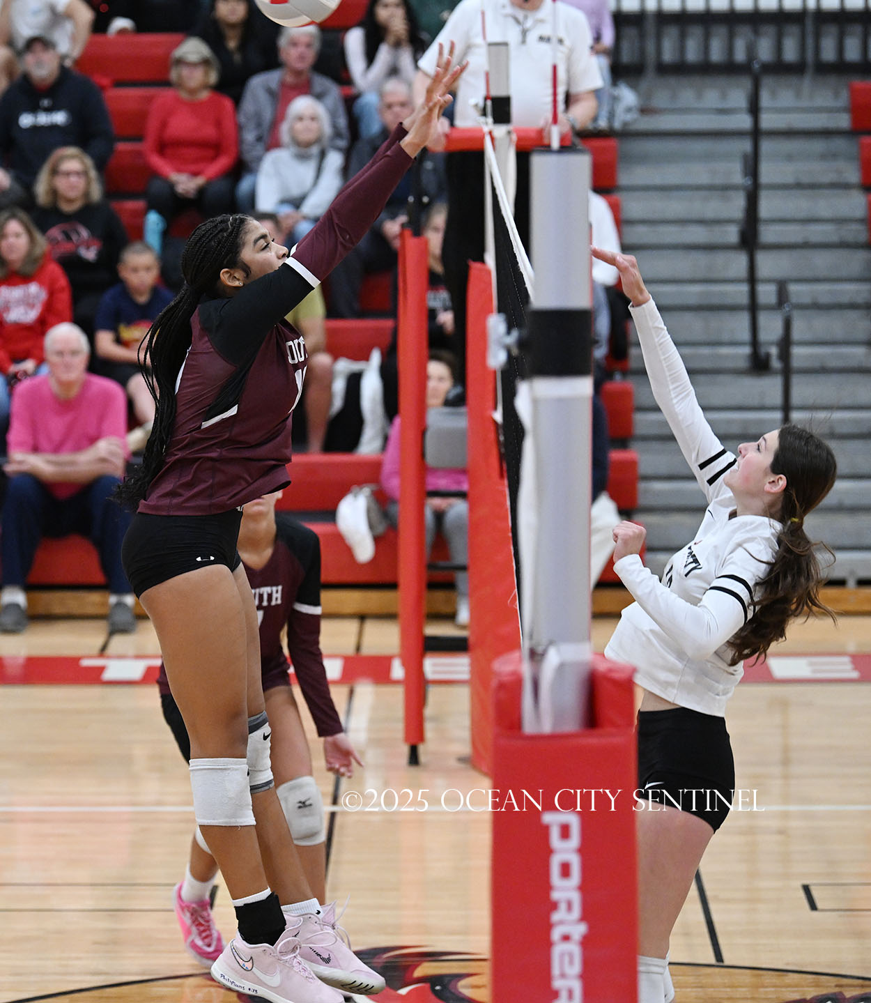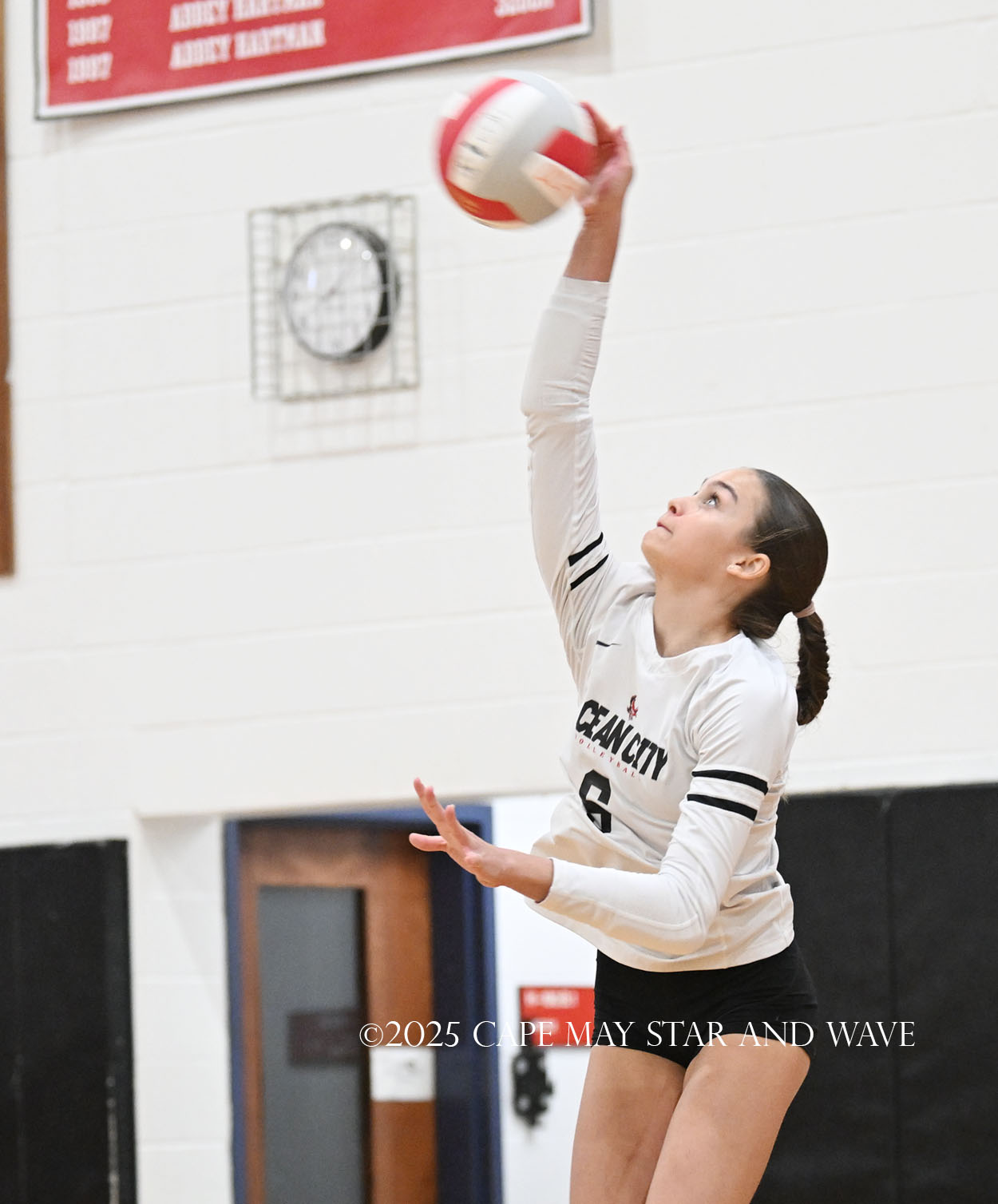 Toms River South started strong in the third set, leading early 6-2 before the Red Raiders tied at 6-6. Ocean City took the lead for good at 12-11. TRS got within a point later, 14-13, but Ocean City held at 22-18 and then got five set points at 24-19 before winning 25-19.
