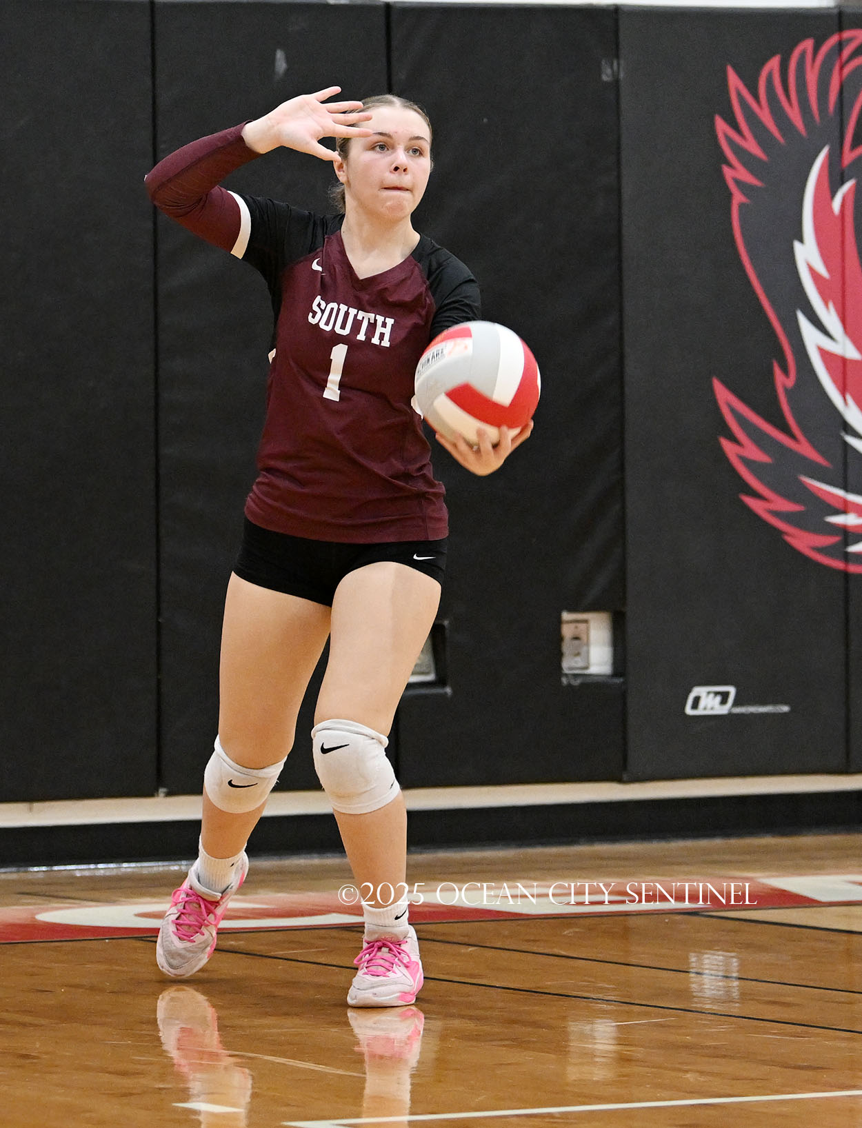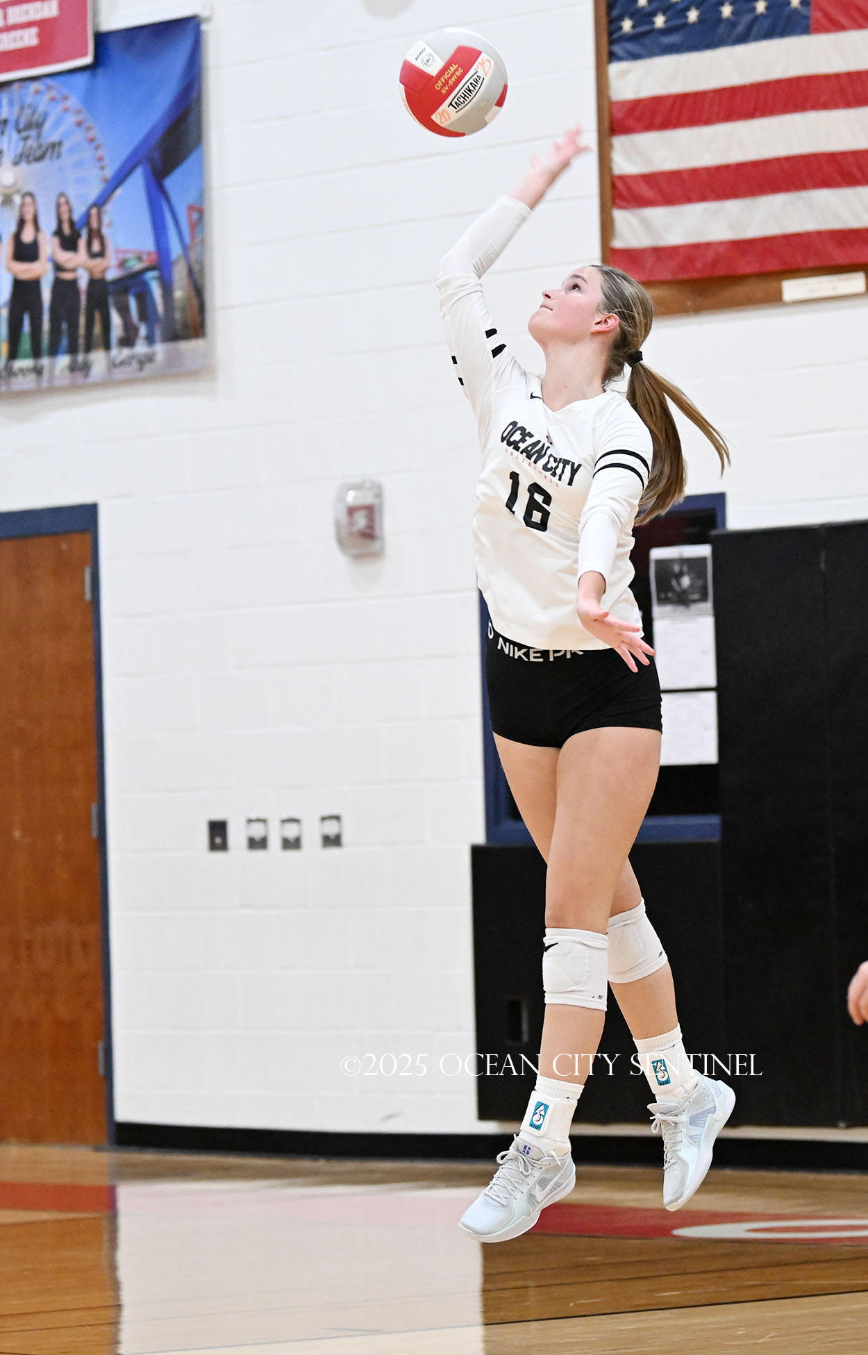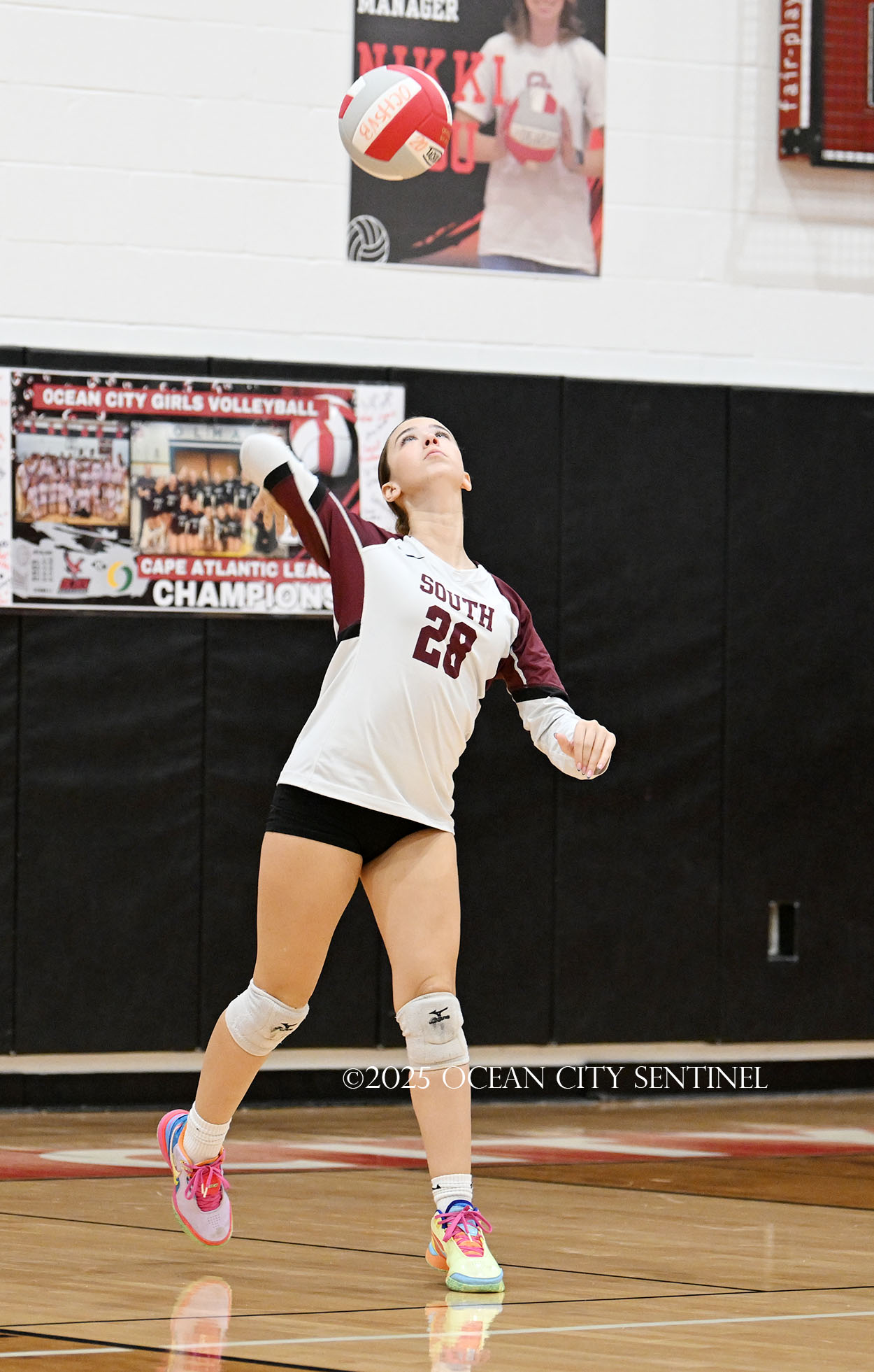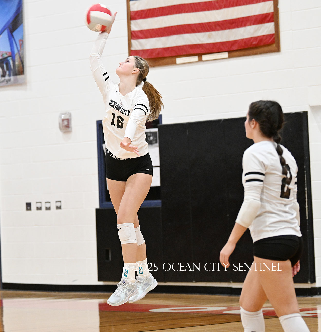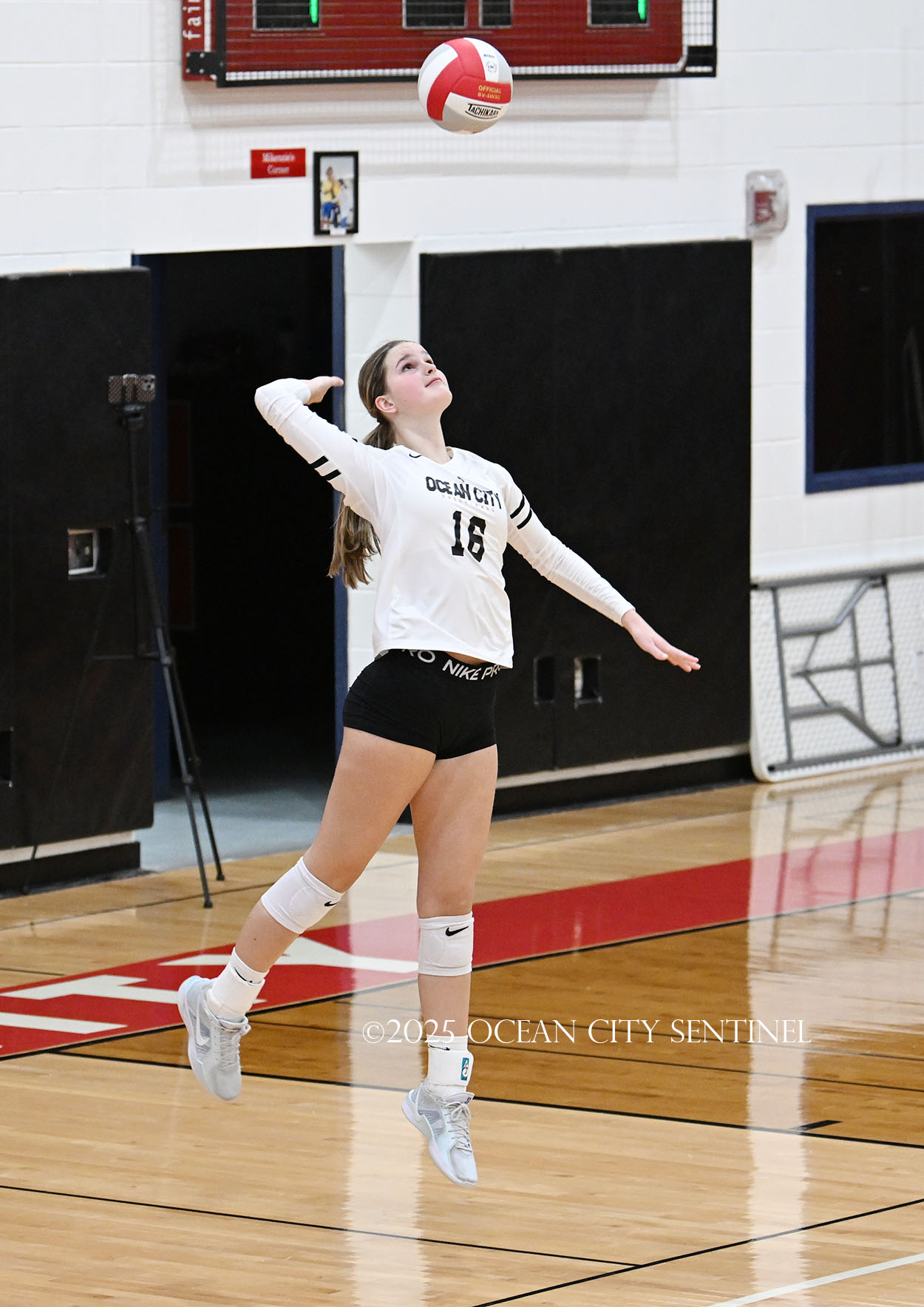 Toms River South started strong in the third set, leading early 6-2 before the Red Raiders tied at 6-6. Ocean City took the lead for good at 12-11. TRS got within a point later, 14-13, but Ocean City held at 22-18 and then got five set points at 24-19 before winning 25-19.