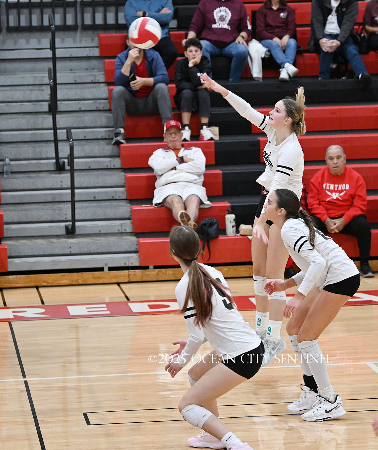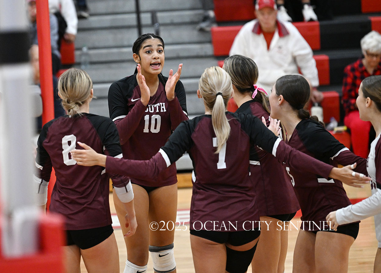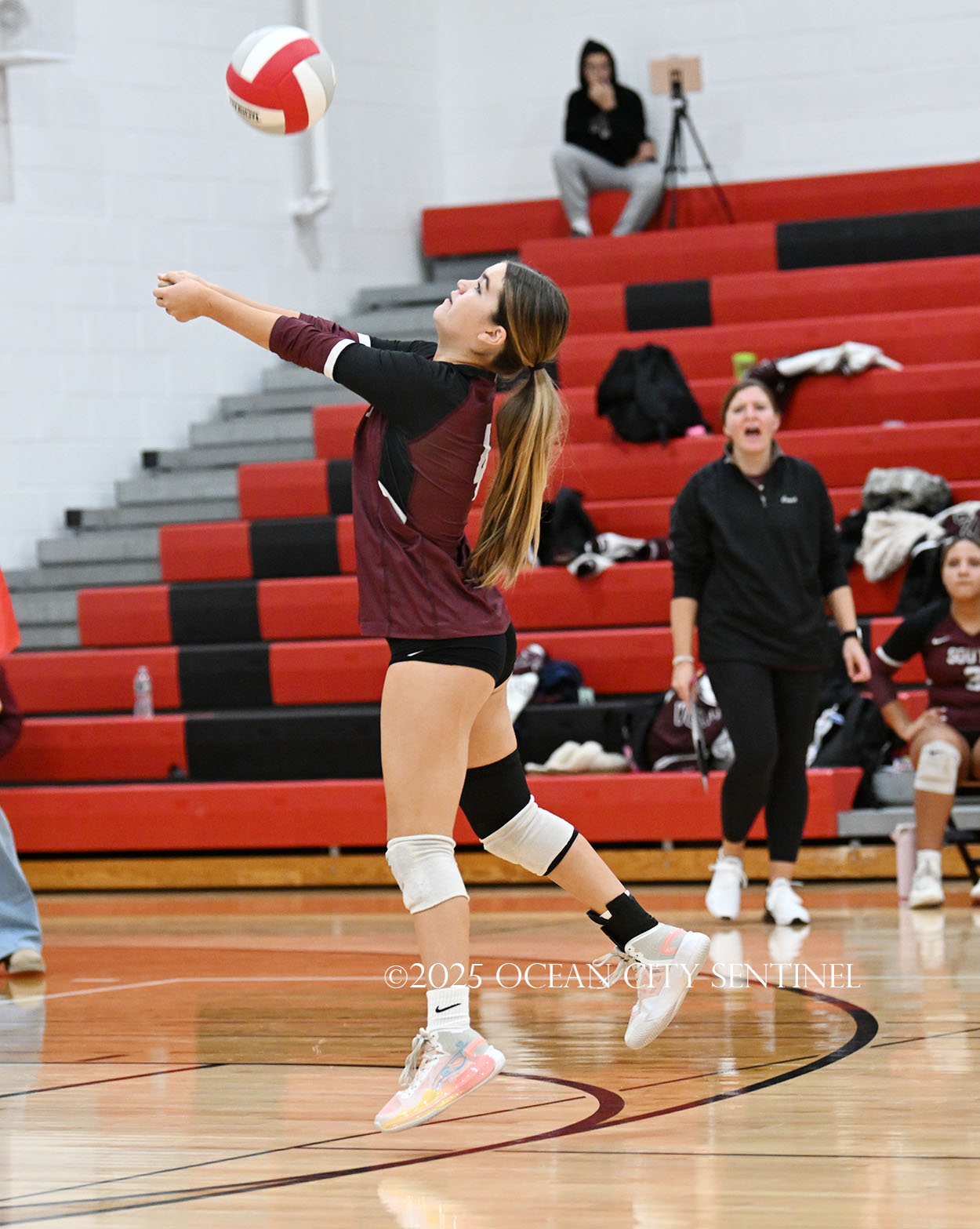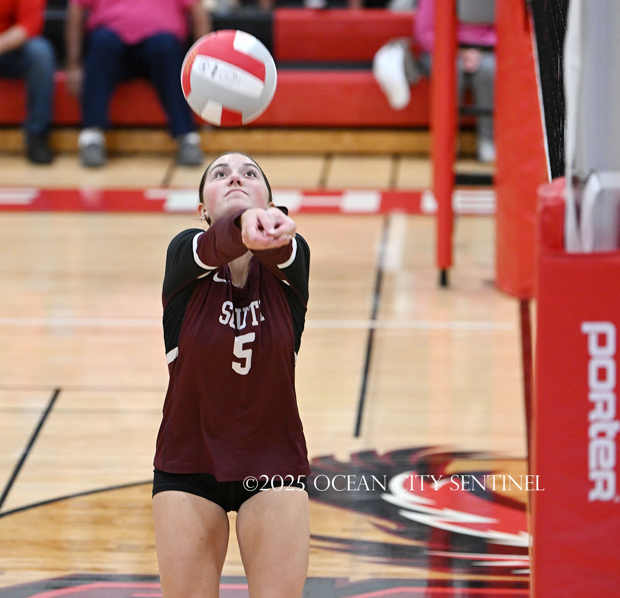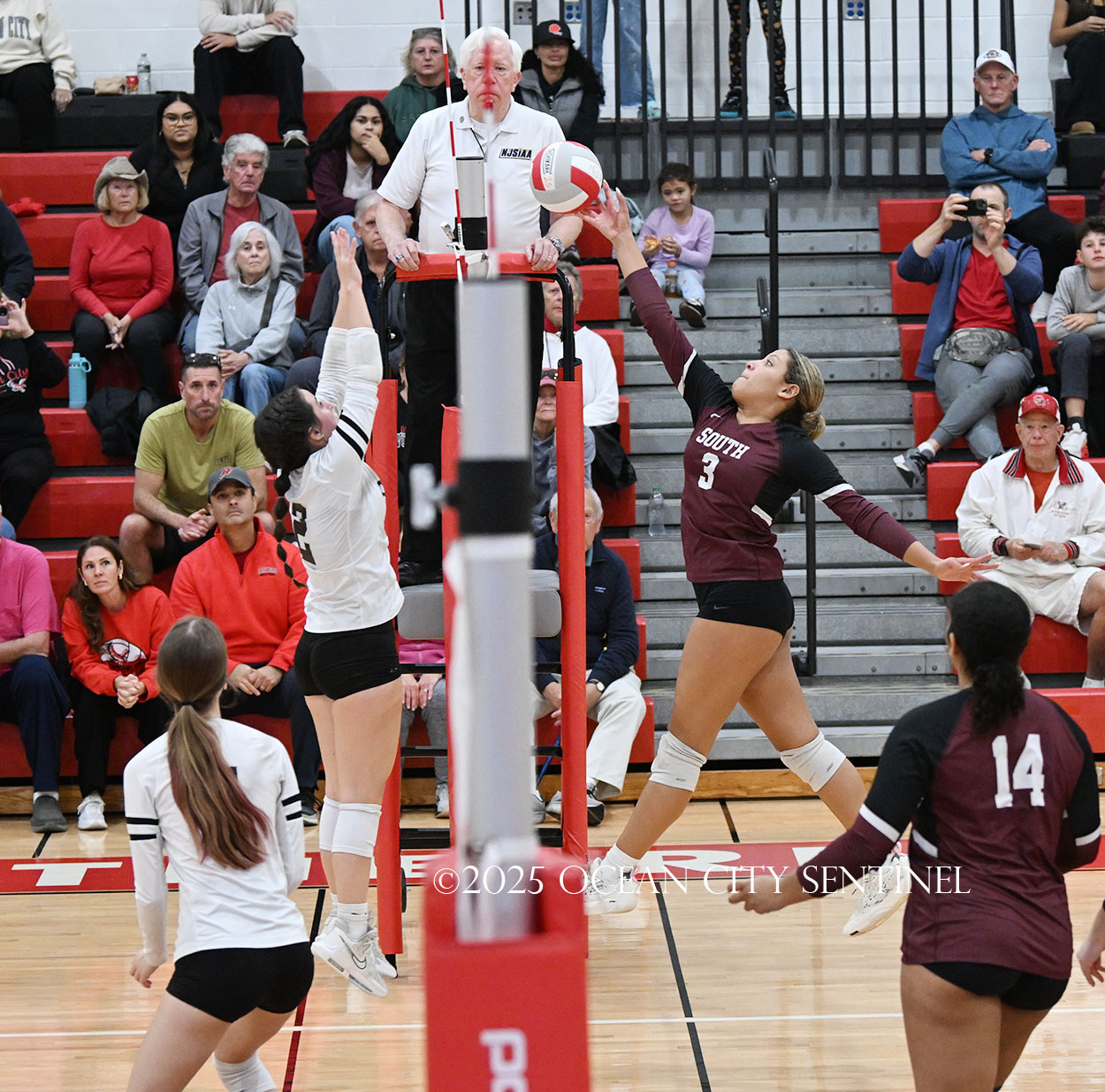 Toms River South started strong in the third set, leading early 6-2 before the Red Raiders tied at 6-6. Ocean City took the lead for good at 12-11. TRS got within a point later, 14-13, but Ocean City held at 22-18 and then got five set points at 24-19 before winning 25-19.