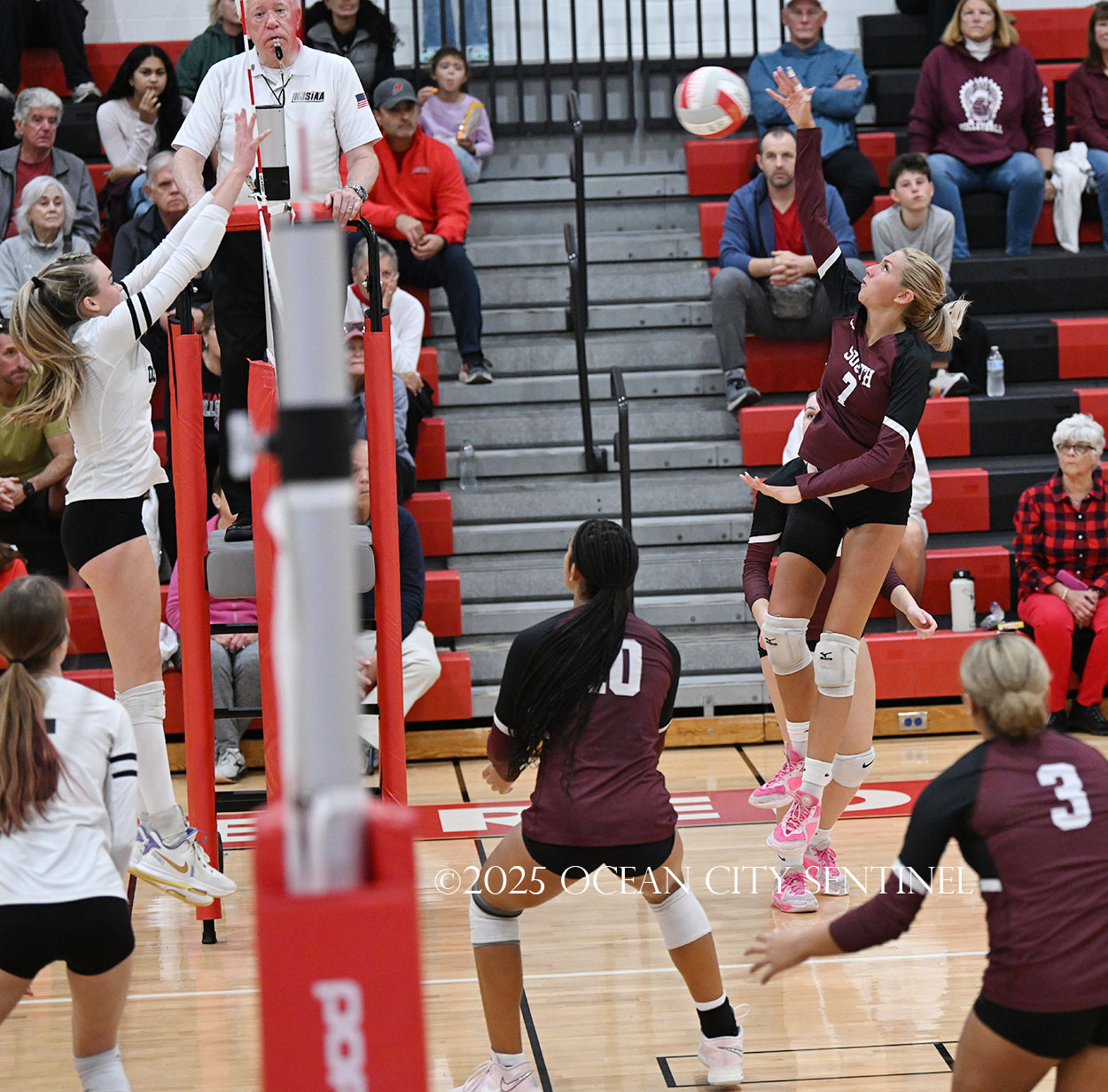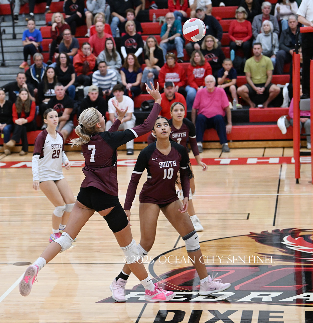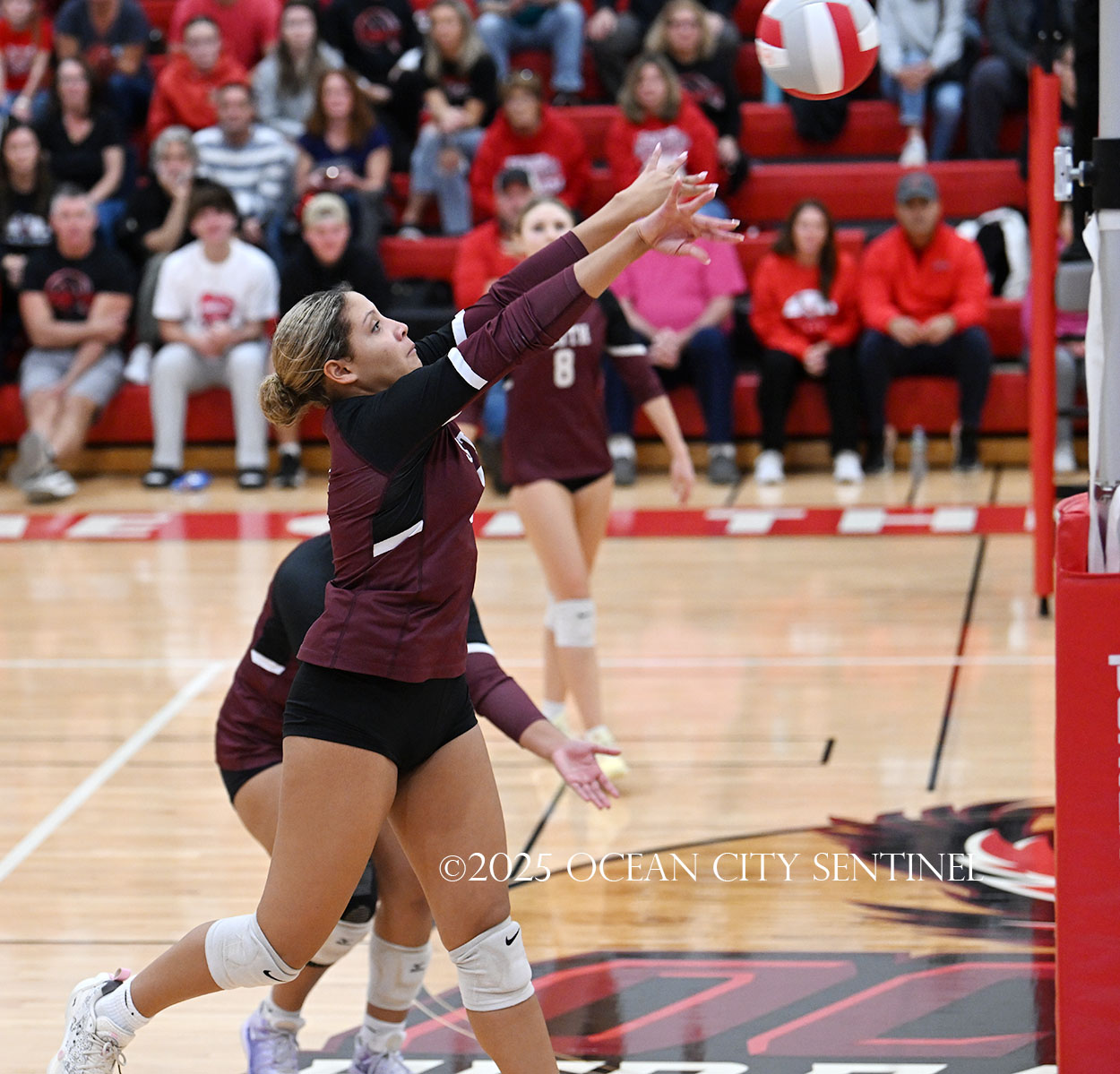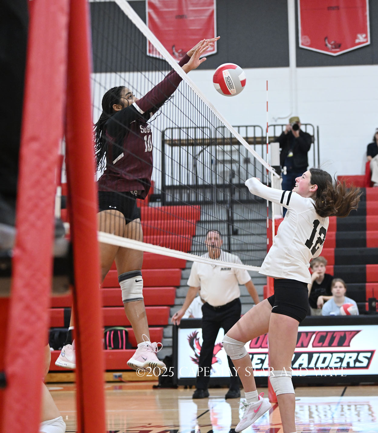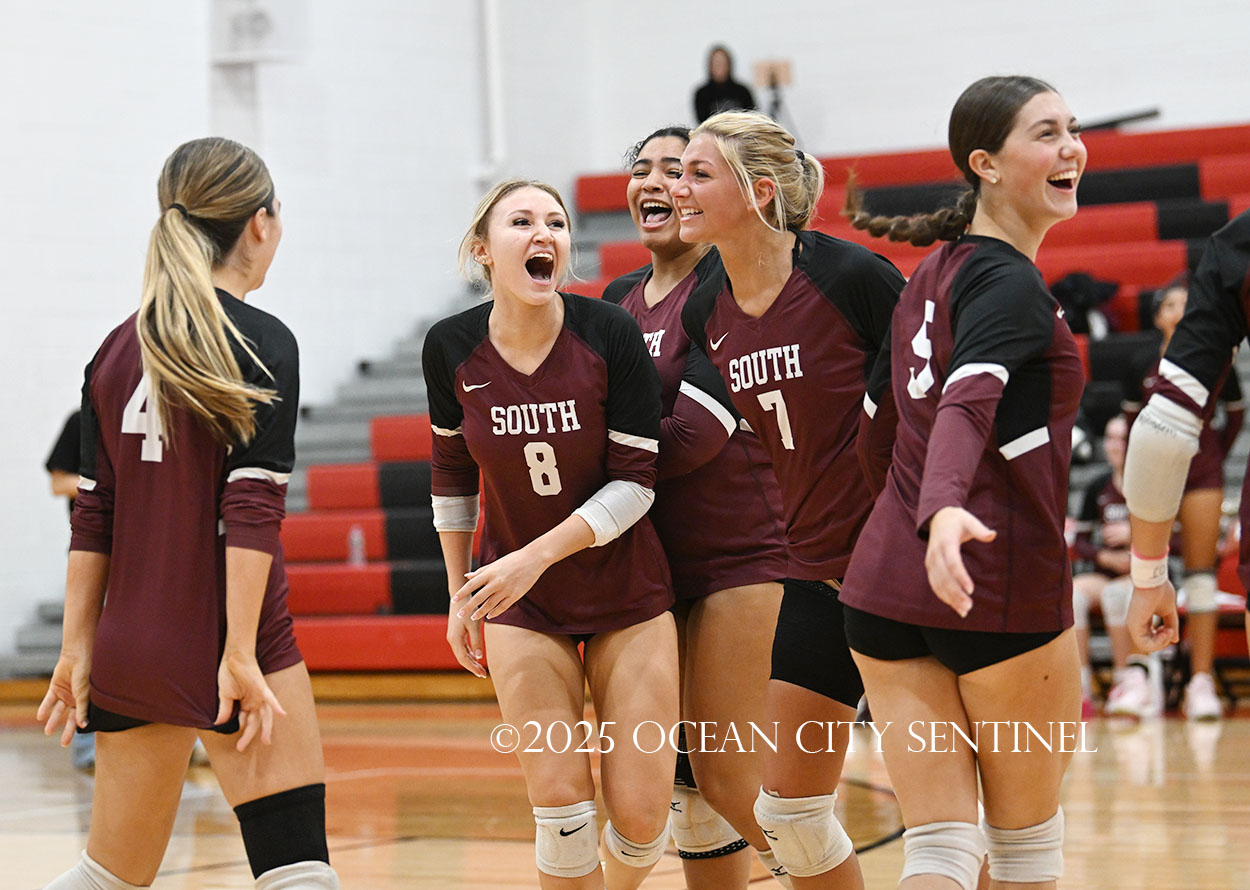 Toms River South started strong in the third set, leading early 6-2 before the Red Raiders tied at 6-6. Ocean City took the lead for good at 12-11. TRS got within a point later, 14-13, but Ocean City held at 22-18 and then got five set points at 24-19 before winning 25-19.