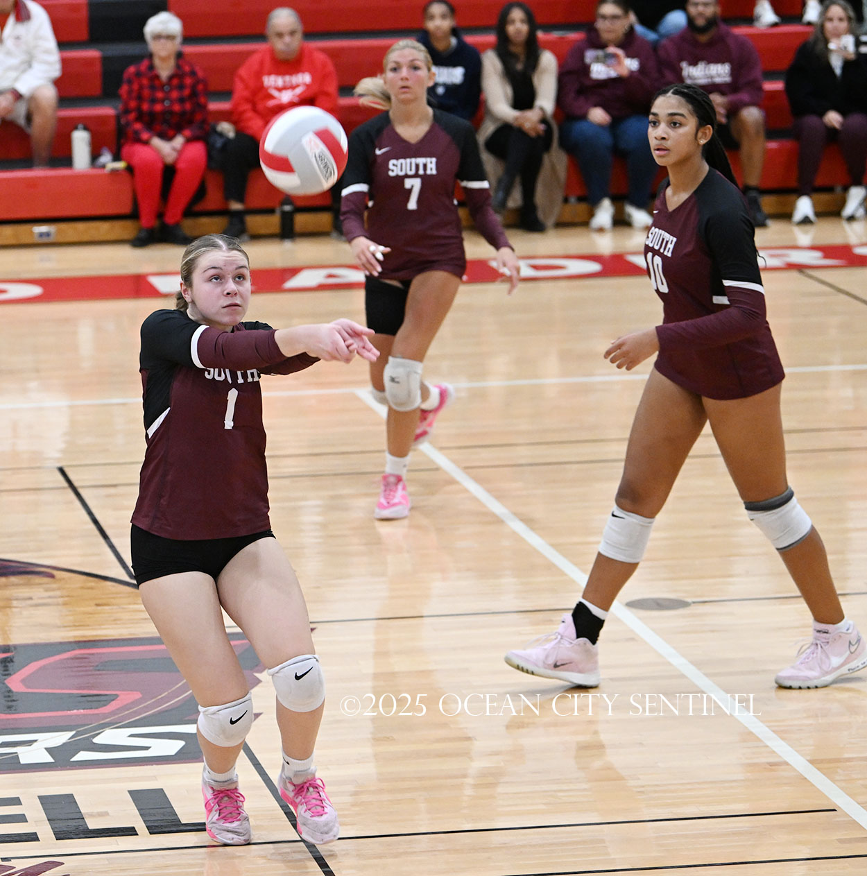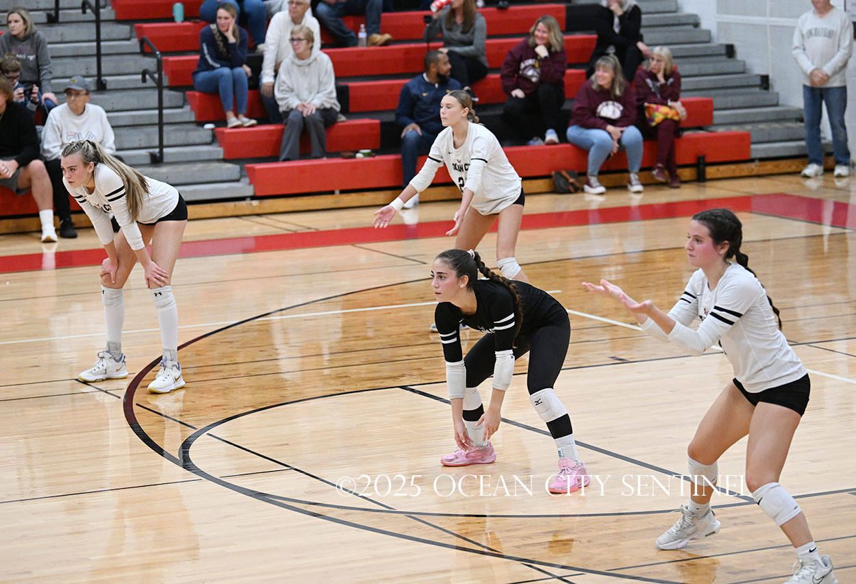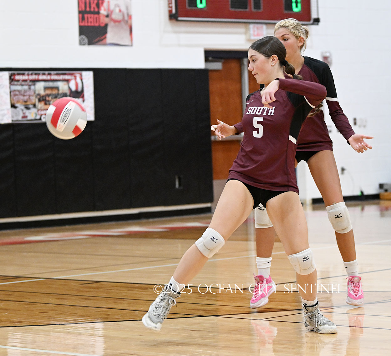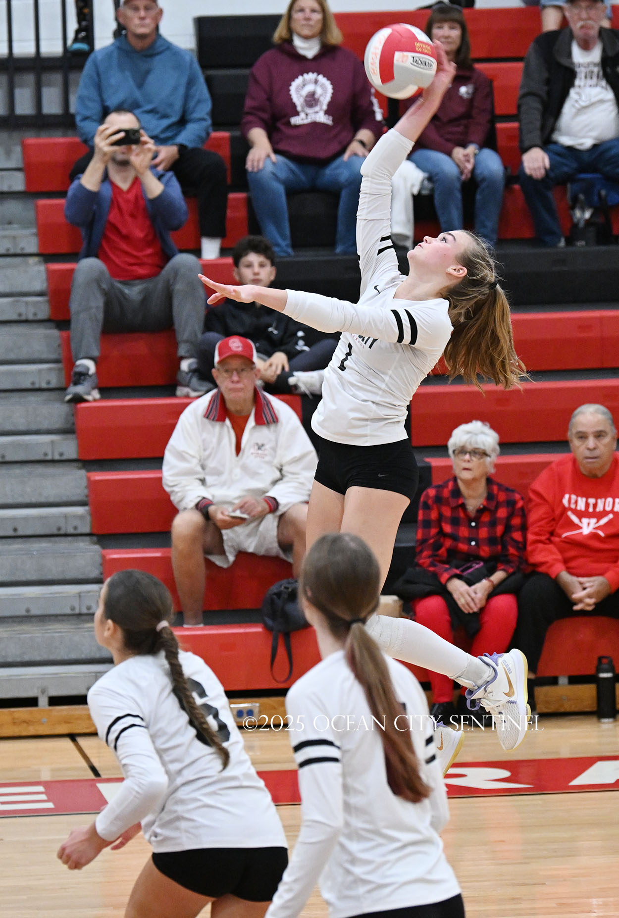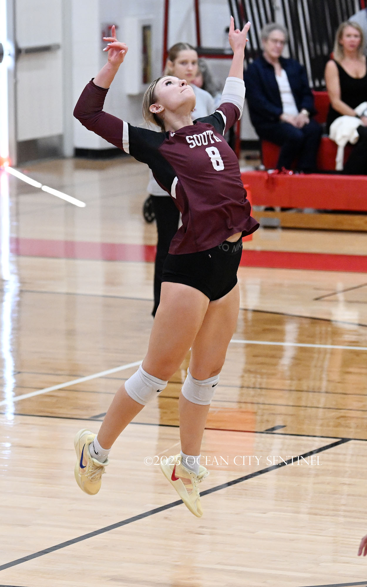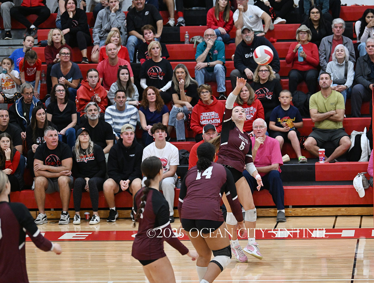 Toms River South started strong in the third set, leading early 6-2 before the Red Raiders tied at 6-6. Ocean City took the lead for good at 12-11. TRS got within a point later, 14-13, but Ocean City held at 22-18 and then got five set points at 24-19 before winning 25-19.