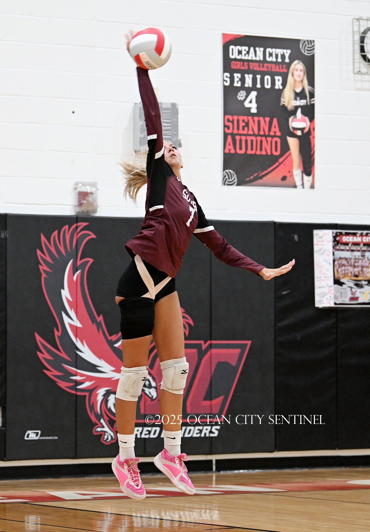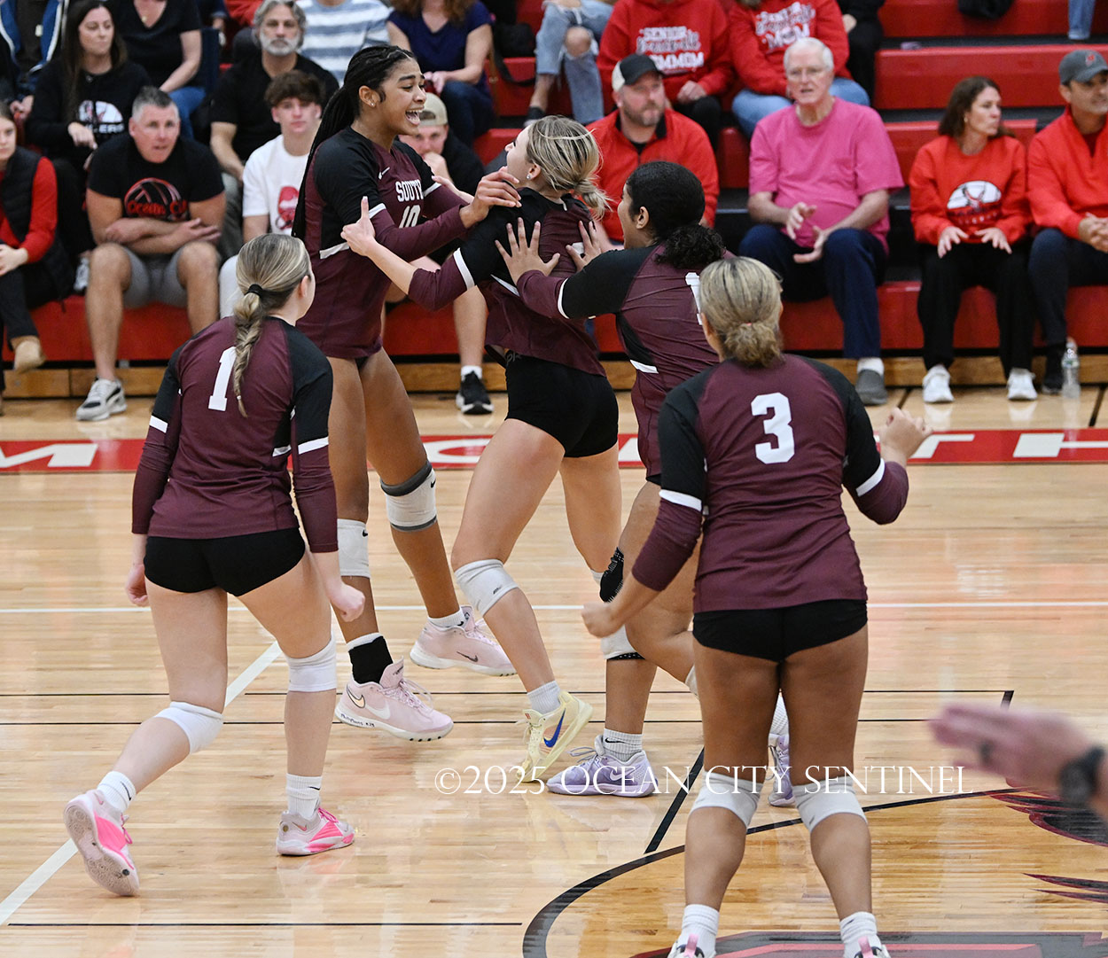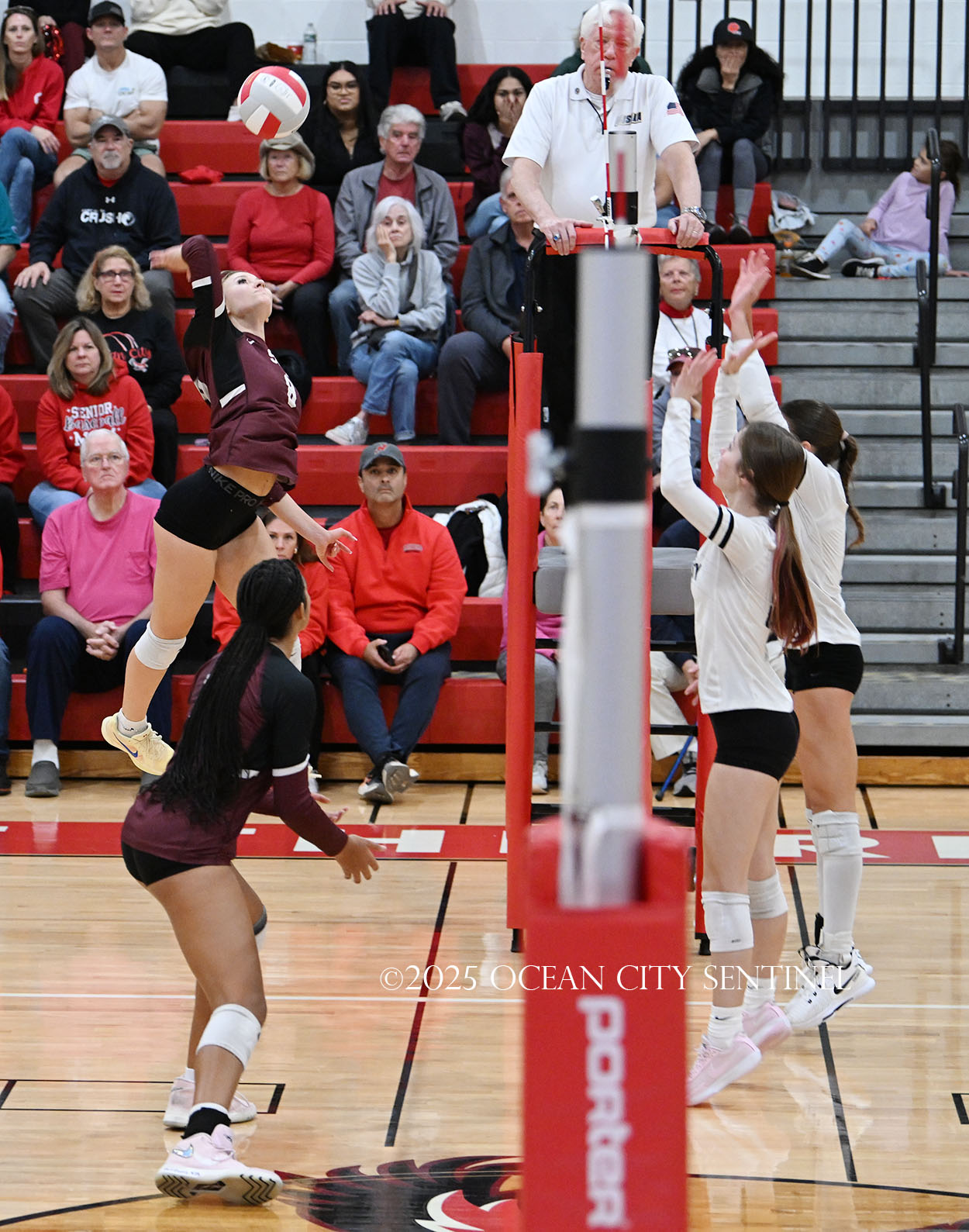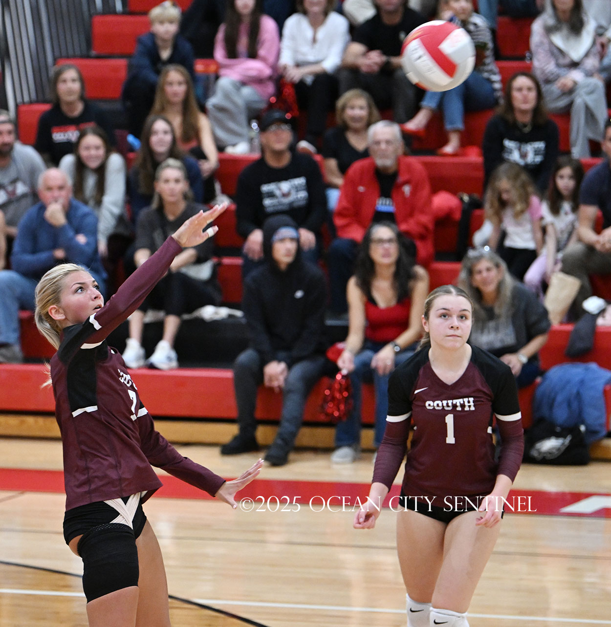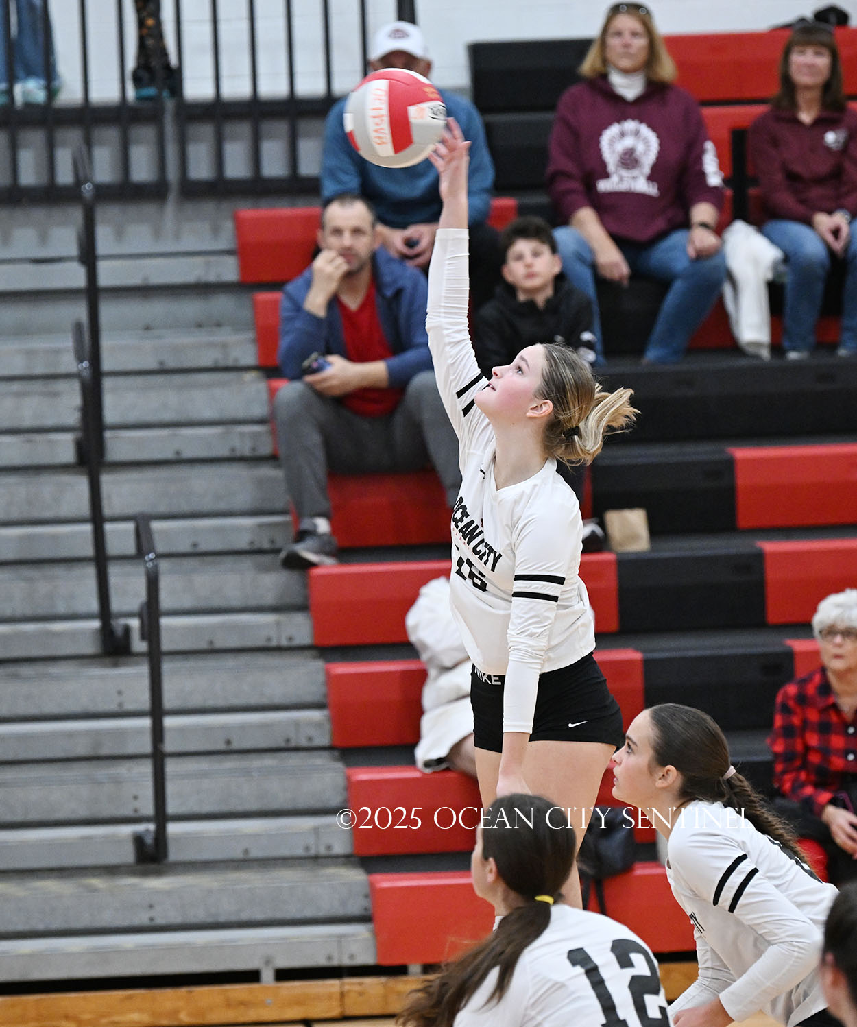 Toms River South started strong in the third set, leading early 6-2 before the Red Raiders tied at 6-6. Ocean City took the lead for good at 12-11. TRS got within a point later, 14-13, but Ocean City held at 22-18 and then got five set points at 24-19 before winning 25-19.
